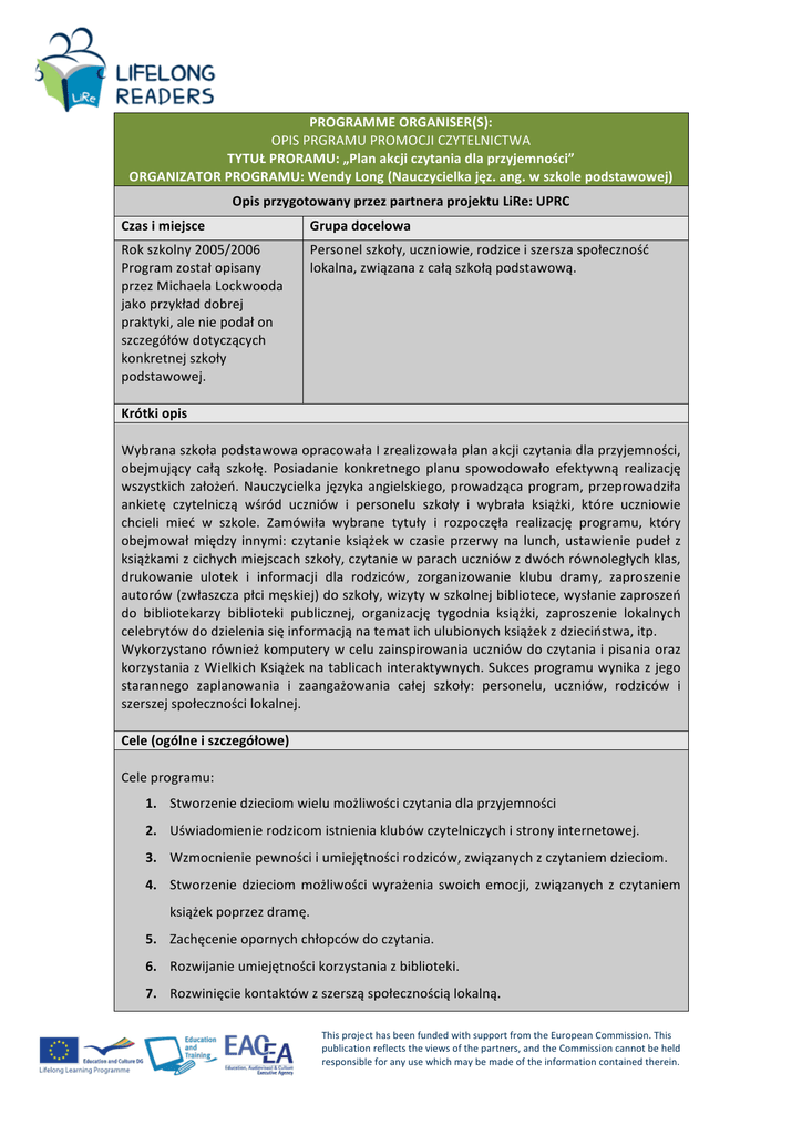 PROGRAMME ORGANISER(S): OPIS PRGRAMU PROMOCJI CZYTELNICTWA TYTUŁ PRORAMU: „Plan akcji czytania dla przyjemności” ORGANIZATOR PROGRAMU: Wendy Long (Nauczycielka jęz. ang. w szkole podstawowej) Opis przygotowany przez partnera projektu LiRe: UPRC Czas i miejsce Grupa docelowa Rok szkolny 2005/2006 Personel szkoły, uczniowie, rodzice i szersza społeczność Program został opisany lokalna, związana z całą szkołą podstawową. przez Michaela Lockwooda jako przykład dobrej praktyki, ale nie podał on szczegółów dotyczących konkretnej szkoły podstawowej. Krótki opis Wybrana szkoła podstawowa opracowała I zrealizowała plan akcji czytania dla przyjemności, obejmujący całą szkołę. Posiadanie konkretnego planu spowodowało efektywną realizację wszystkich założeń. Nauczycielka języka angielskiego, prowadząca program, przeprowadziła ankietę czytelniczą wśród uczniów i personelu szkoły i wybrała książki, które uczniowie chcieli mieć w szkole. Zamówiła wybrane tytuły i rozpoczęła realizację programu, który obejmował między innymi: czytanie książek w czasie przerwy na lunch, ustawienie pudeł z książkami z cichych miejscach szkoły, czytanie w parach uczniów z dwóch równoległych klas, drukowanie ulotek i informacji dla rodziców, zorganizowanie klubu dramy, zaproszenie autorów (zwłaszcza płci męskiej) do szkoły, wizyty w szkolnej bibliotece, wysłanie zaproszeń do bibliotekarzy biblioteki publicznej, organizację tygodnia książki, zaproszenie lokalnych celebrytów do dzielenia się informacją na temat ich ulubionych książek z dzieciństwa, itp. Wykorzystano również komputery w celu zainspirowania uczniów do czytania i pisania oraz korzystania z Wielkich Książek na tablicach interaktywnych. Sukces programu wynika z jego starannego zaplanowania i zaangażowania całej szkoły: personelu, uczniów, rodziców i szerszej społeczności lokalnej. Cele (ogólne i szczegółowe) Cele programu: 1. Stworzenie dzieciom wielu możliwości czytania dla przyjemności 2. Uświadomienie rodzicom istnienia klubów czytelniczych i strony internetowej. 3. Wzmocnienie pewności i umiejętności rodziców, związanych z czytaniem dzieciom. 4. Stworzenie dzieciom możliwości wyrażenia swoich emocji, związanych z czytaniem książek poprzez dramę. 5. Zachęcenie opornych chłopców do czytania. 6. Rozwijanie umiejętności korzystania z biblioteki. 7. Rozwinięcie kontaktów z szerszą społecznością lokalną. This project has been funded with support from the European Commission. This publication reflects the views of the partners, and the Commission cannot be held responsible for any use which may be made of the information contained therein. 8. Zorganizowanie całotygodniowego wydarzenia w szkole, promującego czytelnictwo. Przebieg programu i działań promujących czytelnictwo Plan działania, przygotowany przez Wendy Long zgodnie z opisem Lockwooda (2008: 19-‐20): Cele Planowana akcja Czas Działanie Kryteria sukcesu (patrz powyżej 1. Kluby czytelnicze podczas Od Nauczyciele Wszystkie dzieci ze przerwy na lunch semestru nadzorują szkoły uczestniczą w jesiennego działalność podjętych klubów działaniach Ustawienie pudeł z Pudła na książki książkami z cichych miejscach szkoły Czytanie w parach uczniów z dwóch równoległych klas Harmonogram zajęć Wypożyczanie książek przez uczniów z biblioteki szkolnej 2. & 3. Ulotka “Wspomóż swoje Do dziecko w czytaniu” listopada 2005 Kopiowanie i rozdawanie ulotek Ulotka “Zaufanie do książki” Kopiowanie i rozdawanie ulotek Zorganizowanie klubu książki Nauczyciele nadzorują działalność klubu Ulotki I informacje o klubach zwiększają zainteresowanie, wiedzę i zaangażowanie rodziców Rodzice poświęcają swój czas Rodzice włączają się w czytanie dzieciom 4. Klub dramy w czasie lunchu Od Nadzorowanie semestru działalności jesiennego klubu 5. Zaproszenie autorów (płci męskiej) do szkoły Semestr wiosenny Koszty książek Wykorzystanie filmów podczas lekcji literatury Koszty filmów Rozpropagowanie tekstów wśród szerszej Koszty spotkań Dzieci rozwijają swoje umiejętności wysławiania się i czytają dużo tekstów Chłopcy czytają dla przyjemności This project has been funded with support from the European Commission. This publication reflects the views of the partners, and the Commission cannot be held responsible for any use which may be made of the information contained therein. społeczności lokalnej 6. Nauczyciele asystują dzieciom podczas wizyt w bibliotece, starając się rozwijać umiejętności dzieci korzystania z zasobów biblioteki Na bieżąco Biblioteka 7. Bibliotekarze biblioteki publicznej odwiedzają szkołę Przez cały rok szkolny Wizyty bibliotekarzy, autorów I lokalnych celebrytów wiosna Koszty wizyt autorów i lokalnych celebrytów Autorzy i lokalni celebryci odwiedzają szkołę Rodzice słuchają, jak dzieci czytają Lokalne wycieczki 8. Tydzień książki Dzieci rozwijają umiejętności korzystania z zasobów biblioteki i nabierają pewności siebie Co najmniej trzykrotnie przedstawiciele środowiska lokalnego odwiedzają szkołę I Koszty związane motywują dzieci do z wizytami czytania książek Czas poświęcony przez rodziców Tydzień książki zorganizowany z entuzjazmem I zaangażowaniem wszystkich Czas poświęcony uczestników organizacji programu czytaniem wydarzenia dla przyjemności Rezultaty / Uzasadnienie skuteczności programu • Wszystkie pozytywne rezultaty zostały wymienione w tabeli WNIOSKI (CO PRZEBIEGŁO PRAWIDŁOWO I DLACZEGO) • • Sukces programu wynikał z jego starannego zaplanowania, zaangażowania całej szkoły i stworzenia kultury czytania w środowisku lokalnym. Rozciągnięcie działań promocyjnych na cały rok szkolny było niezmiernie ważne, ponieważ umożliwiło przeprowadzenie różnorodnych akcji i wdrożenie różnorodnych pomysłów z zaangażowaniem konkretnych g