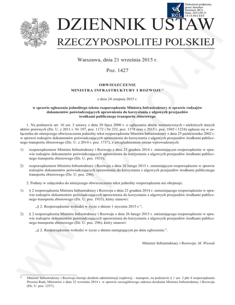 Dokument podpisany przez Jarosław Deminet; RCL Data: 2015.09.21 15:15:50 CEST DZIENNIK USTAW v.p l RZECZYPOSPOLITEJ POLSKIEJ Warszawa, dnia 21 września 2015 r. Poz. 1427 OBWIESZCZENIE MINISTRA INFRASTRUKTURY I ROZWOJU 1) .go z dnia 24 sierpnia 2015 r. w sprawie ogłoszenia jednolitego tekstu rozporządzenia Ministra Infrastruktury w sprawie rodzajów dokumentów poświadczających uprawnienia do korzystania z ulgowych przejazdów środkami publicznego transportu zbiorowego 1. Na podstawie art. 16 ust. 3 ustawy z dnia 20 lipca 2000 r. o ogłaszaniu aktów normatywnych i niektórych innych aktów prawnych (Dz. U. z 2011 r. Nr 197, poz. 1172 i Nr 232, poz. 1378 oraz z 2015 r. poz. 1045 i 1224) ogłasza się w załączniku do niniejszego obwieszczenia jednolity tekst rozporządzenia Ministra Infrastruktury z dnia 25 października 2002 r. w sprawie rodzajów dokumentów poświadczających uprawnienia do korzystania z ulgowych przejazdów środkami publicznego transportu zbiorowego (Dz. U. z 2014 r. poz. 1737), z uwzględnieniem zmian wprowadzonych: 2) rozporządzeniem Ministra Infrastruktury i Rozwoju z dnia 23 grudnia 2014 r. zmieniającym rozporządzenie w sprawie rodzajów dokumentów poświadczających uprawnienia do korzystania z ulgowych przejazdów środkami publicznego transportu zbiorowego (Dz. U. poz. 1933); w. rcl 1) rozporządzeniem Ministra Infrastruktury i Rozwoju z dnia 26 lutego 2015 r. zmieniającym rozporządzenie w sprawie rodzajów dokumentów poświadczających uprawnienia do korzystania z ulgowych przejazdów środkami publicznego transportu zbiorowego (Dz. U. poz. 296). 2. Podany w załączniku do niniejszego obwieszczenia tekst jednolity rozporządzenia nie obejmuje: 1) § 2 rozporządzenia Ministra Infrastruktury i Rozwoju z dnia 23 grudnia 2014 r. zmieniającego rozporządzenie w sprawie rodzajów dokumentów poświadczających uprawnienia do korzystania z ulgowych przejazdów środkami publicznego transportu zbiorowego (Dz. U. poz. 1933), który stanowi: „§ 2. Rozporządzenie wchodzi w życie z dniem 1 stycznia 2015 r.”; 2) § 2 rozporządzenia Ministra Infrastruktury i Rozwoju z dnia 26 lutego 2015 r. zmieniającego rozporządzenie w sprawie rodzajów dokumentów poświadczających uprawnienia do korzystania z ulgowych przejazdów środkami publicznego transportu zbiorowego (Dz. U. poz. 296), który stanowi: ww „§ 2. Rozporządzenie wchodzi w życie z dniem następującym po dniu ogłoszenia.”. 1) Minister Infrastruktury i Rozwoju: M. Wasiak Minister Infrastruktury i Rozwoju kieruje działem administracji rządowej – transport, na podstawie § 1 ust. 2 pkt 4 rozporządzenia Prezesa Rady Ministrów z dnia 22 września 2014 r. w sprawie szczegółowego zakresu działania Ministra Infrastruktury i Rozwoju (Dz. U. poz. 1257). Dziennik Ustaw –2– Poz. 1427 v.p l Załącznik do obwieszczenia Ministra Infrastruktury i Rozwoju z dnia 24 sierpnia 2015 r. (poz. 1427) ROZPORZĄDZENIE MINISTRA INFRASTRUKTURY 1) z dnia 25 października 2002 r. w sprawie rodzajów dokumentów poświadczających uprawnienia do korzystania z ulgowych przejazdów środkami publicznego transportu zbiorowego Na podstawie art. 6 ust. 1 ustawy z dnia 20 czerwca 1992 r. o uprawnieniach do ulgowych przejazdów środkami publicznego transportu zbiorowego (Dz. U. z 2012 r. poz. 1138, z późn. zm.2)) zarządza się, co następuje: .go § 1. 1. Dokumentem poświadczającym uprawnienie dziecka w wieku do 4 lat do korzystania, na podstawie biletów jednorazowych, z ulgi: 1) 100% – przy przejazdach środkami publicznego transportu zbiorowego kolejowego, 2) 100% – przy przejazdach środkami publicznego transportu zbiorowego autobusowego w komunikacji zwykłej i przyspieszonej, jeżeli dziecko nie korzysta z oddzielnego miejsca do siedzenia, 3) 78% – przy przejazdach środkami publicznego transportu zbiorowego autobusowego w komunikacji zwykłej i przyspieszonej, jeżeli dziecko korzysta z oddzielnego miejsca do siedzenia – jest dokument stwierdzający wiek dziecka. 1) 2) 3) w. rcl 2. Dokumentami poświadczającymi uprawnienie dziecka w wieku powyżej 4 lat do rozpoczęcia odbywania obowiązkowego rocznego przygotowania przedszkolnego do korzystania z ulgi 37% – przy przejazdach środkami publicznego transportu zbiorowego kolejowego w pociągach osobowych, pospiesznych i ekspresowych oraz autobusowego w komunikacji zwykłej i przyspieszonej, na podstawie biletów jednorazowych, są odpowiednio: dokument stwierdzający wiek dziecka; zaświadczenie o odroczeniu spełniania obowiązku szkolnego, wydane przez dyrektora publicznej szkoły podstawowej; legitymacja przedszkolna dla dziecka niepełnosprawnego. § 2. Użyte w rozporządzeniu określenie „osoba niezdolna do samodzielnej egzystencji” oznacza osobę, o której mowa w art. 1a ust. 4 pkt 1 ustawy z dnia 20 czerwca 1992 r. o uprawnieniach do ulgowych przejazdów środkami publicznego transportu zbiorowego. § 3. Dokumentami poświadczającymi uprawnienie do korzystania z ulgi 95% – przy przejazdach środkami publicznego transportu zbiorowego kolejowego oraz autobusowego, na podstawie biletów jednorazowych, są dla: opiekuna lub przewodnika towarzyszącego w podróży osobie niezdolnej do samodzielnej egzystencji – jeden z dokumentów osoby niezdolnej do samodzielnej egzystencji, o których mowa w § 7 ust. 1; ww 1) 2) przewodnika lub opiekuna towarzyszącego w podróży osobie niewidomej albo dla psa – przewodnika – jeden z dokumentów osoby niewidomej, o których mowa w § 8. § 4. 1. Dokumentami poświadczającymi uprawnienie dzieci i młodzieży dotkniętych inwalidztwem lub niepełnosprawnych do korzystania z ulgi 78% – przy przejazdach środkami publicznego transportu zbiorowego kolejowego oraz autobusowego z miejsca zamieszkania lub miejsca pobytu do przedszkola, szkoły, szkoły wyższej, placówki opiekuńczo-wychowawczej, placówki oświatowo-wychowawczej, specjalnego ośrodka szkolno-wychowawczego, specjalneg