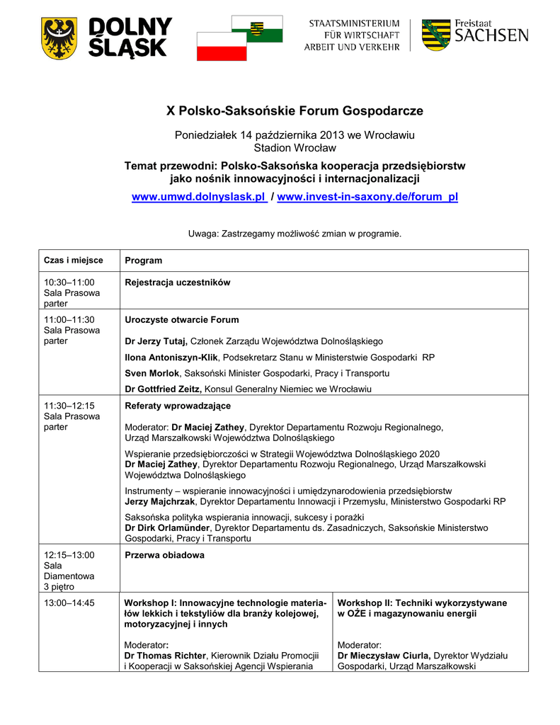 X Polsko-Saksońskie Forum Gospodarcze Poniedziałek 14 października 2013 we Wrocławiu Stadion Wrocław Temat przewodni: Polsko-Saksońska kooperacja przedsiębiorstw jako nośnik innowacyjności i internacjonalizacji www.umwd.dolnyslask.pl / www.invest-in-saxony.de/forum_pl Uwaga: Zastrzegamy możliwość zmian w programie. Czas i miejsce Program 10:30–11:00 Sala Prasowa parter Rejestracja uczestników 11:00–11:30 Sala Prasowa parter Uroczyste otwarcie Forum Dr Jerzy Tutaj, Członek Zarządu Województwa Dolnośląskiego Ilona Antoniszyn-Klik, Podsekretarz Stanu w Ministerstwie Gospodarki RP Sven Morlok, Saksoński Minister Gospodarki, Pracy i Transportu Dr Gottfried Zeitz, Konsul Generalny Niemiec we Wrocławiu 11:30–12:15 Sala Prasowa parter Referaty wprowadzające Moderator: Dr Maciej Zathey, Dyrektor Departamentu Rozwoju Regionalnego, Urząd Marszałkowski Województwa Dolnośląskiego Wspieranie przedsiębiorczości w Strategii Województwa Dolnośląskiego 2020 Dr Maciej Zathey, Dyrektor Departamentu Rozwoju Regionalnego, Urząd Marszałkowski Województwa Dolnośląskiego Instrumenty – wspieranie innowacyjności i umiędzynarodowienia przedsiębiorstw Jerzy Majchrzak, Dyrektor Departamentu Innowacji i Przemysłu, Ministerstwo Gospodarki RP Saksońska polityka wspierania innowacji, sukcesy i porażki Dr Dirk Orlamünder, Dyrektor Departamentu ds. Zasadniczych, Saksońskie Ministerstwo Gospodarki, Pracy i Transportu 12:15–13:00 Sala Diamentowa 3 piętro Przerwa obiadowa 13:00–14:45 Workshop I: Innowacyjne technologie materiałów lekkich i tekstyliów dla branży kolejowej, motoryzacyjnej i innych Workshop II: Techniki wykorzystywane w OŹE i magazynowaniu energii Moderator: Dr Thomas Richter, Kierownik Działu Promocjii i Kooperacji w Saksońskiej Agencji Wspierania Moderator: Dr Mieczysław Ciurla, Dyrektor Wydziału Gospodarki, Urząd Marszałkowski Gospodarki Województwa Dolnośląskiego Innowacje w zakresie techniki kolejowej Dirk-Ulrich Krüger, Kierownik projektu BTSsaksoński klaster kolejowy Innowacyjne technologie w zakresie OŹE Dr Robert Franke, Kierownik projektu, Inicjatywa Związkowa EESA (OŹE w Saksonii) Dr Adam Jabłoński, Prezes Zarządu, Południowy Klaster Kolejowy w Polsce Nauka, badania i edukacja szkolnictwa wyższego w obszarze inżynierii pojazdów nośnikiem innowacji i internacjonalizacji Dr inż. Zbigniew Sroka, Prorektor ds. Studenckich, Politechnika Wrocławska Innowacyjne tekstylia dla celów przemysłowych Elżbieta Paradowska, Prezes, Stowarzyszenie Włókienników Polskich, Oddział Wrocław Projektowanie multifunkcjonalnych systemów konstrukcji lekkich z wykorzystaniem różnorodnych materiałów inżynierskich - wyzwania i możliwości dla zrównoważonej współpracy między Polską i Saksonią. Prof Dr-Ing habil Prof Eh Dr hc Werner Hufenbach, Dyrektor Instytutu Prof. dr hab.inż Edward Chlebus, Dziekan, Wydział Mechaniczny Politechnika Wrocławska Dr inż. Andrzej Czulak, Instytut Konstrukcji Lekkich i Przetwórstwa Tworzyw Sztucznych, Uniwersytet Techniczny w Dreźnie Metody i techniki akumulacji różnych form energii Prof. dr hab. inż. Zbigniew Gnutek, Dziekan Wydziału Mechaniczno- Energetycznego, Kierownik Zakładu Termodynamiki w Instytucie Techniki Cieplnej i Mechaniki Płynów, Politechnika Wrocławska Energy Saxony – zorientowana na gospodarkę Sieć Energetyczna Christian von Olshausen, Prezes Zarządu, Energy Saxony Nanofotonika w kontekście wykorzystania OŹE Prof. dr hab. inż. Jan Misiewicz Wydział Podstawowych Problemów Techniki Dyrektor Instytutu Fizyki, Politechnika Wrocławska 14:45–15:00 Sala Prasowa parter Przerwa kawowa 15:00–15:45 Sala Prasowa parter Panel dyskusyjny Temat przewodni dyskusji: Internacjonalizacja innowacyjnych firm dolnośląskich i saksońskich – perspektywy/ podsumowanie dyskusji, wnioski Moderator: Dr Maciej Zathey, Dyrektor Departamentu Rozwoju Regionalnego, Urząd Marszałkowski Województwa Dolnośląskiego Eksperci: Prof. zw. dr hab. Inż. Jan Koch, Dyrektor Wrocławskiego Centrum Transferu Technologii Politechniki Wrocławskiej Jerzy Majchrzak, Dyrektor Departamentu Innowacji i Przemysłu, Ministerstwo Gospodarki RP Kazimierz Wołyniec, Prezes Stowarzyszenia SIDE-CLUSTER Dr Thomas Richter, Kierownik Działu Promocji i Kooperacji w Saksońskiej Agencji Wspierania Gospodarki Olaf Besser, Członek Zarządu, YADOS GmbH