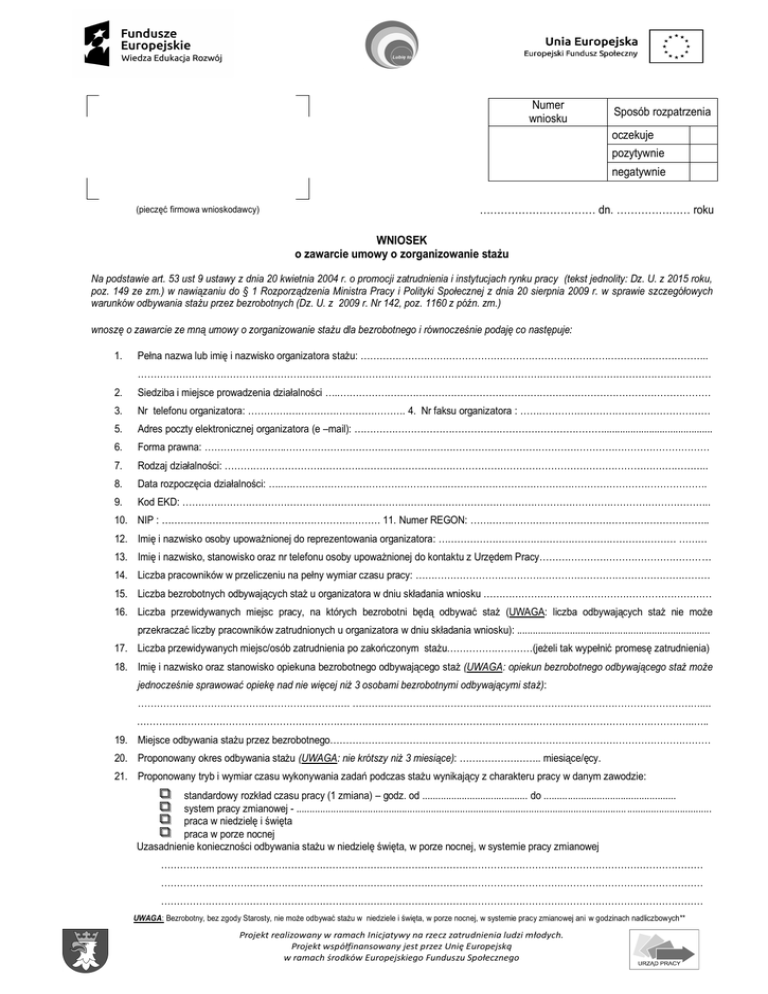 Numer wniosku Sposób rozpatrzenia oczekuje pozytywnie negatywnie (pieczęć firmowa wnioskodawcy) …………………………… dn. ………………… roku WNIOSEK o zawarcie umowy o zorganizowanie stażu Na podstawie art. 53 ust 9 ustawy z dnia 20 kwietnia 2004 r. o promocji zatrudnienia i instytucjach rynku pracy (tekst jednolity: Dz. U. z 2015 roku, poz. 149 ze zm.) w nawiązaniu do § 1 Rozporządzenia Ministra Pracy i Polityki Społecznej z dnia 20 sierpnia 2009 r. w sprawie szczegółowych warunków odbywania stażu przez bezrobotnych (Dz. U. z 2009 r. Nr 142, poz. 1160 z późn. zm.) wnoszę o zawarcie ze mną umowy o zorganizowanie stażu dla bezrobotnego i równocześnie podaję co następuje: 1. Pełna nazwa lub imię i nazwisko organizatora stażu: ……………………………………………………………………………………………….. ……………………………………………………….……………………………………………………………………………………………………… 2. Siedziba i miejsce prowadzenia działalności …..……………………………………………………………………………………………………… 3. Nr telefonu organizatora: ………….………………………………. 4. Nr faksu organizatora : …………………………………………………… 5. Adres poczty elektronicznej organizatora (e –mail): ………….…………………………………………………………......................................... 6. Forma prawna: ……………………..……………………………………..……………………………………………………………………………… 7. Rodzaj działalności: ………………………………………………………………………………………………………………………….………….. 8. Data rozpoczęcia działalności: …..…………………………………………….………………………………………………………………………. 9. Kod EKD: ………………………………………………………………………………………………………………………………………………….. 10. NIP : …………………………………………………………… 11. Numer REGON: …………..…………………………………………………….. 12. Imię i nazwisko osoby upoważnionej do reprezentowania organizatora: ………………………………………………………………… ……… 13. Imię i nazwisko, stanowisko oraz nr telefonu osoby upoważnionej do kontaktu z Urzędem Pracy……………………………………………… 14. Liczba pracowników w przeliczeniu na pełny wymiar czasu pracy: ………………………………………………………………………………… 15. Liczba bezrobotnych odbywających staż u organizatora w dniu składania wniosku ……………………………………………………………… 16. Liczba przewidywanych miejsc pracy, na których bezrobotni będą odbywać staż (UWAGA: liczba odbywających staż nie może przekraczać liczby pracowników zatrudnionych u organizatora w dniu składania wniosku): ......................................................................... 17. Liczba przewidywanych miejsc/osób zatrudnienia po zakończonym stażu………………………(jeżeli tak wypełnić promesę zatrudnienia) 18. Imię i nazwisko oraz stanowisko opiekuna bezrobotnego odbywającego staż (UWAGA: opiekun bezrobotnego odbywającego staż może jednocześnie sprawować opiekę nad nie więcej niż 3 osobami bezrobotnymi odbywającymi staż): …………………………………………………………. …………………………………..…………………………………………………………….... …………………………………………………………………………………………………………………………………………………………..….. 19. Miejsce odbywania stażu przez bezrobotnego………………………………………………………………………………………………………… 20. Proponowany okres odbywania stażu (UWAGA: nie krótszy niż 3 miesiące): …………………….. miesiące/ęcy. 21. Proponowany tryb i wymiar czasu wykonywania zadań podczas stażu wynikający z charakteru pracy w danym zawodzie: standardowy rozkład czasu pracy (1 zmiana) – godz. od ........................................ do .................................................. system pracy zmianowej - ............................................................................................................................................................. praca w niedzielę i święta praca w porze nocnej Uzasadnienie konieczności odbywania stażu w niedzielę święta, w porze nocnej, w systemie pracy zmianowej ……………………………………………………………………………………………………………………………………………………… ……………………………………………………………………………………………………………………………………………………… ……………………………………………………………………………………………………………………………………………………… UWAGA: Bezrobotny, bez zgody Starosty, nie może odbywać stażu w niedziele i święta, w porze nocnej, w systemie pracy zmianowej ani w godzinach nadliczbowych** Projekt realizowany w ramach Inicjatywy na rzecz zatrudnienia ludzi młodych. Projekt współfinansowany jest przez Unię Europejską w ramach środków Europejskiego Funduszu Społecznego 22. Opis zadań, jakie będą wykonywane podczas stażu przez bezrobotnego