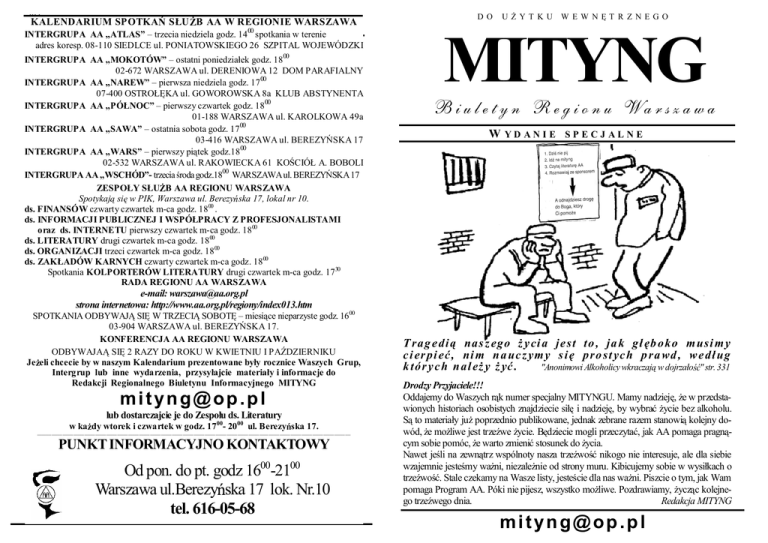 Ę ś 40 DO ś Ń KALENDARIUM SPOTKA SŁU B AA W REGIONIE WARSZAWA INTERGRUPA AA „ATLAS” – trzecia niedziela godz. 1400 spotkania w terenie adres koresp. 08-110 SIEDLCE ul. PONIATOWSKIEGO 26 SZPITAL WOJEWÓDZKI U YT KU W EW N T R ZNEGO MITYNG Ę INTERGRUPA AA „MOKOTÓW” – ostatni poniedziałek godz. 1800 02-672 WARSZAWA ul. DERENIOWA 12 DOM PARAFIALNY INTERGRUPA AA „NAREW” – pierwsza niedziela godz. 1700 07-400 OSTROŁ KA ul. GOWOROWSKA 8a KLUB ABSTYNENTA INTERGRUPA AA „PÓŁNOC” – pierwszy czwartek godz. 1800 01-188 WARSZAWA ul. KAROLKOWA 49a INTERGRUPA AA „SAWA” – ostatnia sobota godz. 1700 03-416 WARSZAWA ul. BEREZY SKA 17 INTERGRUPA AA „WARS” – pierwszy pi tek godz.1800 02-532 WARSZAWA ul. RAKOWIECKA 61 KO CIÓŁ A. BOBOLI INTERGRUPA AA „WSCHÓD”- trzecia roda godz.1800 WARSZAWA ul. BEREZY SKA 17 ZESPOŁY SŁU B AA REGIONU WARSZAWA Spotykaj si w PIK, Warszawa ul. Berezy ska 17, lokal nr 10. ds. FINANSÓW czwarty czwartek m-ca godz. 1800 . ds. INFORMACJI PUBLICZNEJ I WSPÓŁPRACY Z PROFESJONALISTAMI oraz ds. INTERNETU pierwszy czwartek m-ca godz. 1800 ds. LITERATURY drugi czwartek m-ca godz. 1800 ds. ORGANIZACJI trzeci czwartek m-ca godz. 1800 ds. ZAKŁADÓW KARNYCH czwarty czwartek m-ca godz. 1800 Spotkania KOLPORTERÓW LITERATURY drugi czwartek m-ca godz. 1730 RADA REGIONU AA WARSZAWA Biuletyn Regionu Warszawa ę ą ń ś ś Ń Ś ą Ń W YD ANIE SPECJ ALNE e-mail: [email protected] strona internetowa: http://www.aa.org.pl/regiony/index013.htm ę Ŝ ą ę ć ą ść Ŝ Ŝ ę ę ę Ŝ ć ą ą ć ą ć ś Ŝ ź ź ą Ŝ Ŝ Ŝ ś Ŝ Ŝ ć ś ź Od pon. do pt. godz 1600-2100 Warszawa ul.Berezy ska 17 lok. Nr.10 tel. 616-05-68 ś ą ś PUNKT INFORMACYJNO KONTAKTOWY Ŝ ć ę Ŝ Ŝ Ŝ ń ________ ______ ______ ______ ______ ______ ______ ______ ______ ______ ______ ______ ______ ______ ______ ______ ______ ______ ______ ______ _____ ______ ______ ______ ______ ______ ______ ______ ___ ź ą Ŝ lub dostarczajcie je do Zespołu ds. Literatury w ka dy wtorek i czwartek w godz. 1700- 2000 ul. Berezy ska 17. Ŝ Drodzy Przyjaciele!!! Oddajemy do Waszych r k numer specjalny MITYNGU. Mamy nadziej , e w przedstawionych historiach osobistych znajdziecie sił i nadziej , by wybra ycie bez alkoholu. S to materiały ju poprzednio publikowane, jednak zebrane razem stanowi kolejny dowód, e mo liwe jest trze we ycie. B dziecie mogli przeczyta , jak AA pomaga pragn cym sobie pomóc, e warto zmieni stosunek do ycia. Nawet je li na zewn trz wspólnoty nasza trze wo nikogo nie interesuje, ale dla siebie wzajemnie jeste my wa ni, niezale nie od strony muru. Kibicujemy sobie w wysiłkach o trze wo . Stale czekamy na Wasze listy, jeste cie dla nas wa ni. Piszcie o tym, jak Wam pomaga Program AA. Póki nie pijesz, wszystko mo liwe. Pozdrawiamy, ycz c kolejneRedakcja MITYNG go trze wego dnia. Ŝ [email protected] T rag e di nas z ego y ci a je st to , ja k gł b oko m usi m y c i er pi e , ni m n a uc z ym y s i pro st yc h p ra wd , w e dł ug "Anonimowi Alkoholicy wkraczaj w dojrzało " str. 331 k tór y c h n al e y y . ć Ę Ŝ Ą Ź Ń ą Ę Ą Ę Ą SPOTKANIA ODBYWAJ SI W TRZECI SOBOT – miesi ce nieparzyste godz. 1600 03-904 WARSZAWA ul. BEREZY SKA 17. KONFERENCJA AA REGIONU WARSZAWA ODBYWAJA SI 2 RAZY DO ROKU W KWIETNIU I PA DZIERNIKU Je eli chcecie by w naszym Kalendarium prezentowane były rocznice Waszych Grup, Intergrup lub inne wydarzenia, przysyłajcie materiały i informacje do Redakcji Regionalnego Biuletynu Informacyjnego MITYNG - Tr ze wo meimt oycnjogna@l na op pl , z.ło , st ra c h . - 2 39 Kazio dzieli si z nami swoim do wiadczeniem na temat: Porzuciłem i po wi ciłem wszystkich moich starych przyjaciół i nie mam nikogo. Tylko ja i Bóg. Bóg, chocia jest wielki nigdy nie odpisze. ś ą „Niesienie posłania AA do Zakładów Karnych – jego pocz tki.” ś Wy lemy pomocne wskazówki dotycz ce tej słu by razem z personaliami wi nia, który oczekuje kontaktu.. ć Ŝ Ŝ ą ę Ŝ ą Ŝ Ŝ ą ą ę ę Ŝ ś ć ę ś ą ę Ŝ Ŝ ć ś ę Ŝ Ŝ ę ź Ŝ ę ę ć ę Ŝ ę Ŝ ą ę ę ę ą ę Ŝ ę ń ę ą ę Ŝ ć ś ę ć ś ą ć ę ń Ś ę ś ą ę ś ń W formie zorganizowanej program AA, trafił do rodowiska pozna skiego w roku 1974. Zainteresowali si tym programem profesjonali ci. Pierwsze, nie miałe kontakty Wspólnoty AA ze skazanymi nast piły w roku 1975. Zainspirowała je mgr J. Stengrez psycholog poradni odwykowej w Poznaniu, której filia mie ciła si w Mrowinie w Oddziale Zewn trznym pozna skiego Aresztu ledczego. Według koncepcji pani psycholog posłannicy AA mieli niejako zast pi , a w ka dym razie uzupełni działalno profesjonalistów poradni, którym nie starczało czasu na prac ze skazanymi alkoholikami. Zatem działalno AA nie byłaby samodzielna, a tylko jako pomoc dla pani psycholog. Niestety inicjatywa ta nie została podtrzymana ani upowszechniona, gdy takie działania nie były zach caj ce dla adnej ze stron. Podobne działanie było podejmowane w 1983 roku przez poradni odwykow Zakładu Karnego we Wrocławiu. Przełom lat 70-80 dał kilka prób niesienia posłania AA do skazanych. Próby te ko czyły si jedynie na organizacji mityngów informacyjnych. Na taki stan rzeczy zło yły si w głównej mierze trzy przyczyny: 1. Niewystarczaj ce zainteresowanie samych Anonimowych Alkoholików ( wspólnota dopiero si rozwijała). 2. Zaostrzony w tym czasie izolacjonizm wi ziennictwa. 3. Brak poparcia ze strony profesjonalistów oraz centralnych władz wi ziennych. Przełom w tym zakresie nast pił dopiero w roku 1987, w sposób bardzo prozaiczny. Jeden ze skazanych w Zakładzie Karnym w Siedlcach, przeczytał w tygodniku "Polityka", artykuł Wiktora O. pt: „Grzech czy choroba?”. Poniewa sam miał problem z alkoholem, zwrócił si do psychologa wi ziennego mgr Tadeusza Paciorka, który tym tematem si zainteresował . Poniewa w tym czasie grupa miejska AA w Siedlcach upadła (zapicie), usiłował skontaktowa si z innymi z AA. D