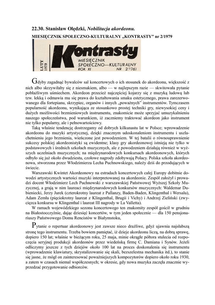 22.30. Stanisław Olędzki, Nobilitacja akordeonu. MIESIĘCZNIK SPOŁECZNO-KULTURALNY „KONTRASTY” nr 2/1979 Gdyby zagadnąć bywalców sal koncertowych o ich stosunek do akordeonu, większość z nich albo skrzywiłaby się z niesmakiem, albo — w najlepszym razie — skwitowała pytanie pobłażliwym uśmiechem. Akordeon przecież najczęściej kojarzy się z muzyką ludową lub tzw. lekką i odmawia mu się prawa do kształtowania smaku estetycznego, prawa zarezerwowanego dla fortepianu, skrzypiec, organów i innych „poważnych” instrumentów. Tymczasem popularność akordeonu, wynikająca ze stosunkowo prostej techniki gry, niewysokiej ceny i dużych możliwości brzmieniowych instrumentu, znakomicie może sprzyjać umuzykalnieniu naszego społeczeństwa, pod warunkiem, iż zaczniemy traktować akordeon jako instrument nie tylko popularny, ale i pełnowartościowy. Taką właśnie tendencję dostrzegamy od dobrych kilkunastu lat w Polsce; wprowadzenie akordeonu do muzyki artystycznej, dzięki znacznym udoskonaleniom instrumentu i uszlachetnieniu jego brzmienia, wieńczone jest powodzeniem. W tej batalii o równouprawnienie sukcesy polskiej akordeonistyki są ewidentne; klasy gry akordeonowej istnieją nie tylko w podstawowych i średnich szkołach muzycznych, ale z powodzeniem działają również w wyższych uczelniach muzycznych; na międzynarodowych konkursach akordeonowych, których odbyło się już około dwudziestu, czołowe nagrody zdobywają Polacy. Polska szkoła akordeonowa, stworzona przez Włodzimierza Lecha Puchnowskiego, należy dziś do przodujących w świecie. Warszawski Kwintet Akordeonowy na estradach koncertowych całej Europy dobitnie dowodzi artystycznych wartości muzyki interpretowanej na akordeonie. Zespół założył i prowadzi docent Włodzimierz Lech Puchnowski z warszawskiej Państwowej Wyższej Szkoły Muzycznej, a grają w nim laureaci międzynarodowych konkursów muzycznych: Waldemar Dubieniecki, Jerzy Jurek (czterokrotny laureat z Pallanzy, Baden-Baden, Klingenthal i Wersalu), Adam Zemła (pięciokrotny laureat z Klingenthal, Brugii i Vichy) i Andrzej Zieliński (zwycięzca konkursu w Klingenthal i laureat III nagrody w La Valletta). W ramach wojewódzkiego sezonu koncertowego ten znakomity zespół gościł w grudniu na Białostocczyźnie, dając dziesięć koncertów, w tym jeden społecznie — dla 150 pensjonariuszy Państwowego Domu Rencistów w Białymstoku, Pytanie o repertuar akordeonowy jest zawsze nieco drażliwe, gdyż ujawnia najsłabszą stronę tego instrumentu. Trzeba bowiem pamiętać, iż dzieje akordeonu liczą, na dobrą sprawę, dopiero 150 lat; właśnie w bieżącym roku, 25 maja, minie okrągłe półtora stulecia od rozpoczęcia seryjnej produkcji akordeonów przez wiedeńską firmę C. Damiana i Synów. Jeżeli odliczymy jeszcze z tych dziejów około 100 lat na proces doskonalenia się instrumentu (wprowadzenie klawiatury, skrystalizowanie się skali, bezszelestna mechanika itd.), to stanie się jasne, że mógł on zainteresować poważniejszych kompozytorów dopiero około roku 1930, a zatem w czasach niemal współczesnych; w okresie, gdy nowa muzyka zaczęła znacznie wyprzedzać przygotowanie odbiorców. Akordeon, już udoskonalony, chcąc zyskać popularność, musiał dysponować literaturą muzyczną, która znajdowałaby odbiorców. Zaczęto więc przystosowywać istniejącą literaturę na instrumenty klawiszowe do możliwości akordeonu albo po prostu grać na nim dzieła Bacha, Mozarta i innych wybitnych mistrzów przeszłości. I to właśnie stało się kością niezgody. Bach na akordeonie! — oburzali się puryści. A cóż innego czynił ówże Bach transkrybując zawzięcie na organy czy klawesyn koncerty skrzypcowe Vivaldiego! — ripostowali obeznani nieco z historią melomani. Jak często bywa — racje są podzielone. Wielki kantor lipski — owszem, przenosił utwory wielu kompozytorów na organy i klawesyn, ale czynił to inaczej niż dzisiejsi akordeoniści, i z innych pobudek. Niemniej jednak, bez wnikania w szczegóły, i Bach, i akordeoniści — przez transkrypcje — nie tylko rozszerzyli repertuar na dany instrument, ale (co istotniejsze) rozbudowali zasób środków technicznych, przenosząc, na przykład, skrzypcową śpiewność na organy (Bach — Vivaldi) lub wzbogacając artykulację akordeonową o brzmienia typowe dla fortepianu. Tej samej wiosny 1829 r., kiedy firma Damiana rozpoczęła seryjną produkcję akordeonów, pod kierunkiem Feliksa Mendelssohna wykonano Pasję według św. Mateusza Jana Sebastiana Bacha — w sto lat po jej powstaniu. Od tego momentu (po okresie zapomnienia) Bach stał się kompozytorem powszechnie uwielbianym. Jego utwory są dzisiaj także nieodłączną częścią repertuaru każdego szanującego się. akordeonisty czy zespołu akordeonowego. Warszawski Kwintet Akordeonowy koncerty swe rozpoczynał kompozycją, którą można by obrać za motto sporów o wartość transkrybowanej akordeonowej muzyki. Koncert skrzypcowy Antonia Vivaldiego, opracowany przez Jana Sebastiana Bacha na organy, Włodzimierz Lech Puchnowski rozpisał dla swego zespołu z efektami artystycznymi analogicznymi do wersji organowej i skrzypcowej razem wziętych. Trzecie wcielenie muzyki Vivaldiego łączyło bowiem walor głębi bachowskiej narracji z blaskiem i emocjonalizmem typowym dla muzyki skrzypcowej wielkiego Włocha. Warszawski Kwintet Akordeonowy dał interpretację nie tylko przemyślaną, stylową, dowartościowującą transkrybowane dzieło nowymi brzmieniowymi możliwościami zespołu pięciu akordeonów, ale z miejsca porwał słuchaczy swym mistrzostwem, absolutną synchronią gry w każdej warstwie muzyki: technicznej precyzji, frazowania, wewnętrznej dynamiki brzmienia. Co więcej, zespół myśli jednakowymi kategoriami ekspresyjnymi (jeśli wolno tak się wyrazić), co prowadzi do owej rzadko spotykanej stopliwości muzyki już nie tylko w warstwach dźwi