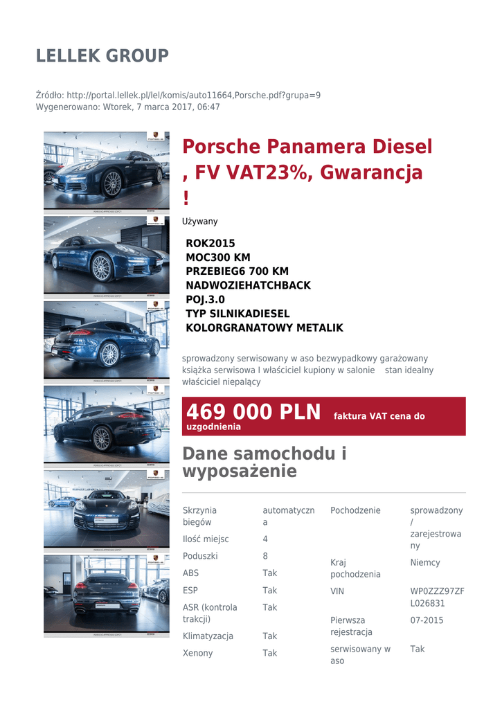 LELLEK GROUP Źródło: http://portal.lellek.pl/lel/komis/auto11664,Porsche.pdf?grupa=9 Wygenerowano: Wtorek, 7 marca 2017, 06:47 Porsche Panamera Diesel , FV VAT23%, Gwarancja ! Używany ROK2015 MOC300 KM PRZEBIEG6 700 KM NADWOZIEHATCHBACK POJ.3.0 TYP SILNIKADIESEL KOLORGRANATOWY METALIK sprowadzony serwisowany w aso bezwypadkowy garażowany książka serwisowa I właściciel kupiony w salonie stan idealny właściciel niepalący 469 000 PLN faktura VAT cena do uzgodnienia Dane samochodu i wyposażenie Skrzynia biegów automatyczn a Pochodzenie sprowadzony / zarejestrowa ny Ilość miejsc 4 Poduszki 8 Niemcy Tak Kraj pochodzenia ABS ESP Tak VIN ASR (kontrola trakcji) Tak WP0ZZZ97ZF L026831 07-2015 Klimatyzacja Tak Pierwsza rejestracja Xenony Tak serwisowany w aso Tak Elektryczne szyby Tak Elektryczne lusterka Tak Szyberdach Tak Wspomaganie kierownicy Tak Komputer Tak Radioodtwarza cz Tak Alarm Tak Immobilizer Tak Centralny zamek Tak Nawigacja satelitarna Tak Światła przeciwmgieln e Tak Czujnik deszczu Tak Czujniki parkowania Tak Kierownica wielofunkcyjna Tak Podgrzewane fotele Tak Tempomat Tak Asystent pasa ruchu Tak Kamera cofania Tak Bluetooth Tak System Start-Stop Tak Asystent parkowania Tak Czujniki parkowania przód Tak Napęd tylny Tak Alufelgi 19 Cali bezwypadkowy Tak garażowany Tak książka serwisowa Tak I właściciel Tak kupiony w salonie Tak tunning homologacja stan idealny Tak właściciel niepalący Tak Miejsce postoju Porsche Centrum Sopot Opis dodatkowy Porsche Panamera Diesel Produkcja 2015-02-20 Gwarancja fabryczna 2017-07-27 VIN: WP0ZZZ97ZFL026831 Sprzedaż na podstawie faktury VAT 23% Auto sprowadzone, bezwypadkowe, Sprawdzone w serwisie Porsche Centrum Sopot Auto w czasie rejestracji w Polsce. Kolor: Night Blue Metallic Tapicerka: Black leather interior 081 Fuel tank 100-litre 216 Preparation for towbar system 261 Automatically dimming mirrors 343 Seat heating (front and rear) 345 Steering wheel heating 350 Adaptive air suspension incl. PASM 457 Lane Change Assist 472 19-inch Panamera Design II wheel 576 Four-zone climate control 585 Cupholder 603 Bi-Xenon-headlights incl. Porsche Dynamic Light System 619 Mobile phone preparation 630 Rear interior lighting package 631 Speed limit display 638 ParkAssist (front and rear) including reversing camera 650 Electric slide/tilt sunroof in glass 658 Power steering Plus 680 BOSE® surround sound-system 810 Floor mats 866 Privacy glass 870 Universal audio interface P23 Porsche Communication Management (PCM) incl. navigation module P80 Comfort memory package UN1 Online Services XAR SportDesign side skirts XXP Tinted LED taillights XYV Porsche crest embossed on headrests, front Nota prawna Handlowiec Marcin Teske, Maciej Słobodowski +48 661 911 912 zapytaj mobile +48 515 000 911 Gwarancja Gwarancja dostępna Ubezpieczenie Ubezpieczenie dostępne Kredyt Kredyt dostępny Zeskanuj kod, aby zobaczyć ofertę online Informacja nie stanowi oferty w rozumieniu art. 66 Kodeksu Cywilnego. Podane dane mają charakter wyłącznie informacyjny. Pełna informacja dostępna jest u handlowca. Sprzedający nie odpowiada za ewentualne błędy lub nieaktualność ogłoszenia.