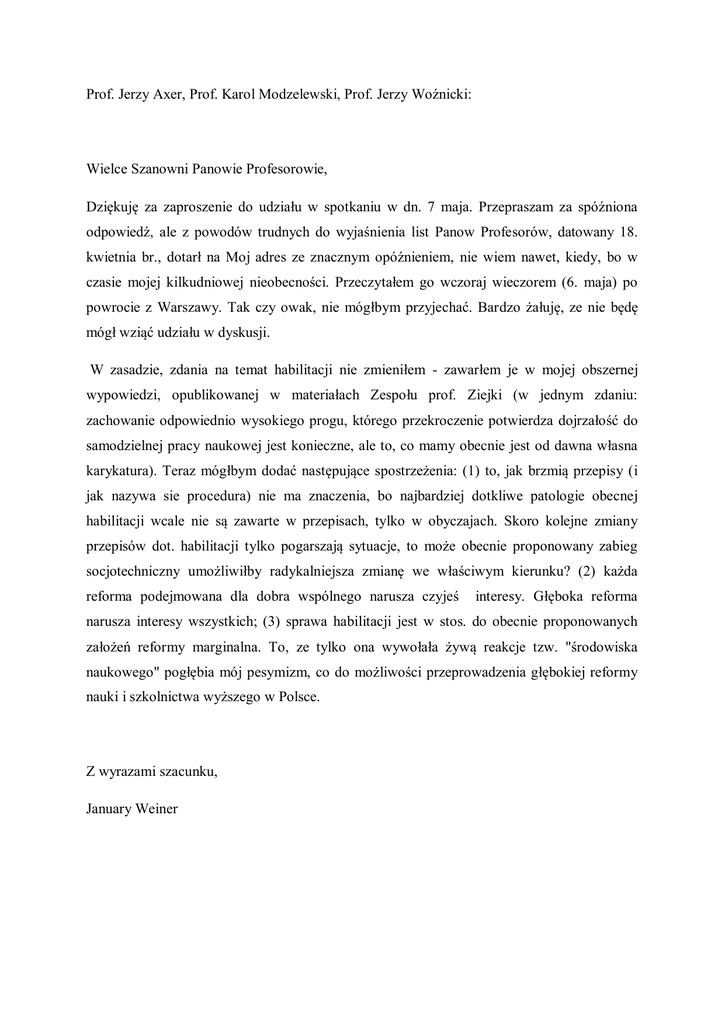 Prof. Jerzy Axer, Prof. Karol Modzelewski, Prof. Jerzy Woźnicki: Wielce Szanowni Panowie Profesorowie, Dziękuję za zaproszenie do udziału w spotkaniu w dn. 7 maja. Przepraszam za spóźniona odpowiedź, ale z powodów trudnych do wyjaśnienia list Panow Profesorów, datowany 18. kwietnia br., dotarł na Moj adres ze znacznym opóźnieniem, nie wiem nawet, kiedy, bo w czasie mojej kilkudniowej nieobecności. Przeczytałem go wczoraj wieczorem (6. maja) po powrocie z Warszawy. Tak czy owak, nie mógłbym przyjechać. Bardzo żałuję, ze nie będę mógł wziąć udziału w dyskusji. W zasadzie, zdania na temat habilitacji nie zmieniłem - zawarłem je w mojej obszernej wypowiedzi, opublikowanej w materiałach Zespołu prof. Ziejki (w jednym zdaniu: zachowanie odpowiednio wysokiego progu, którego przekroczenie potwierdza dojrzałość do samodzielnej pracy naukowej jest konieczne, ale to, co mamy obecnie jest od dawna własna karykatura). Teraz mógłbym dodać następujące spostrzeżenia: (1) to, jak brzmią przepisy (i jak nazywa sie procedura) nie ma znaczenia, bo najbardziej dotkliwe patologie obecnej habilitacji wcale nie są zawarte w przepisach, tylko w obyczajach. Skoro kolejne zmiany przepisów dot. habilitacji tylko pogarszają sytuacje, to może obecnie proponowany zabieg socjotechniczny umożliwiłby radykalniejsza zmianę we właściwym kierunku? (2) każda reforma podejmowana dla dobra wspólnego narusza czyjeś interesy. Głęboka reforma narusza interesy wszystkich; (3) sprawa habilitacji jest w stos. do obecnie proponowanych założeń reformy marginalna. To, ze tylko ona wywołała żywą reakcje tzw. "środowiska naukowego" pogłębia mój pesymizm, co do możliwości przeprowadzenia głębokiej reformy nauki i szkolnictwa wyższego w Polsce. Z wyrazami szacunku, January Weiner