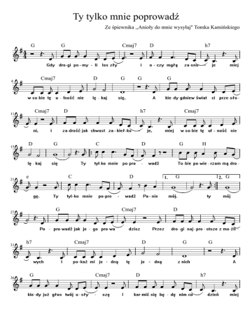 Ty tylko mnie poprowadź Ze śpiewnika ,,Anioły do mnie wysyłaj" Tomka Kamińskiego 4 G 6 21 36 D Cmaj7 D G C G G 1. Cmaj7 Cmaj7 D H G 2. G D D Cmaj7 Cmaj7 D D G G G h7 h7 C h7 G D D e 27 31 Cmaj7 Cmaj7 11 15 G G G h7 Cmaj7 D G 40 45 49 D D G H 1. G C e www.nuty.religijne.org 2 C 2. G