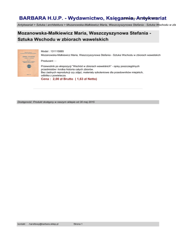 Utworzono Antykwariat : 07 marzec 2017 BARBARA H.U.P. - Wydawnictwo, Księgarnia, Antykwariat > Sztuka i architektura > Mozanowska-Małkiewicz Maria, Waszczyszynowa Stefania - Sztuka Wschodu w zbi Mozanowska-Małkiewicz Maria, Waszczyszynowa Stefania Sztuka Wschodu w zbiorach wawelskich Model : 131115885 Mozanowska-Małkiewicz Maria, Waszczyszynowa Stefania - Sztuka Wschodu w zbiorach wawelskich Producent : Przewodnik po ekspozycji "Wschód w zbiorach wawelskich" - opisy poszczególnych przedmiotów i krotka historia całych zbiorów. Bez żadnych reprodukcji czy zdjęć, materiały szkoleniowe dla przedowników miejskich, odbitka z powielacza. Cena : 2,00 zł Brutto ( 1,63 zł Netto) Dostępność: Produkt dostępny w naszym sklepie od 30 maj 2015 kontakt : - [email protected] Strona 1