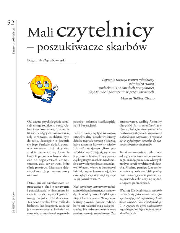 Z naszych doświadczeń 52 Mali czytelnicy – poszukiwacze skarbów Bogumiła Ogrodowczyk Czytanie rozwija rozum młodzieży, odmładza starca, uszlachetnia w chwilach pomyślności, daje pomoc i pocieszenie w przeciwnościach. Marcus Tullius Cicero MERITUM 2 (9) / 2008 Od dawna psychologowie zwracają uwagę rodzicom, nauczycielom i wychowawcom, że czytanie literatury odgrywa bardzo ważną rolę w rozwoju intelektualnym dziecka. Szczególnie docenia się jego funkcję dydaktyczną, wychowawczą, profilaktyczną, a także terapeutyczną. Czytanie książek pozwala uchronić dziecko od negatywnych emocji, smutku, żalu czy gniewu, które silnie przeżywa. Literatura dziecięca kształtuje pozytywne wzory osobowe. Dzieci, już od najmłodszych lat, przejawiają chęć poznawania i poszukiwania w nieznanym im świecie czegoś, co przyciągnie ich uwagę, czegoś, co ich zafascynuje. Tak więc dziecko, które trafia do biblioteki lub księgarni, czuje się jak w zaczarowanej krainie i od razu wie, co mu się tak naprawdę podoba – kolorowe książki z pięknymi ilustracjami. Bardzo istotny wpływ na rozwój intelektualny i osobowościowy dziecka ma stały kontakt z książką, która rozszerza horyzonty wiedzy i doznań czytającego. „Rozczytane” dzieci wyróżniają się szybszym kojarzeniem faktów, lepszą pamięcią, bogatszym zasobem wiadomości oraz wiedzy językowo-słownikowej. Wszyscy wiemy, że do ciekawej książki, bogato ilustrowanej, dziecko zagląda chętniej i częściej, staje się jej poszukiwaczem. Mali czytelnicy, uczniowie w młodszym wieku szkolnym, tak naprawdę nie wiedzą, które książki spełniają ich oczekiwania. W wyborze lektury powinni pomóc rodzice, bo to oni najlepiej znają swoje pociechy, ich zainteresowania oraz poziom rozwoju umysłowego. Za- interesowanie, według Antoniny Guryckiej jest to wrażliwość psychiczna, która przybiera postać ukierunkowanej aktywności poznawczej o określonym natężeniu i przejawia się w wybiórczym stosunku do otaczających jednostkę zjawisk. Te zainteresowania są uzależnione od wpływów środowiska rodzinnego, szkoły, prasy oraz własnych predyspozycji psychicznych dziecka. Musimy pamiętać, że umiejętność czytania jest ściśle powiązana z umiejętnością pisania, ale najpierw dziecko uczy się czytać, a dopiero później pisać. Według Eve Malmquist czytanie rozumie się jako proces rozwojowy, trwający od najmłodszych lat dzieciństwa aż do wieku dojrzałego (…) wpływa na życie wewnętrzne czytającego i na jego zdolność samookreślenia się. W początkowej fazie zainteresowania dziecka książką musimy zwracać większą uwagę na rozwijanie umiejętności słuchania. Dlatego czytajmy dzieciom książki na głos, z odpowiednią intonacją, czasami nie doczytując ich do końca. Często, aby zainteresować treścią, włączajmy nagrania wierszy lub fragmentów bajek. Zainteresowane i zainspirowane dziecko samo sięgnie po niedoczytaną książkę oraz niewysłuchany fragment nagrania, które to dadzą mu możliwość czytania i słuchania twórczego. Tutaj pojawią się pytania: Czy nowe technologie doprowadzą do tego, że książka w szkole stanie się niepotrzebna? Co należy zrobić, aby taki kierunek zmian nie zadomowił się na stałe w naszych szkołach? W szkole najlepszymi stymulatorami zainteresowań czytelniczych naszych małych poszukiwaczy są oczywiście nauczyciele. To oni tworzą u swych wychowanków pierwszy wzorzec nawyku czytania. Nauczyciel kształcenia zintegrowanego staje się dla ucznia wyrocznią i najlepszym doradcą na każdy temat. To on, poprzez i wzrasta jego samoocena. Każdy potrzebuje uznania, pochwały i nagrody. Dlaczego więc uczniowie niechętnie, a co za tym idzie, mało czytają? Z moich obserwacji wynika, że dzieci, przychodzące do szkoły, są gotowe do nauki czytania, ale zniechęcamy je do tego poprzez zły system nauczania i oceniania. Dziecko uwielbia bawić się w czytanie, a w naszych szkołach nakazuje się dzieciom czytanie urywków tekstu, nie wiadomo w jakim celu. Uczeń nie powinien czytać dla stopnia, dla rodzica czy swojej pani, ale dla samego siebie, dla swojej satysfakcji. Dziecko powinno czytać poprzez zabawę, wtedy czyta szybciej, nie boi się, że za chwilę będzie przez kogoś oceniane. Uczmy dzieci czytania globalnego, zaczynając od krótkich wyrazów, które dziecko może pomieścić w obszarze swojego wzroku. Katarzyna Rojkowska twierdzi, że w taki sposób systematycznie wzbogacamy zasób słownictwa, ćwiczymy pamięć i koncentrację (…) przyzwyczajamy, że czytanie jest niezbędnych elementem każdego dnia. To najlepsza metoda na zapamiętywanie wyrazów, a później całych zdań. To droga do płynnego czytania. Dziecko czytające samodzielnie jest z siebie dumne Kierując procesem czytania, dajmy dzieciom samodzielnie poszukiwać, doświadczać i analizować oraz stwarzać świat dobrych wróżek, które spełniają wszystkie marzenia. Nauczyciele kształcenia zintegrowanego mają odpowiedzialne zadanie polegające na wprowadzaniu dziecka w świat czarów i magii, zachwytu i uniesienia. To oni podczas codziennej pracy z uczniem, stosując aktywizujące metody nauczania, powinni dążyć do stałego rozwoju umiejętności czytania, rozumienia czytanego tekstu, a przede wszystkim kształtowania nawyku sięgania po ulubioną lekturę. Powinni oswajać dziecko ze sztuką słowa i umiejętnością słuchania. W książce Kształcenie literackie w okresie wczesnoszkolnym Stanisław Frycie i Marta ZiółkowskaSobecka stwierdzają, że umiejętne wdrażanie do czytelnictwa, akceptowanie różnorodnych wyborów czytelniczych dziecka, a tym samym przyzwolenie na wyrażanie własnych dążeń, pragnień i dociekań w okresie wczesnoszkolnym może pozytywnie zaowocować w późniejszym okresie szkolnym, na wyższych piętrach edukacji. Zacznijmy więc bawić się z dziećmi, dając im możliwość identyfikowania si