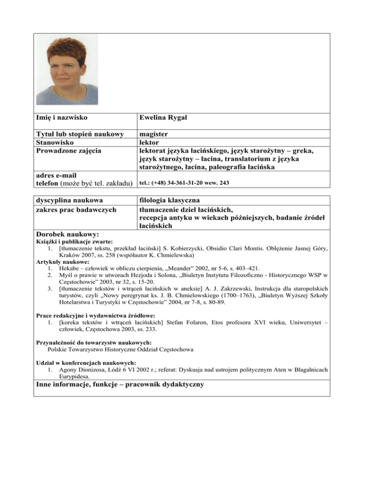 Imię i nazwisko Ewelina Rygał Tytuł lub stopień naukowy Stanowisko Prowadzone zajęcia magister lektor lektorat języka łacińskiego, język starożytny – greka, język starożytny – łacina, translatorium z języka starożytnego, łacina, paleografia łacińska adres e-mail telefon (może być tel. zakładu) tel.: (+48) 34-361-31-20 wew. 243 dyscyplina naukowa zakres prac badawczych filologia klasyczna tłumaczenie dzieł łacińskich, recepcja antyku w wiekach późniejszych, badanie źródeł łacińskich Dorobek naukowy: Książki i publikacje zwarte: 1. [tłumaczenie tekstu, przekład łaciński] S. Kobierzycki, Obsidio Clari Montis. Oblężenie Jasnej Góry, Kraków 2007, ss. 258 (współautor K. Chmielewska) Artykuły naukowe: 1. Hekabe – człowiek w obliczu cierpienia, „Meander” 2002, nr 5-6, s. 403–421. 2. Myśl o prawie w utworach Hezjoda i Solona, „Biuletyn Instytutu Filozoficzno - Historycznego WSP w Częstochowie” 2003, nr 32, s. 15-20. 3. [tłumaczenie tekstów i wtrąceń łacińskich w aneksie] A. J. Zakrzewski, Instrukcja dla staropolskich turystów, czyli „Nowy peregrynat ks. J. B. Chmielowskiego (1700–1763), „Biuletyn Wyższej Szkoły Hotelarstwa i Turystyki w Częstochowie” 2004, nr 7-8, s. 80-89. Prace redakcyjne i wydawnictwa źródłowe: 1. [koreka tekstów i wtrąceń łacińskich] Stefan Folaron, Etos profesora XVI wieku, Uniwersytet – człowiek, Częstochowa 2003, ss. 233. Przynależność do towarzystw naukowych: Polskie Towarzystwo Historyczne Oddział Częstochowa Udział w konferencjach naukowych: 1. Agony Dionizosa, Łódź 6 VI 2002 r.; referat: Dyskusja nad ustrojem politycznym Aten w Błagalnicach Eurypidesa. Inne informacje, funkcje – pracownik dydaktyczny