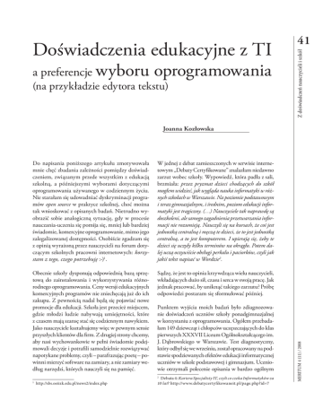 a preferencje wyboru oprogramowania (na przykładzie edytora tekstu) Z doświadczeń nauczycieli i szkół Doświadczenia edukacyjne z TI 41 Do napisania poniższego artykułu zmotywowała mnie chęć zbadania zależności pomiędzy doświadczeniem, związanym przede wszystkim z edukacją szkolną, a późniejszymi wyborami dotyczącymi oprogramowania używanego w codziennym życiu. Nie starałam się udowadniać dyskryminacji programów open source w praktyce szkolnej, choć można tak wnioskować z opisanych badań. Nietrudno wyobrazić sobie analogiczną sytuację, gdy w procesie nauczania-uczenia się pomija się, mniej lub bardziej świadomie, komercyjne oprogramowanie, mimo jego zalegalizowanej dostępności. Osobiście zgadzam się z opinią wyrażoną przez nauczycieli na forum dotyczącym szkolnych pracowni internetowych: korzystam z tego, czego potrzebuję :-). W jednej z debat zamieszczonych w serwisie internetowym „Debaty Certyfikowane” znalazłam niedawno zarzut wobec szkoły. Wypowiedź, która padła z sali, brzmiała: przez pryzmat dzieci chodzących do szkół mogłem widzieć, jak wygląda nauka informatyki w różnych szkołach w Warszawie. Na poziomie podstawowym i teraz gimnazjalnym, i średnim, poziom edukacji informatyki jest tragiczny. (…) Nauczyciele tak naprawdę są doszkoleni, ale samego zagadnienia przetwarzania informacji nie rozumieją. Nauczyli się na kursach, że coś jest jednostką centralną i męczą te dzieci, że to jest jednostką centralną, a to jest komputerem. I upierają się, żeby te dzieci się uczyły kilku terminów na okrągło. Potem dalej uczą oczywiście obsługi perkalu i paciorków, czyli jak jakiś tekst napisać w Wordzie. Obecnie szkoły dysponują odpowiednią bazą sprzętową do zainstalowania i wykorzystywania różnorodnego oprogramowania. Ceny wersji edukacyjnych komercyjnych programów nie zniechęcają już do ich zakupu. Z pewnością nadal będą się pojawiać nowe promocje dla edukacji. Szkoła jest przecież miejscem, gdzie młodzi ludzie nabywają umiejętności, które z czasem mają szansę stać się codziennym nawykiem. Jako nauczyciele kształtujemy więc w pewnym sensie przyszłych klientów dla firm. Z drugiej strony chcemy, aby nasi wychowankowie w pełni świadomie podejmowali decyzje i potrafili samodzielnie rozwiązywać napotykane problemy, czyli – parafrazując poetę – powinni mierzyć software na zamiary, a nie zamiary według narzędzi, których nauczyli się na pamięć. Sądzę, że jest to opinia krzywdząca wielu nauczycieli, wkładających dużo sił, czasu i serca w swoją pracę. Jak jednak pracować, by uniknąć takiego zarzutu? Próbę odpowiedzi postaram się sformułować później. Punktem wyjścia moich badań było zdiagnozowanie doświadczeń uczniów szkoły ponadgimnazjalnej w korzystaniu z oprogramowania. Ogółem przebadałam 149 dziewcząt i chłopców uczęszczających do klas pierwszych XXXVII Liceum Ogólnokształcącego im. J. Dąbrowskiego w Warszawie. Test diagnostyczny, który odbył się we wrześniu, został opracowany na podstawie spodziewanych efektów edukacji informatycznej uczniów w szkole podstawowej i gimnazjum. Uczniowie otrzymali polecenie opisania w bardzo ogólnym Debata 4: Kariera Specjalisty IT, czyli co czeka Informatyków za 10 lat? http://www.debatycertyfikowaneit.pl/page.php?id=7 http://sbs.oeiizk.edu.pl/news2/index.php MERITUM 4 (11) / 2008 Joanna Kozłowska Z doświadczeń nauczycieli i szkół 42 zarysie, jak wykonać prostą sieć komputerową, skonfigurować podstawowe ustawienia systemu operacyjnego i napisać nieskomplikowany kod w dowolnym języku programowania. Mieli także wykazać się wiedzą na temat tworzenia dokumentów w edytorze tekstu, prezentacji, prostych stron WWW i nieskomplikowanych obliczeń w arkuszu kalkulacyjnym. Jedynie relacyjne bazy danych mogły sprawić większe trudności. Wyniki testu diagnostycznego Legenda: S – sieć, SO – system operacyjny, ET – edytor tekstu, AK – arkusz kalkulacyjny, BD – bazy danych, HTML – html, PZ – prezentacja, PR – programowanie MERITUM 4 (11) / 2008 Z badań jednoznacznie wynika, że uczniowie dość dobrze znają edytory tekstu. Analizując wyniki, nie odkryłam ścisłej korelacji między profilem klas a umiejętnościami uczniów. Klasa 1a i 1b mają rozszerzone zajęcia edukacyjne z języka polskiego i historii. Klasa 1c to klasa językowa, 1f – biologiczno-chemiczna, a klasa1g – geograficzno-matematyczna. Interesujące jest to, że właśnie w klasach humanistycznych uczniowie lepiej od klas o innym profilu orientowali się w kodzie HTML czy też w językach programowania (najwięcej wskazań na LOGO, ale także na PHP, C++ i Turbo Pascal). Przeprowadziłam sześć lekcji o różnej tematyce, wykorzystując do rozwiązania podanych problemów zarówno MS Word, jak i OpenOffice Writer. Potem odbył się sprawdzian i po nim ankieta. Do ankiety przystąpiło 118 uczniów, z którymi udało mi się w pełni zrealizować zaplanowane lekcje dotyczące edytora tekstu. W ankiecie pytałam o rodzaj użytego edytora oraz powody, dla których ten właśnie edytor został użyty. Zgodnie z założeniami ewaluacji zamieściłam także pytanie: „Czy przeprowadzone na lekcjach ćwiczenia zachęciły Cię do stosowania oprogramowania open source?” Test diagnostyczny znajduje się na dołączonej do numeru płycie CD. 1. Z jakiego edytora tekstu korzystałeś pisząc sprawdzian? MS Word OpenOffice Writer Z doświadczeń nauczycieli i szkół 43 ANKIETA 2. Co zdecydowało o twoim wyborze? wybrany edytor jest łatwiejszy w obsłudze wybrany edytor daje więcej możliwości (jest bardziej funkcjonalny) wybrany edytor jest mi bardziej znany ze względu na wcześniejsze zastosowanie, doświadczenia (korzystałem z niego w domu, w szkole) 3. Czy przeprowadzone na lekcjach ćwiczenia zachęciły Cię do stosowania oprogramowania z rodziny Open Source? TAK NIE Oto wyniki ankie