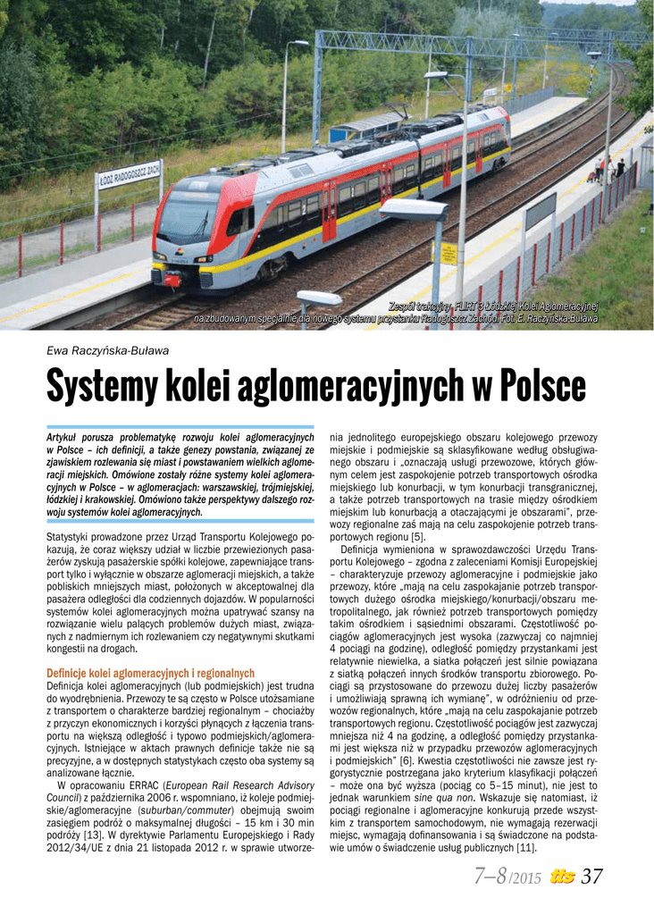Systemy transportowe Zespół trakcyjny FLIRT 3 Łódzkiej Kolei Aglomeracyjnej na zbudowanym specjalnie dla nowego systemu przystanku Radogoszcz Zachód. Fot. E. Raczyńska-Buława Ewa Raczyńska-Buława Systemy kolei aglomeracyjnych w Polsce Artykuł porusza problematykę rozwoju kolei aglomeracyjnych w Polsce – ich definicji, a także genezy powstania, związanej ze zjawiskiem rozlewania się miast i powstawaniem wielkich aglomeracji miejskich. Omówione zostały różne systemy kolei aglomeracyjnych w Polsce – w aglomeracjach: warszawskiej, trójmiejskiej, łódzkiej i krakowskiej. Omówiono także perspektywy dalszego rozwoju systemów kolei aglomeracyjnych. Statystyki prowadzone przez Urząd Transportu Kolejowego pokazują, że coraz większy udział w liczbie przewiezionych pasażerów zyskują pasażerskie spółki kolejowe, zapewniające transport tylko i wyłącznie w obszarze aglomeracji miejskich, a także pobliskich mniejszych miast, położonych w akceptowalnej dla pasażera odległości dla codziennych dojazdów. W popularności systemów kolei aglomeracyjnych można upatrywać szansy na rozwiązanie wielu palących problemów dużych miast, związanych z nadmiernym ich rozlewaniem czy negatywnymi skutkami kongestii na drogach. Definicje kolei aglomeracyjnych i regionalnych Definicja kolei aglomeracyjnych (lub podmiejskich) jest trudna do wyodrębnienia. Przewozy te są często w Polsce utożsamiane z transportem o charakterze bardziej regionalnym – chociażby z przyczyn ekonomicznych i korzyści płynących z łączenia transportu na większą odległość i typowo podmiejskich/aglomeracyjnych. Istniejące w aktach prawnych definicje także nie są precyzyjne, a w dostępnych statystykach często oba systemy są analizowane łącznie. W opracowaniu ERRAC (European Rail Research Advisory Council) z października 2006 r. wspomniano, iż koleje podmiejskie/aglomeracyjne (suburban/commuter) obejmują swoim zasięgiem podróż o maksymalnej długości – 15 km i 30 min podróży [13]. W dyrektywie Parlamentu Europejskiego i Rady 2012/34/UE z dnia 21 listopada 2012 r. w sprawie utworze- nia jednolitego europejskiego obszaru kolejowego przewozy miejskie i podmiejskie są sklasyfikowane według obsługiwanego obszaru i „oznaczają usługi przewozowe, których głównym celem jest zaspokojenie potrzeb transportowych ośrodka miejskiego lub konurbacji, w tym konurbacji transgranicznej, a także potrzeb transportowych na trasie między ośrodkiem miejskim lub konurbacją a otaczającymi je obszarami”, przewozy regionalne zaś mają na celu zaspokojenie potrzeb transportowych regionu [5]. Definicja wymieniona w sprawozdawczości Urzędu Transportu Kolejowego – zgodna z zaleceniami Komisji Europejskiej – charakteryzuje przewozy aglomeracyjne i podmiejskie jako przewozy, które „mają na celu zaspokajanie potrzeb transportowych dużego ośrodka miejskiego/konurbacji/obszaru metropolitalnego, jak również potrzeb transportowych pomiędzy takim ośrodkiem i sąsiednimi obszarami. Częstotliwość pociągów aglomeracyjnych jest wysoka (zazwyczaj co najmniej 4 pociągi na godzinę), odległość pomiędzy przystankami jest relatywnie niewielka, a siatka połączeń jest silnie powiązana z siatką połączeń innych środków transportu zbiorowego. Pociągi są przystosowane do przewozu dużej liczby pasażerów i umożliwiają sprawną ich wymianę”, w odróżnieniu od przewozów regionalnych, które „mają na celu zaspokajanie potrzeb transportowych regionu. Częstotliwość pociągów jest zazwyczaj mniejsza niż 4 na godzinę, a odległość pomiędzy przystankami jest większa niż w przypadku przewozów aglomeracyjnych i podmiejskich” [6]. Kwestia częstotliwości nie zawsze jest rygorystycznie postrzegana jako kryterium klasyfikacji połączeń – może ona być wyższa (pociąg co 5–15 minut), nie jest to jednak warunkiem sine qua non. Wskazuje się natomiast, iż pociągi regionalne i aglomeracyjne konkurują przede wszystkim z transportem samochodowym, nie wymagają rezerwacji miejsc, wymagają dofinansowania i są świadczone na podstawie umów o świadczenie usług publicznych [11]. 7–8 /2015 37 Systemy transportowe powstawania kolejnych osiedli deweloperów skuszonych niższymi cenami gruntów, indywidualnych domków jednorodzinnych, a także rozrostem miast satelickich, oferujących wyższą jakość zamieszkania – większe mieszkania i domy, zieleń, niższe koszty utrzymania. Wraz z tym trendem pojawiły się jednak także problemy z transportem. Dom czy mieszkanie pod miastem najczęściej wymagają posiadania przynajmniej jednego samochodu. Mieszkańcy stref podmiejskich, a także okolicznych wsi i miasteczek, pracują bowiem najczęściej w dalszym ciągu w jednym dużym mieście. System drogowo-parkingowy głównych ośrodków miejskich najczęściej nie jest już w stanie przyjąć zwiększonego ruchu samochodowego, co pociąga za sobą wszystkie negatywne zjawiska związane z kongestią w ruchu drogowym: zwiększone zanieczyszczenie powietrza, wydłużony czas dojazdu i związane z tym problemy (także społeczne, związane z siedzącym trybem życia, a także zmniejszeniem czasu dla siebie i dla rodziny). Jakość życia w miastach ulegała dalszemu pogorszeniu, na co wpływ miało zjawisko ucieczki do stref podmiejskich, a w efekcie ograniczanie przestrzeni miejskiej (niezbędnej dla ruchu drogowego i rosnącego zapotrzebowania na powierzchnie parkingowe) i zwiększanie zanieczyszczenia powietrza i zanieczyszczenia hałasem. Remedium na problemy transportowe związane z procesami urbanizacji niespodziewanie stała się kolej, dając możliwość szybkiego dotarcia nawet do centrum miasta bez problemów z szukaniem miejsca do parkowania i bez opóźnień. Wzorem dla tworzenia sieci kolei aglomeracyjnych stały się najstarsze systemy kolei podmiejskich S-Bahn w Berlinie, pamiętające jeszcze pierwszą poł. XX w., ale także RER w Par