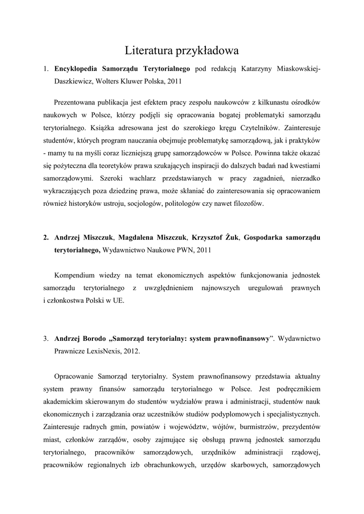 Literatura przykładowa 1. Encyklopedia Samorządu Terytorialnego pod redakcją Katarzyny MiaskowskiejDaszkiewicz, Wolters Kluwer Polska, 2011 Prezentowana publikacja jest efektem pracy zespołu naukowców z kilkunastu ośrodków naukowych w Polsce, którzy podjęli się opracowania bogatej problematyki samorządu terytorialnego. Książka adresowana jest do szerokiego kręgu Czytelników. Zainteresuje studentów, których program nauczania obejmuje problematykę samorządową, jak i praktyków - mamy tu na myśli coraz liczniejszą grupę samorządowców w Polsce. Powinna także okazać się pożyteczna dla teoretyków prawa szukających inspiracji do dalszych badań nad kwestiami samorządowymi. Szeroki wachlarz przedstawianych w pracy zagadnień, nierzadko wykraczających poza dziedzinę prawa, może skłaniać do zainteresowania się opracowaniem również historyków ustroju, socjologów, politologów czy nawet filozofów. 2. Andrzej Miszczuk, Magdalena Miszczuk, Krzysztof Żuk, Gospodarka samorządu terytorialnego, Wydawnictwo Naukowe PWN, 2011 Kompendium wiedzy na temat ekonomicznych aspektów funkcjonowania jednostek samorządu terytorialnego z uwzględnieniem najnowszych uregulowań prawnych i członkostwa Polski w UE. 3. Andrzej Borodo „Samorząd terytorialny: system prawnofinansowy”. Wydawnictwo Prawnicze LexisNexis, 2012. Opracowanie Samorząd terytorialny. System prawnofinansowy przedstawia aktualny system prawny finansów samorządu terytorialnego w Polsce. Jest podręcznikiem akademickim skierowanym do studentów wydziałów prawa i administracji, studentów nauk ekonomicznych i zarządzania oraz uczestników studiów podyplomowych i specjalistycznych. Zainteresuje radnych gmin, powiatów i województw, wójtów, burmistrzów, prezydentów miast, członków zarządów, osoby zajmujące się obsługą prawną jednostek samorządu terytorialnego, pracowników samorządowych, urzędników administracji rządowej, pracowników regionalnych izb obrachunkowych, urzędów skarbowych, samorządowych kolegiów odwoławczych, organów kontroli. W książce analizowane są takie zagadnienia, jak: teoretyczne aspekty systemu finansowego samorządu terytorialnego, podatki i opłaty samorządowe, udziały jednostek samorządu terytorialnego w podatkach, subwencje ogólne, dotacje celowe, wpłaty wyrównawcze, działalność gospodarcza samorządu, dług publiczny i deficyt budżetowy gmin, powiatów i województw, rodzaje, formy i podstawy prawne wydatków samorządowych, prawo dotyczące budżetu i procedury budżetowej samorządu, odpowiedzialność za naruszenie dyscypliny finansów publicznych, kontrola wewnętrzna i zewnętrzna w stosunku do samorządów, nadzór nad działalnością samorządową, źródła dochodów samorządu terytorialnego pochodzące z budżetu Unii Europejskiej. W pracy uwzględniono orzecznictwo Trybunału Konstytucyjnego, Sądu Najwyższego, sądów administracyjnych. 4. Samorząd terytorialny Podstawy ustroju i działalność – Izdebski Hubert, LexisNexis, 2010. Podręcznik stanowi kompleksowe, uwzględniające także problematykę mienia i finansów, opracowanie prawnych podstaw organizacji i działalności samorządu terytorialnego. Łączy on wątki ogólnodoktrynalne, w tym konstytucyjne, porównawcze i historyczne z treścią obowiązującego prawa jako „prawa w działaniu”. W pracy omówiono również konstytucyjne prawo obywateli do informacji publicznej oraz problematykę etyki w działalności samorządu. Przytoczono aktualne orzecznictwo Trybunału Konstytucyjnego, Sądu Najwyższego i sądów administracyjnych oraz wiele rozstrzygnięć nadzorczych. Korzystanie z podręcznika ułatwia skorowidz rzeczowy. Opracowanie przeznaczone jest dla studentów prawa, administracji i studiów samorządu terytorialnego, a także dla praktyków zarówno pełniących funkcje w organach i urzędach samorządu terytorialnego oraz w organach nadzoru, jak i świadczących pomoc prawną w tym zakresie. 5. Kazimierz Bandarzewski, Paweł Chmielnicki, Wiesław Kisiel „Prawo samorządu terytorialnego w Polsce”. Wydawnictwo prawnicze LexisNexis, Rok wydania: 2011. Podręcznik jest adresowany do studentów prawa i administracji oraz zainteresowanych praktyków. W książce są omówione wszystkie kluczowe zagadnienia polskiego samorządu terytorialnego: struktura władz, procedury uchwałodawcze, pełnomocnictwo administracyjne i przenoszenie kompetencji, nadzór administracyjny i sądowa kontrola samorządu. Autorzy odwołują się zarówno do Konstytucji RP, Europejskiej Karty Samorządu Lokalnego, ustaw, jak i do prawa miejscowego. W szerokim zakresie wykorzystali orzecznictwo TK, SN i sądów administracyjnych. Wyeksponowali zarówno cechy wspólne samorządu gminnego, powiatowego i wojewódzkiego, jak i różnice między nimi. Autorzy krytycznie oceniają działalność prawodawcy, podsuwając mu propozycje szczegółowych korekt, sprzyjających decentralizowaniu administracji publicznej, i wspierania zalążków społeczeństwa obywatelskiego. 5. Dochody budżetu jednostek samorządu terytorialnego Andrzej Niezgoda, Antoni Hanusz, Piotr Czerski Dochody budżetu jednostek samorządu terytorialnego opis książki: Realizowanie przez samorząd terytorialny ciążących na nim zadań uzależnione jest od zapewnienia mu dostatecznych źródeł finansowania. Celowi temu powinien służyć odpowiednio funkcjonujący system dochodów, jemu właśnie poświęcone jest niniejsze opracowanie. Zawiera ono omówienie przepisów regulujących podatki, opłaty i inne źródła dochodów własnych gmin, powiatów oraz województw samorządowych, a także subwencje ogólne i dotacje celowe, jakie otrzymują. Znajomość tej problematyki jest ważna nie tylko z punktu widzenia sprawnego realizowania dochodów samorządowych, lecz także obowiązków spoczywających na podatnikach, płatnikach i inkasentach. Konstytucja Rzeczpospolitej Polskiej z dnia 2 kwietnia 1997,( D