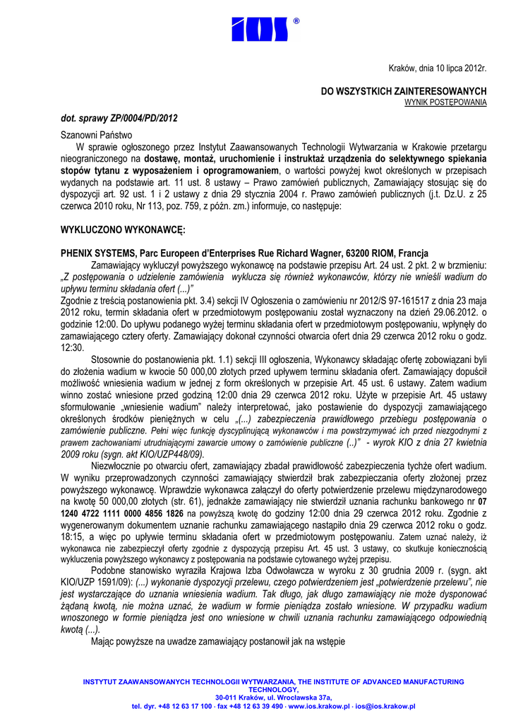 Wynik postępowania - Instytut Zaawansowanych Technologii