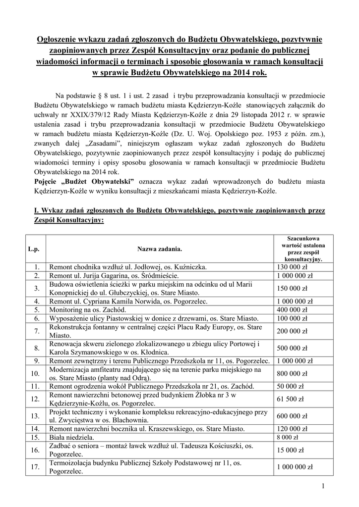 Ogłoszenie wykazu zadań zgłoszonych do Budżetu Obywatelskiego, pozytywnie zaopiniowanych przez Zespół Konsultacyjny oraz podanie do publicznej wiadomości informacji o terminach i sposobie głosowania w ramach konsultacji w sprawie Budżetu Obywatelskiego na 2014 rok. Na podstawie § 8 ust. 1 i ust. 2 zasad i trybu przeprowadzania konsultacji w przedmiocie Budżetu Obywatelskiego w ramach budżetu miasta Kędzierzyn-Koźle stanowiących załącznik do uchwały nr XXIX/379/12 Rady Miasta Kędzierzyn-Koźle z dnia 29 listopada 2012 r. w sprawie ustalenia zasad i trybu przeprowadzania konsultacji w przedmiocie Budżetu Obywatelskiego w ramach budżetu miasta Kędzierzyn-Koźle (Dz. U. Woj. Opolskiego poz. 1953 z późn. zm.), zwanych dalej „Zasadami”, niniejszym ogłaszam wykaz zadań zgłoszonych do Budżetu Obywatelskiego, pozytywnie zaopiniowanych przez zespół konsultacyjny i podaję do publicznej wiadomości terminy i opisy sposobu głosowania w ramach konsultacji w przedmiocie Budżetu Obywatelskiego na 2014 rok. Pojęcie „Budżet Obywatelski” oznacza wykaz zadań wprowadzonych do budżetu miasta Kędzierzyn-Koźle w wyniku konsultacji z mieszkańcami miasta Kędzierzyn-Koźle. I. Wykaz zadań zgłoszonych do Budżetu Obywatelskiego, pozytywnie zaopiniowanych przez Zespół Konsultacyjny: L.p. 1. 2. 3. 4. 5. 6. 7. 8. 9. 10. 11. 12. 13. 14. 15. 16. 17. Nazwa zadania. Remont chodnika wzdłuż ul. Jodłowej, os. Kuźniczka. Remont ul. Jurija Gagarina, os. Śródmieście. Budowa oświetlenia ścieżki w parku miejskim na odcinku od ul Marii Konopnickiej do ul. Głubczyckiej, os. Stare Miasto. Remont ul. Cypriana Kamila Norwida, os. Pogorzelec. Monitoring na os. Zachód. Wyposażenie ulicy Piastowskiej w donice z drzewami, os. Stare Miasto. Rekonstrukcja fontanny w centralnej części Placu Rady Europy, os. Stare Miasto. Renowacja skweru zielonego zlokalizowanego u zbiegu ulicy Portowej i Karola Szymanowskiego w os. Kłodnica. Remont zewnętrzny i terenu Publicznego Przedszkola nr 11, os. Pogorzelec. Modernizacja amfiteatru znajdującego się na terenie parku miejskiego na os. Stare Miasto (planty nad Odrą). Remont ogrodzenia wokół Publicznego Przedszkola nr 21, os. Zachód. Remont nawierzchni betonowej przed budynkiem Żłobka nr 3 w Kędzierzynie-Koźlu, os. Pogorzelec. Projekt techniczny i wykonanie kompleksu rekreacyjno-edukacyjnego przy ul. Zwycięstwa w os. Blachownia. Remont nawierzchni bocznika ul. Kraszewskiego, os. Stare Miasto. Biała niedziela. Zadbać o seniora – montaż ławek wzdłuż ul. Tadeusza Kościuszki, os. Pogorzelec. Termoizolacja budynku Publicznej Szkoły Podstawowej nr 11, os. Pogorzelec. Szacunkowa wartość ustalona przez zespół konsultacyjny. 130 000 zł 1 000 000 zł 150 000 zł 1 000 000 zł 400 000 zł 100 000 zł 200 000 zł 500 000 zł 1 000 000 zł 800 000 zł 50 000 zł 61 500 zł 600 000 zł 120 000 zł 8 000 zł 15 000 zł 1 000 000 zł 1 18. 19. 20. 21. 22. 23. 24. 25. 26. 27. 28. 29. 30. 31. 32. 33. Odnowienie i renowacja placu zabaw przy ul. Barbary, os. Cisowa. Budowa parku linowego w Parku Orderu Uśmiechu, os. Śródmieście. Organizacja festynu i targów żywności ekologicznej w Kłodnicy z okazji 200 rocznicy zniesienia pańszczyzny. Utworzenie Centrum Integracji Społecznej „CIS Ziemi Kozielskiej”. Budowa mini skateparku przy Zespole Szkół Miejskich nr 5, os. Azoty. Budowa kozielskiej sieci placów do fitnessu na zewnątrz i placów zabaw, os. Południe, Stare Miasto, Zachód i Rogi. Uporządkowanie położonej na gruncie stanowiącym własność Gminy części starego, zabytkowego cmentarza, znajdującego się u zbiegu ul. Głubczyckiej i Raciborskiej w osiedlu Południe. Budowa chodnika przy ul. Krokusów, os. Pogorzelec. Remont chodników w os. Kuźniczka. Utworzenie bezpłatnej sieci bezprzewodowego Internetu poprzez punkty hot spot oraz monitoringu miejskiego na terenie os. Sławięcice, Miejsce Kłodnickie, Cisowa, Lenartowice, Przyjaźni. Budowa ogrodzonego wybiegu dla psów, os. Stare Miasto. Modernizacja terenu rekreacyjno-sportowego przy ul. Wieczorka poprzez budowę nowego placu zabaw, stworzenie strefy fitness, budowę zjeżdżalni na górce oraz objęcie terenu monitoringiem., os. Piastów. Budowa kociarni z wolnym wybiegiem w Miejskim Schronisku dla Bezdomnych Zwierząt w Kędzierzynie-Koźlu. Budowa fontanny w Parku Pojednania, os. Śródmieście. Kamery internetowe, jako narzędzie wspierające promocję miasta Kędzierzyn-Koźle. Budowa pomnika poświęconego Marszałkowi Józefowi Piłsudskiemu Naczelnikowi Państwa Polskiego na placu Rady Europy, os. Stare Miasto. 25 000 zł 800 000 zł 90 000 zł 175 000 zł 150 000 zł 1 000 000 zł 25 000 zł 70 000 zł 900 000 zł 1 000 000 zł 150 000 zł 750 000 zł 500 000 zł 970 000 zł 14 000 zł 300 000 zł Szczegółowy opis pozytywnie zaopiniowanych przez Zespół Konsultacyjny zadań, poddanych pod głosowanie, zawiera załącznik do niniejszego ogłoszenia. II. Terminy głosowania w ramach konsultacji w sprawie Budżetu Obywatelskiego na 2014 rok. 1. Terminy konsultacji w lokalach konsultacyjnych zlokalizowanych w siedzibach Rad Osiedli i Urzędzie Miasta Kędzierzyn-Koźle: L.p. Teren objęty konsultacjami Siedziba Termin konsultacji Godziny ul. Ludwika Waryńskiego 1-3 2 kwietnia 2014 r. 17.00-19.00 ul. Wyzwolenia 7b 2 kwietnia 2014 r. 17.00-19.00 ul. Jana Brzechwy 78 3 kwietnia 2014 r. 17.00-19.00 ul. Kłodnicka 38a 3 kwietnia 2014 r. 17.00-19.00 1. Azoty 2. Blachownia 3. Cisowa 4. Kłodnica 5. Kuźniczka ul. Grunwaldzka 83 9 kwietnia 2014 r. 17.00-19.00 6. Lenartowice ul. Nowowiejska 23 9 kwietnia 2014 r. 17.00-19.00 2 7. Miejsce Kłodnickie ul. Szpaków 11 10 kwietnia 2014 r. 17.00-19.00 8. Pogorzelec ul. Piotra Skargi 38/I 15 kwietnia 2014 r. 17.00-19.00 9. Południe ul. Władysława Planetorza 1 15 kwietnia 2014 r. 17.00-19.00 10. Przyjaźni ul. Szkolna 3 16 kwietnia 2014 r. 17.00-19.00 11. Rogi ul. Główna 54 16 kwietnia 2014 r. 17.00-19.