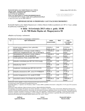 Komornik Sądowy przy Sądzie Rejonowym w Zabrzu Marcin Gołda - Kancelaria Komornicza w Zabrzu 41-800 Zabrze ul. Wolności 345 tel. 32 777 21 39, 728 559 512 konto: ING Bank Śląski SA 29105012981000009091004128 www.komornik-zabrze.com.pl, e-mail: [email protected] W odpowiedzi podać sygn.akt: KM Zabrze dnia 2013-03-28 r. 1442/13 OBWIESZCZENIE O PIERWSZEJ LICYTACJI RUCHOMOŚCI Komornik Sądowy przy Sądzie Rejonowym w Zabrzu Marcin Gołda na podstawie art. 867 § 1 k.p.c. podaje do publicznej wiadomości, że w dniu 16 kwietnia 2013 roku o godz. 10.00 w 41-700 Ruda Śląska ul. Magazynowa 50 odbędzie się licytacja ruchomości. Przedmiotem licytacji są następujące ruchomości: l.p. opis ruchomości 1. 4. wózek ręczny paletowy (tzw. paleciak), udźwig 2200 kg Akumulatorowy unoszący wózek widłowy elektryczny Jungheinrich EJC 110, nr 90370679 Akumulatorowy unoszący wózek widłowy Jungheinrich EJC 110, nr 90360738 wózek paletowy Tram, model SDJ 1000 5. drukarka wielofunkcyjna HP CM 2320 fximfp 6. drukarka hp 1320 N 7. urządzenie wielofunkcyjne HP CM 1415 FN 8. drukarka atramentowa HP , seria CN 978BQ019 9. monitor komputerowy LG, model E1940S 10. samochód osobowy Fiat Panda rok prod 2003 2. 3. suma oszacowania 150,00 zł brutto za szt. 7.500,00 zł brutto 7.500,00 zł brutto 200,00zł brutto 450,00zł brutto 50,00 zł brutto 300,00 zł brutto 50,00 zł brutto 50,00 zł brutto 4.000,00 zł brutto ilość 3,00 1,00 1,00 1,00 1,00 1,00 1,00 1,00 1,00 1,00 cena wywołania brutto 112,50 zł brutto za szt. 5625,00 zł brutto 5625,00 zł brutto 150,00 zł brutto 337,50 zł brutto 37,50 zł brutto 225,00 zł brutto 37,50 zł brutto 37,50 zł brutto 3.000,00 zł brutto Ruchomości można oglądać w miejscu licytacji przed rozpoczęciem licytacji. Licytacja może zostać odwołana bez podania przyczyny. Komornik Sądowy w oparciu o art.18 ustawy z dnia 11 marca 2004r o podatku od towarów i usług (Dz.U. Nr 54, poz.535) wystawia faktury VAT. Jeżeli drzwi będą zamknięte, będą otwierane na koszt i odpowiedzialność dłużnika. Przystępujący do przetargu obowiązany jest złożyć rękojmię w wysokości 1/10 części sumy oszacowania. Rękojmię złożoną przez licytanta, któremu udzielono przybicia, zatrzymuje się; pozostałym licytantom rękojmię zwraca się niezwłocznie. Jeżeli nabywca nie wykonał w terminie warunków licytacji co do zapłaty ceny, traci rękojmię, a skutki przybicia wygasają. Z utraconej rękojmi pokrywa się koszty egzekucji związanej ze sprzedażą, a reszta wchodzi w skład sumy uzyskanej w egzekucji albo jeżeli egzekucja została umorzona jest przelewana na dochód Skarbu Państwa (art. 867 ze zn 1 K.p.c). Aplikant Agnieszka Błasik Asesor Robert Łukasiak Komornik Sądowy Marcin Gołda