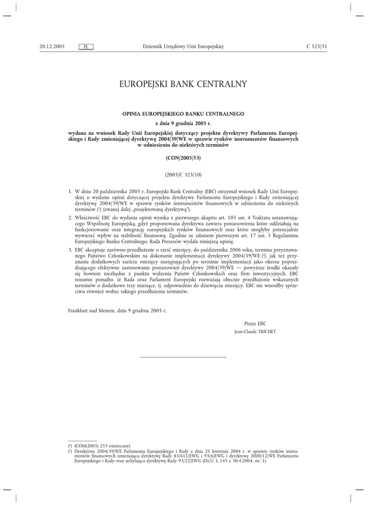 20.12.2005 PL Dziennik Urzędowy Unii Europejskiej C 323/31 EUROPEJSKI BANK CENTRALNY OPINIA EUROPEJSKIEGO BANKU CENTRALNEGO z dnia 9 grudnia 2005 r. wydana na wniosek Rady Unii Europejskiej dotyczący projektu dyrektywy Parlamentu Europejskiego i Rady zmieniającej dyrektywę 2004/39/WE w sprawie rynków instrumentów finansowych w odniesieniu do niektórych terminów (CON/2005/53) (2005/C 323/10) 1. W dniu 20 października 2005 r. Europejski Bank Centralny (EBC) otrzymał wniosek Rady Unii Europejskiej o wydanie opinii dotyczącej projektu dyrektywy Parlamentu Europejskiego i Rady zmieniającej dyrektywę 2004/39/WE w sprawie rynków instrumentów finansowych w odniesieniu do niektórych terminów (1) (zwanej dalej „projektowaną dyrektywą”). 2. Właściwość EBC do wydania opinii wynika z pierwszego akapitu art. 105 ust. 4 Traktatu ustanawiającego Wspólnotę Europejską, gdyż proponowana dyrektywa zawiera postanowienia które oddziałują na funkcjonowanie oraz integrację europejskich rynków finansowych oraz które mogłyby potencjalnie wywierać wpływ na stabilność finansową. Zgodnie ze zdaniem pierwszym art. 17 ust. 5 Regulaminu Europejskiego Banku Centralnego, Rada Prezesów wydała niniejszą opinię. 3. EBC akceptuje zarówno przedłużenie o sześć miesięcy, do października 2006 roku, terminu przyznawanego Państwo Członkowskim na dokonanie implementacji dyrektywy 2004/39/WE (2), jak też przyznanie dodatkowych sześciu miesięcy następujących po terminie implementacji jako okresu poprzedzającego efektywne zastosowanie postanowień dyrektywy 2004/39/WE — powyższe środki okazały się bowiem niezbędne z punktu widzenia Państw Członkowskich oraz firm inwestycyjnych. EBC rozumie ponadto. iż Rada oraz Parlament Europejski rozważają obecnie przedłużenie wskazanych terminów o dodatkowe trzy miesiące, tj. odpowiednio do dziewięciu miesięcy. EBC nie wnosiłby sprzeciwu również wobec takiego przedłużenia terminów. Frankfurt nad Menem, dnia 9 grudnia 2005 r. Prezes EBC Jean-Claude TRICHET (1) (COM(2005) 253 ostateczny). (2) Dyrektywa 2004/39/WE Parlamentu Europejskiego i Rady z dnia 21 kwietnia 2004 r. w sprawie rynków instrumentów finansowych zmieniająca dyrektywę Rady 85/611/EWG i 93/6/EWG i dyrektywę 2000/12/WE Parlamentu Europejskiego i Rady oraz uchylająca dyrektywę Rady 93/22/EWG (Dz.U. L 145 z 30.4.2004, str. 1).