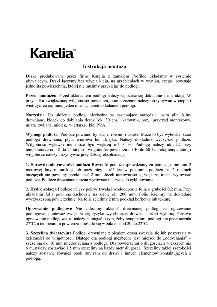 Instrukcja montaŜu Deskę produkowaną przez firmę Karelia z zamkiem Profiloc układamy w systemie pływającym. Deski łączymy bez uŜycia kleju, na grzebieniach w wyniku, czego powstaje jednolita powierzchnia, której nie musimy przyklejać do podłogi. Przed montaŜem Przed układaniem podłogi naleŜy zapoznać się dokładnie z instrukcją. W przypadku zwiększonej wilgotności powietrza, pomieszczenie naleŜy utrzymywać w cieple i wietrzyć, co najmniej jeden miesiąc przed układaniem podłogi. Narzędzia Do ułoŜenia podłogi niezbędne są następujące narzędzia: ostra piła, kliny drewniane, klocek do dobijania desek (ok. 30 cm.), kątownik, nóŜ, przyrząd montaŜowy, miara zwijana, młotek, wiertarka, klej PVA. Wymogi podłoŜa PodłoŜe powinno by suche, równe i trwałe. MoŜe to być wylewka, stara podłoga drewniana, płyta wiórowa lub sklejka. NaleŜy dokładnie wyczyścić podłoŜe. Wilgotność wylewki nie moŜe być większą niŜ 3 %. Podłogę naleŜy układać przy temperaturze od 18 do 24 stopni i wilgotności powietrza od 40 do 60 %. Taką temperaturą i wilgotność naleŜy utrzymywać przy dalszej eksploatacji. 1. Sprawdzanie równości podłoŜa Równość podłoŜa sprawdzamy za pomocą minimum 2 metrowej łaty murarskiej lub poziomicy - róŜnice w poziomie podłoŜa na 2 metrach bieŜących nie powinny przekraczać 2 mm. JeŜeli nierówności są większe, trzeba wyrównać podłoŜe. PodłoŜe drewniane moŜna wyrównać maszyną do cyklinowania. 2. Hydroizolacja PodłoŜe naleŜy pokryć trwałą i wodoodporna folią o grubości 0,2 mm. Przy układaniu folia powinna zachodzić na siebie ok. 200 mm. Folie ścielimy na dokładnie wyczyszczoną powierzchnie. Na folie ścielimy 2 mm podkład korkowy lub tekturę. Ogrzewanie podłogowe Nie zalecamy układać drewnianej podłogi na ogrzewanie podłogowe, poniewaŜ zwiększa się ryzyko wyschnięcia drewna. JeŜeli wybiorą Państwo ogrzewanie podłogowe, to naleŜy pamiętać o tym, Ŝeby temperatura podłogi nie przekraczała 27°C, a temperatura powietrza mieściła się w zakresie od 20 do 22°C. 3. Szczelina dylatacyjna Podłogi drewniane z biegiem czasu zwęŜają się lub poszerzają w zaleŜności od wilgotności. Dlatego dla podłogi niezbędne jest miejsce do „oddychania” – szczelina ok. 10 mm między ścianą a podłogą. Dla powierzchni o długościach większych niŜ 6 m, naleŜy zostawiać 1,5 mm szczeliny na kaŜdy metr długości. Szczeliny takiej szerokości naleŜy zostawić równieŜ obok rur, ram od drzwi i innych elementów kontaktujących z podłogą. 4. Wybór kierunku montaŜu. Zalecamy układanie podłogi wzdłuŜ kierunku padania promieni słonecznych, czyli prostopadle do okna w pomieszczeniu. JeŜeli podłoŜe składa się z desek, to naleŜy układać w poprzek desek istniejącego podłoŜa. 5. Układanie podłogi Deski są łączone ze sobą przy pomocy zamka Profiloc, pióro jest wkładane we wpust, bez uŜycia kleju. Nie naleŜy wykorzystywać docinków desek jako narzędzia do montaŜu. NaleŜy unikać uderzenia po piórze zamka. Drewno – jest materiałem naturalnym, z przyrodnimi wahaniami koloru i tekstury, dlatego wygląd zewnętrzny kaŜdej deski jest unikalny. NaleŜy odłoŜyć i nie wykorzystywać deski uszkodzone lub z widocznym defektem (np. uszkodzone w transporcie lub bardzo róŜniące się kolorem) 6. Poprzeczne łączenie desek NaleŜy uwaŜać na to, aby odległość między poprzecznym łączeniem dwóch sąsiadujących rzędów była nie mniejsza niŜ 50 cm. 7. Rury W odpowiednim miejscu naleŜy wywiercić otwór w podłoŜu, rozmiar powinien być większy, co najmniej o 20 mm od rozmiaru rury. NaleŜy wyciąć kawałek deski między krajem a otworem pod rurę. UłoŜyć deskę i wkleić wycięty kawałek na miejsce. NaleŜy zamaskować powstały otwór odpowiednim pierścieniem. 8. Ostatni rząd NaleŜy dociąć ostatni rząd desek o odpowiedniej szerokości. Delikatnie wstawić ostatnia deskę na miejsce przy pomocy przyrządu montaŜowego. NaleŜy uwaŜać na to, aby nie uszkodzić ściany. Następnie wstawić drewniane kliny w szczelinę dylatacyjną. 9. Prace końcowe Po zakończeniu montaŜu naleŜy powyjmować wszystkie kliny ze szczeliny dylatacyjnej i zamocować listwę o szerokości, co najmniej 12mm. Listwę montuje się tylko do ściany. Przy konieczności naleŜy wykorzystać odpowiednia szpachlę, w Ŝadnym innych prac wypadku nie naleŜy stosować sylikonu. NaleŜy chronić podłogę od wykończeniowych w pomieszczeniu, gdzie ułoŜyliśmy podłogę. NaleŜy sprawdzić, czy pomieszczenie jest dobrze wentylowane i wilgoć od materiałów budowlanych nie uszkodzi nowej podłogi. W nowo budowanych obiektach mieszkalnych układanie podłogi powinno być wykonywane na końcu. Dodatkową informację moŜna uzyskać u sprzedawcy podłóg. Uwaga. Oferowana deska z fabryki Karelia jest gotowym do wykorzystania produktem. Reklamacje są uwzględniane do momentu ułoŜenia parkietu na podłogę. Konserwacja i pielęgnacja deski z systemem Profiloc Deska Profiloc jest pokryta 5 warstwami nieścieralnego lakieru, niezawierającego formaldehydów. śeby podłoga zawsze była w dobrym stanie, zalecamy stosowanie się do naszych instrukcji. Temperatura i wilgotność pomieszczenia. Drewno poszerza i zwęŜa się razem ze zmiana wilgotności powietrza. Dlatego bardzo waŜnym elementem jest utrzymywanie wilgotności powietrza w granicach 40% - 60%, i temperatury w granicach od 18 do 24 °C. JeŜeli warunki w pomieszczeniu róŜnią się od zalecanych zmiana rozmiarów jest nieunikniona. Producent, montaŜysta i sprzedawca nie mogą ponosić odpowiedzialności za niezastosowanie się do tych wymogów. śeby zminimalizować wahania wilgotności, zalecamy w okresie grzewczym wykorzystywać nawilŜacz powietrza, a dla zmniejszenia wilgotności w wilgotnych okresach wykorzystywać wentylacje lub klimatyzatory. Sprzątanie NaleŜy unikać nanoszenia pias