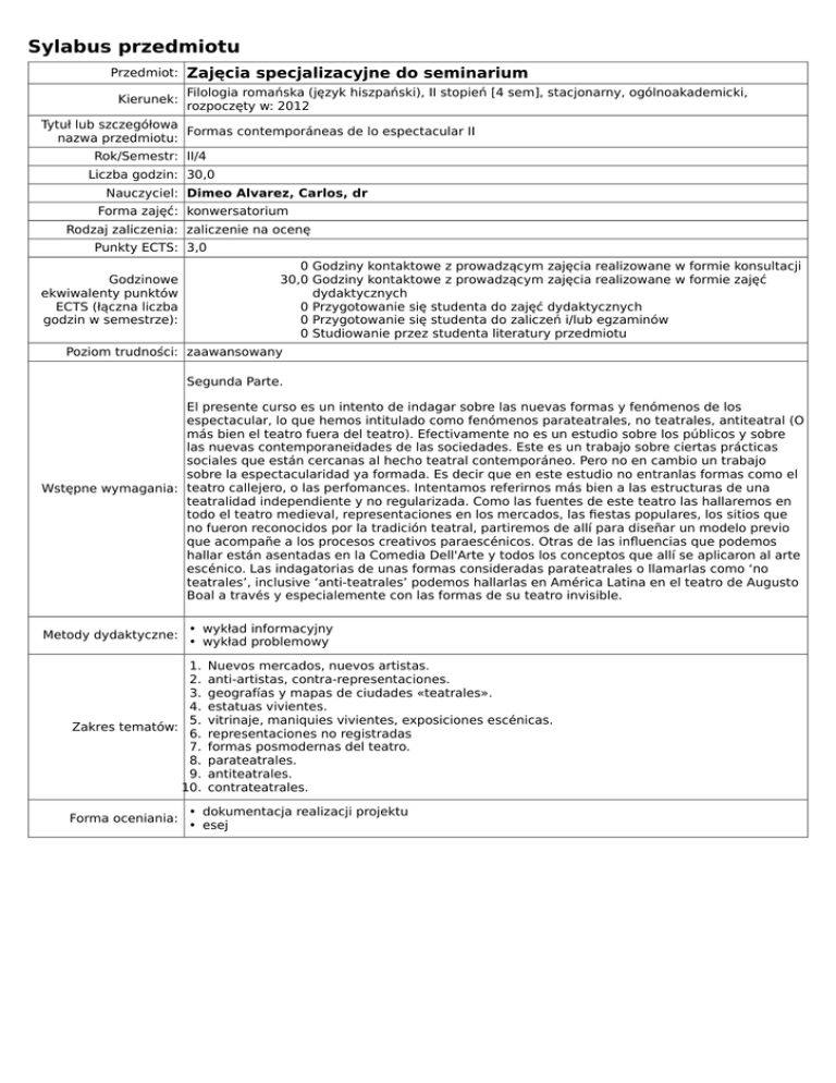 Sylabus przedmiotu Przedmiot: Zajęcia specjalizacyjne do seminarium Filologia romańska (język hiszpański), II stopień [4 sem], stacjonarny, ogólnoakademicki, Kierunek: rozpoczęty w: 2012 Tytuł lub szczegółowa Formas contemporáneas de lo espectacular II nazwa przedmiotu: Rok/Semestr: II/4 Liczba godzin: 30,0 Nauczyciel: Dimeo Alvarez, Carlos, dr Forma zajęć: konwersatorium Rodzaj zaliczenia: zaliczenie na ocenę Punkty ECTS: 3,0 0 Godziny kontaktowe z prowadzącym zajęcia realizowane w formie konsultacji 30,0 Godziny kontaktowe z prowadzącym zajęcia realizowane w formie zajęć dydaktycznych 0 Przygotowanie się studenta do zajęć dydaktycznych 0 Przygotowanie się studenta do zaliczeń i/lub egzaminów 0 Studiowanie przez studenta literatury przedmiotu Godzinowe ekwiwalenty punktów ECTS (łączna liczba godzin w semestrze): Poziom trudności: zaawansowany Segunda Parte. El presente curso es un intento de indagar sobre las nuevas formas y fenómenos de los espectacular, lo que hemos intitulado como fenómenos parateatrales, no teatrales, antiteatral (O más bien el teatro fuera del teatro). Efectivamente no es un estudio sobre los públicos y sobre las nuevas contemporaneidades de las sociedades. Este es un trabajo sobre ciertas prácticas sociales que están cercanas al hecho teatral contemporáneo. Pero no en cambio un trabajo sobre la espectacularidad ya formada. Es decir que en este estudio no entranlas formas como el Wstępne wymagania: teatro callejero, o las perfomances. Intentamos referirnos más bien a las estructuras de una teatralidad independiente y no regularizada. Como las fuentes de este teatro las hallaremos en todo el teatro medieval, representaciones en los mercados, las fiestas populares, los sitios que no fueron reconocidos por la tradición teatral, partiremos de allí para diseñar un modelo previo que acompañe a los procesos creativos paraescénicos. Otras de las influencias que podemos hallar están asentadas en la Comedia Dell'Arte y todos los conceptos que allí se aplicaron al arte escénico. Las indagatorias de unas formas consideradas parateatrales o llamarlas como ‘no teatrales’, inclusive ‘anti-teatrales’ podemos hallarlas en América Latina en el teatro de Augusto Boal a través y especialemente con las formas de su teatro invisible. Metody dydaktyczne: • wykład informacyjny • wykład problemowy 1. 2. 3. 4. 5. Zakres tematów: 6. 7. 8. 9. 10. Forma oceniania: Nuevos mercados, nuevos artistas. anti-artistas, contra-representaciones. geografías y mapas de ciudades «teatrales». estatuas vivientes. vitrinaje, maniquies vivientes, exposiciones escénicas. representaciones no registradas formas posmodernas del teatro. parateatrales. antiteatrales. contrateatrales. • dokumentacja realizacji projektu • esej Arrabal, F.,Taylor, D. (1984).El cementerio de automóviles; El arquitecto y el emperador de Asiria . Madrid: Cátedra. Arrabal, F.,Taylor, D. (2007).El cementerio de automóviles. El Arquitecto y el Emperador de Asiria (6 ed.). Madrid;: Cátedra. Bartis, R.,Dubatti, J. A. (2003).Cancha con niebla: teatro perdido, fragmentos(1* ed ed.). Buenos Aires: Atuel. Cañizares Bundorf, N., Abellan, J., Pascual Bonis, M. T., Fernández Torres, A., Cracio, J.,Pavis, P. (1995).Análisis de la puesta en escena. Madrid: Asociación de Directores de Escena. Carlson, M. (1993).Deathtraps the portmodern comedy thriller. Bloomington: Indiana University Press. Carlson, M.,Bettendorf, P. (2009).El teatro como máquina de la memoria: los fantasmas de la escena. [Buenos Aires]: Ediciones Artes del Sur. Cura, M., Dubatti, J., Daulte, J.,Ramos, M. (1994). Así se mira el teatro hoy: selección de obras. Buenos Aires: Beas Ediciones. Literatura: Dubatti, J.,Alifano, R. (1999).Acerca de Borges: ensayos de poética, política y literatura comparada. Capital Federal [i.e. Buenos Aires]: Editorial de Belgrano. Dubatti, J. A. (1995).Batato Barea y el nuevo teatro argentino. Buenos Aires: Temas de Hoy. Pavis, P. (2003).Analyzing performance: theater, dance, and film. Ann Arbor: University of Michigan Press. Pavis, P.,Pascual, M. (2003).¿De dónde viene la puesta en escena y hacia dónde va? Pamplona: Escuela Navarra de Teatro. Pavis, P., Shantz, C.,Carlson, M. (1998).Dictionary of the theatre: terms, concepts and analysis . Toronto; Buffalo: University of Toronto Press. Sanchís Sinisterra, J., Pavis, P., Amo Sánchez, A.,Instituto Cervantes De Toulouse. (2003). Conspiración carmín = Conspiración vermeille; Sangre lunar = Sang de lune . Toulouse: Instituto Cervantes. Taylor, D. (1997).Disappearing acts : spectacles of gender and nationalism in Argentina's Dirty War. Durham ; London: Duke University Press. Ubersfeld, A.,Pavis, P. (1900).Confluences: le dialogue des cultures dans les spectacles contemporains: essais en l'honneur d'Anne Ubersfeld . Saint Cyr: Bois Robert.
