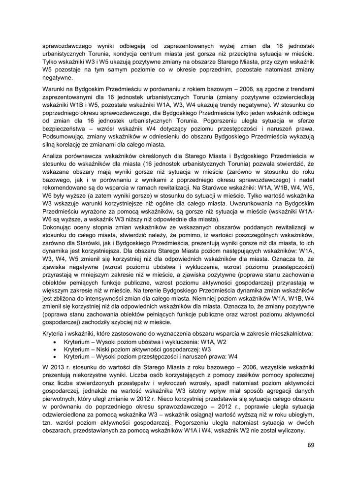 sprawozdawczego wyniki odbiegają od zaprezentowanych wyżej zmian dla 16 jednostek urbanistycznych Torunia, kondycja centrum miasta jest gorsza niż przeciętna sytuacja w mieście. Tylko wskaźniki W3 i W5 ukazują pozytywne zmiany na obszarze Starego Miasta, przy czym wskaźnik W5 pozostaje na tym samym poziomie co w okresie poprzednim, pozostałe natomiast zmiany negatywne. Warunki na Bydgoskim Przedmieściu w porównaniu z rokiem bazowym – 2006, są zgodne z trendami zaprezentowanymi dla 16 jednostek urbanistycznych Torunia (zmiany pozytywne odzwierciedlają wskaźniki W1B i W5, pozostałe wskaźniki W1A, W3, W4 ukazują trendy negatywne). W stosunku do poprzedniego okresu sprawozdawczego, dla Bydgoskiego Przedmieścia tylko jeden wskaźnik odbiega od zmian dla 16 jednostek urbanistycznych Torunia. Pogorszeniu uległa sytuacja w sferze bezpieczeństwa – wzrósł wskaźnik W4 dotyczący poziomu przestępczości i naruszeń prawa. Podsumowując, zmiany wskaźników w odniesieniu do obszaru Bydgoskiego Przedmieścia wykazują silną korelację ze zmianami dla całego miasta. Analiza porównawcza wskaźników określonych dla Starego Miasta i Bydgoskiego Przedmieścia w stosunku do wskaźników dla miasta (16 jednostek urbanistycznych Torunia) pozwala stwierdzić, że wskazane obszary mają wyniki gorsze niż sytuacja w mieście (zarówno w stosunku do roku bazowego, jak i w porównaniu z wynikami z poprzedniego okresu sprawozdawczego) i nadal rekomendowane są do wsparcia w ramach rewitalizacji. Na Starówce wskaźniki: W1A, W1B, W4, W5, W6 były wyższe (a zatem wyniki gorsze) w stosunku do sytuacji w mieście. Tylko wartość wskaźnika W3 wskazuje warunki korzystniejsze niż ogólne dla całego miasta. Uwarunkowania na Bydgoskim Przedmieściu wyrażone za pomocą wskaźników, są gorsze niż sytuacja w mieście (wskaźniki W1AW6 są wyższe, a wskaźnik W3 niższy niż odpowiednie dla miasta). Dokonując oceny stopnia zmian wskaźników ze wskazanych obszarów poddanych rewitalizacji w stosunku do całego miasta, stwierdzić należy, że pomimo, iż wartości poszczególnych wskaźników, zarówno dla Starówki, jak i Bydgoskiego Przedmieścia, prezentują wyniki gorsze niż dla miasta, to ich dynamika jest korzystniejsza. Dla obszaru Starego Miasta poziom następujących wskaźników: W1A, W3, W4, W5 zmienił się korzystniej niż dla odpowiednich wskaźników dla miasta. Oznacza to, że zjawiska negatywne (wzrost poziomu ubóstwa i wykluczenia, wzrost poziomu przestępczości) przyrastają w mniejszym zakresie niż w mieście, a zjawiska pozytywne (poprawa stanu zachowania obiektów pełniących funkcje publiczne, wzrost poziomu aktywności gospodarczej) przyrastają w większym zakresie niż w mieście. Na terenie Bydgoskiego Przedmieścia dynamika zmian wskaźników jest zbliżona do intensywności zmian dla całego miasta. Niemniej poziom wskaźników W1A, W1B, W4 zmienił się korzystniej niż dla odpowiednich wskaźników dla miasta. Oznacza to, że zmiany pozytywne (poprawa stanu zachowania obiektów pełniących funkcje publiczne oraz wzrost poziomu aktywności gospodarczej) zachodziły szybciej niż w mieście. Kryteria i wskaźniki, które zastosowano do wyznaczenia obszaru wsparcia w zakresie mieszkalnictwa: Kryterium – Wysoki poziom ubóstwa i wykluczenia: W1A, W2 Kryterium – Niski poziom aktywności gospodarczej: W3 Kryterium – Wysoki poziom przestępczości i naruszeń prawa: W4 W 2013 r. stosunku do wartości dla Starego Miasta z roku bazowego – 2006, wszystkie wskaźniki prezentują niekorzystne wyniki. Liczba osób korzystających z pomocy zasiłków pomocy społecznej oraz liczba stwierdzonych przestępstw i wykroczeń wzrosły, spadł natomiast poziom aktywności gospodarczej, jednakże na wartość wskaźnika W3 istotny wpływ miał sposób agregacji danych pierwotnych, który uległ zmianie w 2012 r. Nieco korzystniej przedstawia się sytuacja całego obszaru w porównaniu do poprzedniego okresu sprawozdawczego – 2012 r., poprawie uległa sytuacja odzwierciedlona za pomocą wskaźnika W3 – wskaźnik osiągnął wartość wyższą niż w roku ubiegłym, tzn. wzrósł poziom aktywności gospodarczej. Pogorszeniu uległa natomiast sytuacja w dwóch obszarach, przedstawianych za pomocą wskaźników W1A i W4, wskaźnik W2 nie został wyliczony. 69