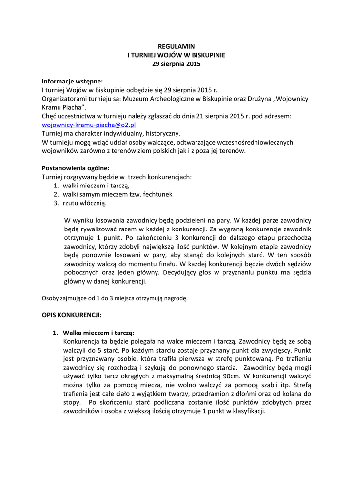 REGULAMIN I TURNIEJ WOJÓW W BISKUPINIE 29 sierpnia 2015 Informacje wstępne: I turniej Wojów w Biskupinie odbędzie się 29 sierpnia 2015 r. Organizatorami turnieju są: Muzeum Archeologiczne w Biskupinie oraz Drużyna „Wojownicy Kramu Piacha”. Chęć uczestnictwa w turnieju należy zgłaszać do dnia 21 sierpnia 2015 r. pod adresem: [email protected] Turniej ma charakter indywidualny, historyczny. W turnieju mogą wziąć udział osoby walczące, odtwarzające wczesnośredniowiecznych wojowników zarówno z terenów ziem polskich jak i z poza jej terenów. Postanowienia ogólne: Turniej rozgrywany będzie w trzech konkurencjach: 1. walki mieczem i tarczą, 2. walki samym mieczem tzw. fechtunek 3. rzutu włócznią. W wyniku losowania zawodnicy będą podzieleni na pary. W każdej parze zawodnicy będą rywalizować razem w każdej z konkurencji. Za wygraną konkurencje zawodnik otrzymuje 1 punkt. Po zakończeniu 3 konkurencji do dalszego etapu przechodzą zawodnicy, którzy zdobyli największą ilość punktów. W kolejnym etapie zawodnicy będą ponownie losowani w pary, aby stanąć do kolejnych starć. W ten sposób zawodnicy walczą do momentu finału. W każdej konkurencji będzie dwóch sędziów pobocznych oraz jeden główny. Decydujący głos w przyznaniu punktu ma sędzia główny w danej konkurencji. Osoby zajmujące od 1 do 3 miejsca otrzymują nagrodę. OPIS KONKURENCJI: 1. Walka mieczem i tarczą: Konkurencja ta będzie polegała na walce mieczem i tarczą. Zawodnicy będą ze sobą walczyli do 5 starć. Po każdym starciu zostaje przyznany punkt dla zwycięscy. Punkt jest przyznawany osobie, która trafiła pierwsza w strefę punktowaną. Po trafieniu zawodnicy się rozchodzą i szykują do ponownego starcia. Zawodnicy będą mogli używać tylko tarcz okrągłych z maksymalną średnicą 90cm. W konkurencji walczyć można tylko za pomocą miecza, nie wolno walczyć za pomocą szabli itp. Strefą trafienia jest całe ciało z wyjątkiem twarzy, przedramion z dłońmi oraz od kolana do stopy. Po skończeniu starć podliczana zostanie ilość punktów zdobytych przez zawodników i osoba z większą ilością otrzymuje 1 punkt w klasyfikacji. 2. Fechtunek: Konkurencja ta będzie polegała na walce mieczem. Zawodnicy będą walczyli ze sobą do 5 starć. Po każdym starciu zostaje przyznany punkt dla zwycięscy. Punkt jest przyznawany dla osoby, która trafiła w strefę punktowaną. Po trafieniu zawodnicy się rozchodzą i szykują do ponownego starcia. W konkurencji walczyć można tylko za pomocą miecza, nie wolno walczyć za pomocą szabli itp. Strefą trafienia jest całe ciało z wyjątkiem twarzy, przedramion z dłońmi oraz od kolana do stopy. Po skończeniu starć podliczana zostanie ilość punktów zdobytych przez zawodników i osoba z większą ilością otrzymuje 1 punkt w klasyfikacji. 3. Rzut włócznią: Konkurencja ta będzie polegała na rzucie włócznią do celu. Cel będzie się składał z 3 stref trafienia, gdzie za każda strefę będzie przyznawane od 1 do 3 punktów. Zawodnik będzie wykonywał 3 rzuty. Rzut jest uznawany za zaliczony w momencie, kiedy włócznia zostaje wbita w daną strefę punktową. Wygrywa ten zawodnik, który zdobędzie większą ilość punktów. W przypadku uzyskania przez zawodników takiej samej ilości punktów zawodnicy wykonują dodatkowy rzut. Po wykonaniu zostaje naliczony odpowiedni punkt za strefę trafienia i wygrywa ten, który trafił w bardziej punktowaną. Jeśli znowu zawodnicy trafia w tą samą strefę, procedura zostaje powtórzona do momentu, aż jeden z zawodników nie wygra. Możliwe jest za obopólną zgodą rozstrzygnięcie za pomocą rzutu monetą osoby wygranej. Po zakończeniu konkurencji zostaje naliczony 1 punkt do klasyfikacji dla zwycięscy. WARUNKI UCZESTNICTWA: Uczestnicy turnieju muszą posiadać pełną rekonstrukcję stroju zarówno bitewnego (według wytycznych turniejowych) jak i „codziennego” wraz z rekonstrukcjami przedmiotów codziennego użytku. Uczestnikom turnieju zabrania się spożywania alkoholu w trakcie trwania turnieju. Wszyscy uczestnicy turnieju zobowiązani są do nieniszczenia mienia muzealnego. Wymagania sprzętowe: Sprzęt używany w czasie turnieju musi nawiązywać do uzbrojenia wczesnośredniowiecznego. Do konkurencji walka mieczem i tarczą oraz fechtunku: -miecz - podwójny pancerz np. przeszywanica i lamelka. - pancerz wierzchni musi być wykonany ze stali ( nie wolno używać skórzanych lamelek itp.) - wymagane jest zabezpieczenie dłoni, w której trzymana jest broń poprzez rękawice. - Tarcza okrągła z maksymalną średnicą 90 cm. - zabezpieczenie głowy w postaci hełmu (nie jest wymagane zabezpieczenie twarzy poprzez oplot). - Wszelkie ochraniacze niehistoryczne maja zostać ukryte np. ochraniacze na kolana i piszczele pod spodniami. Do konkurencji rzut włócznią: - włócznie zapewnia organizator Opłaty: Każdy walczący uczestnik musi wnieść opłatę rejestracyjną w wysokości 10 zł. Osoby towarzyszące również ponoszą opłatę 10 zł. W ramach opłaty organizatorzy zapewniają jeden ciepły posiłek w ciągu dnia, nocleg, oraz drobny poczęstunek na wieczornej biesiadzie. Organizatorzy zapewniają nocleg wyłącznie na wspólnych salach. Istnieje również możliwość rozbicia namiotu przy „Domu Muzealnika”. Osoby zainteresowane noclegiem w innych warunkach muszą organizować go na własną rękę oraz ponieść dodatkowe koszty związane z zakwaterowaniem. Organizatorzy oferują pomoc w ich znalezieniu. Noclegi: http://www.biskupin.pl/asp/pl_start.asp?typ=14&menu=295&strona=1 Program imprezy: 9.00- 10.00 : rejestracja uczestników turnieju (przy wejściu do rezerwatu) 9.00 - 10.30: przegląd sprzętu przez sędziów (wioska wczesnopiastowska) 10.30: rozpoczęcie turnieju (przy wiosce wczesnopiastowskiej) Rozdanie nagród po rozstrzygnięciu turnieju 20.00 biesiada przy Domu Muzealnika