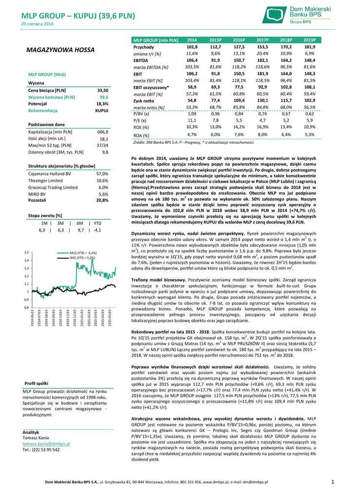 MLP GROUP – KUPUJ (39,6 PLN) 29 czerwca 2014 MAGAZYNOWA HOSSA MLP GROUP (MLG) Wycena Cena bieżąca [PLN] Wycena końcowa [PLN] Potencjał Rekomendacja 33,50 39,6 18,3% KUPUJ Podstawowe dane Kapitalizacja [mln PLN] Ilość akcji [mln szt.] Max/min 52 tyg. [PLN] Dzienny obrót [3M, tys. PLN] 606,8 18,1 37/24 9,8 Struktura akcjonariatu [% głosów] Cajamarca Holland BV Thesinger Limited Gracecup Trading Limited MIRO BV Pozostali 57,0% 10,6% 6,0% 5,6% 20,8% Stopa zwrotu [%] 1M | 6,3 | 3M | 6,3 | 1,5 6M | YTD 9,7 | -4,1 1,3 1,2 1,1 1 0,9 2015-05-03 2015-04-03 2015-03-03 2015-02-03 2015-01-03 2014-12-03 2014-11-03 2014-10-03 2014-09-03 2014-08-03 2014-07-03 0,8 2014-06-03 ROA (%) 2014 102,8 11,6% 106,4 103,5% 106,2 103,4% 58,9 57,3% 54,8 53,3% 1,09 11,1 10,3% 2015P 112,7 9,6% 91,9 81,6% 91,8 81,4% 69,3 61,5% 77,4 68,7% 0,96 7,8 13,0% 2016P 127,5 13,1% 150,7 118,2% 150,5 118,1% 77,5 60,8% 109,4 85,8% 0,84 5,5 16,2% 2017P 153,5 20,4% 182,1 118,6% 181,9 118,5% 92,9 60,5% 130,1 84,8% 0,74 4,7 16,9% 2018P 170,2 10,9% 164,2 96,5% 164,0 96,4% 102,8 60,4% 115,7 68,0% 0,67 5,2 13,4% 2019P 181,9 6,9% 148,4 81,6% 148,3 81,5% 108,1 59,4% 102,9 56,5% 0,62 5,9 10,9% 4,7% 6,0% 7,6% 8,0% 6,4% 5,3% Źródło: DM Banku BPS S.A. P - Prognozy, * o aktualizacje nieruchomości Po dobrym 2014, uważamy że MLP GROUP utrzyma pozytywne momentum w kolejnych kwartałach. Spółce sprzyja rekordowy popyt na powierzchnie magazynowe, dzięki czemu będzie ona w stanie dynamicznie zwiększyć portfel inwestycji. Po drugie, dobrze postrzegamy zarząd spółki, który ogranicza transakcje spekulacyjne do minimum, a także konsekwentnie pracuje nad rozszerzeniem działalności o ciekawe lokalizacje w Polsce (MLP Lublin) i zagranicą (Niemcy).Przedstawiona przez zarząd strategia podwojenia skali biznesu do 2018 jest w naszej opinii bardzo prawdopodobna do zrealizowania. Obecnie MLP ma już podpisane umowy na ok 180 tys. m2 co pozwala na wykonanie ok. 50% założonego planu. Naszym zdaniem spółka będzie w stanie dzięki temu poprawić oczyszczony zysk operacyjny o przeszacowania do 102,8 mln PLN w 2018 wobec 58,9 mln PLN w 2014 (+74,7% r/r). Uważamy, że wymienione czynniki przełożą się na aprecjację kursu spółki w kolejnych miesiącach dlatego rekomendujemy KUPUJ dla walorów MLP z ceną docelową 39,6 PLN. Dynamiczny wzrost rynku, nadal świetne perspektywy. Rynek powierzchni magazynowych przeżywa obecnie bardzo udany okres. W samym 2014 popyt netto wzrósł o 1,4 mln m2 tj. o 11% r/r. Powierzchnia nowo wybudowanych obiektów była zdecydowanie mniejsza (1,05 mln m2), co przełożyło się na spadek liczby pustostanów o 1,6 p.p. do 9,8%. Poprawa była jeszcze bardziej wyraźna w 1Q’15, gdy popyt netto wyniósł 0,68 mln m2, a poziom pustostanów spadł do 7,6%, (jeden z najniższych poziomów w historii). Uważamy, że również 2H’15 będzie bardzo udany dla deweloperów, portfel umów które są bliskie podpisania to ok. 0,5 mln m2. MLG (YTD = -4,1%) WIG (YTD = 5,2%) 1,4 MLP GROUP [mln PLN] Przychody zmiana r/r [%] EBITDA marża EBITDA [%] EBIT marża EBIT [%] EBIT oczyszczony* marża EBIT [%] Zysk netto marża netto [%] P/BV (x) P/E (x) ROE (%) Trafiony model biznesowy. Pozytywnie oceniamy model biznesowy spółki. Zarząd ogranicza inwestycje o charakterze spekulacyjnym, funkcjonując w formule built-to-suit. Grupa rozbudowuje parki jedynie w oparciu o już podpisane umowy, dopasowując powierzchnię do konkretnych wymagań klienta. Po drugie, Grupa posiada zróżnicowany portfel najemców, a średnia długość umów to obecnie ok. 7-8 lat, co pozwala ograniczyć wpływ koniunktury na prowadzony biznes. Ponadto, MLP GROUP posiada kompetencje, które pozwalają na przeprowadzenie pełnego procesu inwestycyjnego, począwszy od uzyskania decyzji lokalizacyjnej poprzez budowę obiektu oraz jego zarządzanie. Rekordowy portfel na lata 2015 - 2018. Spółka konsekwentnie buduje portfel na kolejne lata. Po 1Q’15 portfel projektów GK obejmował ok. 158 tys. m2. W 2Q’15 spółka poinformowała o podpisaniu umów z Grupą Matras (14 tys. m2 w MLP PRUSZKÓW II) oraz siecią Stokrotka (5,7 tys. m2 w MLP LUBLIN) Łączny portfel zamówień to ok. 180 tys. m2 przypadający na lata 2015 – 2018. W naszej opinii spółka zwiększy portfel nieruchomości do 751 tys. m2 do 2018. Profil spółki MLP Group prowadzi działalność na rynku nieruchomości komercyjnych od 1998 roku. Specjalizuje się w budowie i zarządzaniu nowoczesnymi centrami magazynowo produkcyjnymi. Analityk Tomasz Kania [email protected] Tel.: (22) 53 95 542 Poprawa wyników finansowych dzięki wzrostowi skali działalności. Uważamy, że solidny portfel zamówień oraz wysoki poziom najmu już wybudowanej powierzchni (wskaźnik pustostanów 3%) przełożą się na dynamiczną poprawę wyników finansowych. W naszej opinii spółka już w 2015 wypracuje 112,7 mln PLN przychodów (+9,6% r/r), 69,3 mln PLN zysku operacyjnego bez przeszacowań (+17,7% r/r) oraz 77,4 mln PLN zysku netto (+41,4% r/r). W 2016 szacujemy, że MLP GROUP osiągnie 127,5 mln PLN przychodów (+13% r/r), 77,5 mln PLN zysku operacyjnego oczyszczonego o przeszacowania (+11,8% r/r) oraz 109,4 mln PLN zysku netto (+41,2% r/r). Atrakcyjna wycena wskaźnikowa, przy wysokiej dynamice wzrostu i dywidendzie. MLP GROUP jest notowane na poziomie wskaźnika P/BV’15=0,96x, poniżej poziomu, na którym notowani są główni konkurenci GK – Prologis Inc, Segro czy Goodman Group (średnie P/BV’15=1,35x). Uważamy, że pomimo, lokalnej skali działalności MLP GROUP dyskonto na poziomie nie jest uzasadnione. Spółka ma ekspozycję na jeden z najszybciej rozwijających się rynków magazynowych na świecie, posiada realną perspektywę podwojenia skali biznesu, a zarząd chce w niedalekiej przyszłości rozpocząć wypłatę dywidendy na poziomie co najmniej 4% dividend yield. Dom Maklerski Banku BPS S.A., ul. Grzybowska 81, 00-844 Warszawa, infolinia: 801 321 456, www.dmbps.pl, e-ma