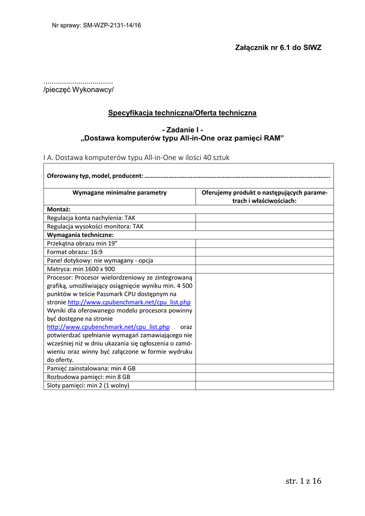 Nr sprawy: SM-WZP-2131-14/16 Załącznik nr 6.1 do SIWZ .................................. /pieczęć Wykonawcy/ Specyfikacja techniczna/Oferta techniczna - Zadanie I „Dostawa komputerów typu All-in-One oraz pamięci RAM” I A. Dostawa komputerów typu All-in-One w ilości 40 sztuk Oferowany typ, model, producent: …………………………………………………………………………………………………….. Wymagane minimalne parametry Oferujemy produkt o następujących parametrach i właściwościach: Montaż: Regulacja konta nachylenia: TAK Regulacja wysokości monitora: TAK Wymagania techniczne: Przekątna obrazu min 19” Format obrazu: 16:9 Panel dotykowy: nie wymagany - opcja Matryca: min 1600 x 900 Procesor: Procesor wielordzeniowy ze zintegrowaną grafiką, umożliwiający osiągnięcie wyniku min. 4 500 punktów w teście Passmark CPU dostępnym na stronie http://www.cpubenchmark.net/cpu_list.php Wyniki dla oferowanego modelu procesora powinny być dostępne na stronie http://www.cpubenchmark.net/cpu_list.php oraz potwierdzać spełnianie wymagań zamawiającego nie wcześniej niż w dniu ukazania się ogłoszenia o zamówieniu oraz winny być załączone w formie wydruku do oferty. Pamięć zainstalowana: min 4 GB Rozbudowa pamięci: min 8 GB Sloty pamięci: min 2 (1 wolny) str. 1 z 16 Nr sprawy: SM-WZP-2131-14/16 Dysk twardy: Min. 320GB umożliwiający osiągnięcie wyniku minimum 500 pkt. W teście którego wyniki znajdują się na stronie http://www.harddrivebenchmark.net/hdd_list.php Wyniki dla oferowanego modelu dysku powinny być dostępne na stronie http://www.harddrivebenchmark.net/hdd_list.php oraz potwierdzać spełnianie wymagań zamawiającego nie wcześniej niż w dniu ukazania się ogłoszenia o zamówieniu oraz winny być załączone w formie wydruku do oferty. Napęd optyczny: nie wymagany – opcja (DVD+/RW/RAM) Karta graficzna: Grafika zintegrowana ze wsparciem DirectX 11.1, OpenGL 4.0, OpenCL 1.2; pamięć współdzielona z pamięcią RAM, dynamicznie przydzielana do min. 1,7GB wyposażona w co najmniej 1 złącze displayport lub co najmniej 1 złącze VGA; obsługująca rozdzielczości : 3840x2160 @ 60Hz (cyfrowo) 2560x1600 @ 60Hz (cyfrowo) 4096x2304 @ 24Hz (cyfrowo) 1920x1200 @ 60Hz (analogowo i cyfrowo) Oferowana karta graficzna musi osiągać w teście PassMark Performance Test co najmniej wynik 500 punktów w G3D Rating, wynik dostępny na stronie: http://www.videocardbenchmark.net/gpu_list.php str. 2 z 16 Nr sprawy: SM-WZP-2131-14/16 BIOS: zgodny ze specyfikacją UEFI Musi zapewniać, bez uruchamiania systemu operacyjnego z dysku twardego komputera lub innych podłączonych do niego urządzeń zewnętrznych odczytania z BIOS informacji o: wersji BIOS, nr seryjnym komputera wraz z datą jego wyprodukowania, ilości i sposobu obłożenia slotów pamięciami RAM, typie procesora wraz z informacją o ilości rdzeni, wielkości pamięci cache L2 i L3, pojemności zainstalowanego dysku twardego rodzajach napędów optycznych MAC adresie zintegrowanej karty sieciowej kontrolerze audio Funkcja blokowania wejścia do BIOS oraz blokowania startu systemu operacyjnego, (gwarantujący utrzymanie zapisanego hasła nawet w przypadku odłączenia wszystkich źródeł zasilania i podtrzymania BIOS) Funkcja blokowania/odblokowania BOOT-owania stacji roboczej z zewnętrznych urządzeń Możliwość polegająca na kontrolowaniu urządzeń wykorzystujących magistralę komunikacyjną PCI, bez uruchamiania systemu operacyjnego z dysku twardego komputera lub innych podłączonych do niego urządzeń zewnętrznych. Pod pojęciem kontroli Zamawiający rozumie funkcjonalność polegającą na blokowaniu/odblokowaniu slotów PCI. Możliwość ustawienia dwóch haseł w BIOSie. Jedno do uruchamiania systemu operacyjnego (user) , drugie do modyfikacji ustawień w BIOSie (admin). Możliwość włączenia/wyłączenia zintegrowanej karty dźwiękowej, karty sieciowej, portu równoległego, portu szeregowego z poziomu BIOS, bez uruchamiania systemu operacyjnego z dysku twardego komputera lub innych, podłączonych do niego, urządzeń zewnętrznych. Możliwość ustawienia portów USB w trybie „no BOOT”, czyli podczas startu komputer nie wykrywa urządzeń bootujących typu USB, natomiast po uruchomieniu systemu operacyjnego porty USB są aktywne. Wbudowana kamera: nie wymagana Mikrofon: nie wymagany Karta sieciowa przewodowa: min 100M/1000M Gigabit Ethernet z opcją wake-on LAN str. 3 z 16 Nr sprawy: SM-WZP-2131-14/16 Karta sieciowa bezprzewodowa: nie wymagana opcja - min Wi-Fi IEEE 802.11b/g/n Karta dźwiękowa: Tak Głośniki: Min 24-bitowa Karta dźwiękowa zintegrowana z płytą główną, zgodna z High Definition, zintegrowane głośniki Bluetooth: nie wymagany HDMI: nie wymagane Wyjście audio: Tak Wejście mikrofon: Tak USB 2.0: min 2 USB 3.0: min 1 Czytnik kart pamięci: standard SD System operacyjny: Windows 10 Proffesional z opcją downgrade do MS Windows 7 Professional 64-bit Kolor: jednolity Klawiatura: przewodowa lub bezprzewodowa mysz: przewodowa lub bezprzewodowa Gwarancja: min 36 mc Inne: Dostarczony sprzęt musi umożliwiać współpracę z oprogramowaniem ewidencyjno-serwisowym Zamawiającego wykorzystującym protokół SNMP wersja 1, 2, 3, celem identyfikacji stacji roboczej po unikalnym numerze identyfikacyjnym (serwisowym) producenta, marce i modelu producenta oraz musi spełniać kryteria środowiskowe, w tym zgodność z dyrektywą RoHS Unii Europejskiej. Oferowany sprzęt komputerowy dodatkowo musi spełniać poniższe certyfikaty i standardy: Komputery muszą być wyprodukowane z zachowaniem normy jakościowej ISO 9001 lub równoważnych środków zapewnienia jakości. Komputery muszą posiadać deklarację zgodności CE (co będzie sprawdzane podczas odbioru sprzętu na etapie realizacji umowy). Komputery muszą spełniać wymogi normy Energy Star 5.0. Głośność jednostki centralnej komputerów mierzona zgodnie z normą ISO 