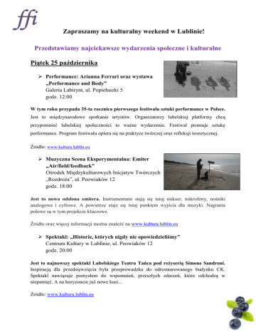 Zapraszamy na kulturalny weekend w Lublinie! Przedstawiamy najciekawsze wydarzenia społeczne i kulturalne Piątek 25 października Performance: Arianna Ferrari oraz wystawa „Performance and Body” Galeria Labirynt, ul. Popiełuszki 5 godz. 12:00 W tym roku przypada 35-ta rocznica pierwszego festiwalu sztuki performance w Polsce. Jest to międzynarodowe spotkanie artystów. Organizatorzy lubelskiej platformy chcą przypomnieć lubelskiej społeczności to ważne wydarzenie. Festiwal promuje sztukę performance. Program festiwalu opiera się na praktyce twórczej oraz refleksji teoretycznej. Źródło: www.kultura.lublin.eu Muzyczna Scena Eksperymentalna: Emiter „Air/field/feedback” Ośrodek Międzykulturowych Inicjatyw Twórczych „Rozdroża”, ul. Peowiaków 12 godz. 18:00 Jest to nowa odsłona emitera. Instrumentami stają się tutaj mikser, mikrofony, nośniki analogowe i cyfrowe. A powietrze staje się tutaj punktem wyjścia dla muzyki. Nagrania polowe są w tym projekcie kluczowe. Źródło oraz więcej informacji można znaleźć na www.kultura.lublin.eu Spektakl: „Historie, których nigdy nie opowiedzieliśmy” Centrum Kultury w Lublinie, ul. Peowiaków 12 godz. 20:00 Jest to najnowszy spektakl Lubelskiego Teatru Tańca pod reżyserią Simone Sandroni. Inspiracją dla przedsięwzięcia była przeprowadzka do odrestaurowanego budynku CK. Spektakl nawiązuje pomysłem do wspomnień, przeszłych zdarzeń, które odchodzą w niepamięć. A na horyzoncie już nowe kusi... Źródło: www.kultura.lublin.eu Sobota 26 października Skubas- koncert skustyczny w ramach Cyklu „Peryferia” Dzielnicowy Dom Kultury „Węglin”, ul. Judyma 2a godz. 19:00 Artysta pochodzi z Lublina, jest twórcą o wyjątkowej i charakterystycznej barwie głosu. Możemy się spodziewać niezwykle klimatycznych gitarowych brzmień o folkowogrunge'owym charakterze. Będziemy mogli posłuchać: Skubasa (wokal i gitara), Filipa Jurczyszyna (bas, wokal), Macieja Starnowskiego (gitara, wokal). Źródło: www.kultura.lublin.eu Koncert „W górach jest wszystko co kocham...” ACK „Chatka Żaka”, ul. Radziszewskiego 16 godz. 21:00 Będziemy mogli usłyszeć występy zespołów: Adsu, Na Bani, Dom o Zielonych Progach. Wszystkie zespoły zaprezentują piosenki studenckie oraz turystyczne. Każda z grup ma swoją niepowtarzalną historię powstania. Chcesz je poznać? Przyjdź na Bakcynalia! Źródło: www.kultura.lublin.eu Niedziela, 27 października SzaZa plays Polański Warsztaty Kultury, ul. Grodzka 5a godz. 19:00 Jest to pokaz filmowy z muzyką na żywo. Prezentowanymi filmami będą dzieła Polańskiego, które tak naprawdę są obecnie najrzadziej prezentowane, m.in. „Morderstwo”, ,,Uśmiech zębiczny”, „Rozbijemy zabawę”, „Kiedy spadają anioły” itd. Muzykę na żywo do filmów zaprezentują Szamburski i Zakrocki czyli w skrócie SzaZa. Jest to dość oryginalny sposób na spędzenie sobotniego wieczoru. Źródło: www.kultura.lublin.eu Pokaz filmu "Michael Haneke: Zawód reżyser" Dom Kultury "Czechów", ul. Kiepury 5a Lublin godz. 16:00 Film opowiadający o jednym z najważniejszych reżyserów w historii kina, który przełamał wiele tabu. W filmie ukazany poprzez wypowiedzi aktorów i z wykorzystaniem niepokazywanych wcześniej ujęć z jego filmów. Film jest wyświetlany w ramach festiwalu Post Scriptum. Źródło: www.kultura.lublin.eu