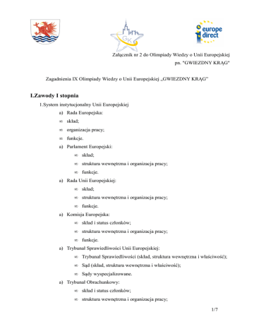 Załącznik nr 2 do Olimpiady Wiedzy o Unii Europejskiej pn. "GWIEZDNY KRĄG" Zagadnienia IX Olimpiady Wiedzy o Unii Europejskiej „GWIEZDNY KRĄG” I.Zawody I stopnia 1.System instytucjonalny Unii Europejskiej a) Rada Europejska: • skład; • organizacja pracy; • funkcje. a) Parlament Europejski: • skład; • struktura wewnętrzna i organizacja pracy; • funkcje. a) Rada Unii Europejskiej: • skład; • struktura wewnętrzna i organizacja pracy; • funkcje. a) Komisja Europejska: • skład i status członków; • struktura wewnętrzna i organizacja pracy; • funkcje. a) Trybunał Sprawiedliwości Unii Europejskiej: • Trybunał Sprawiedliwości (skład, struktura wewnętrzna i właściwość); • Sąd (skład, struktura wewnętrzna i właściwość); • Sądy wyspecjalizowane. a) Trybunał Obrachunkowy: • skład i status członków; • struktura wewnętrzna i organizacja pracy; 1/7 • funkcje. a) Organy doradcze: • Komitet Ekonomiczno – Społeczny (skład, struktura organizacyjna, funkcje); • Komitet Regionów (skład, struktura organizacyjna, funkcje). 1.Źródła prawa Unii Europejskiej a) Prawo pierwotne Unii Europejskiej; b) Prawo wtórne Unii Europejskiej: • rozporządzenie • dyrektywa; • decyzja; • zalecenia i opinie; • akty nienazwane. 2/7 II.Zawody II stopnia 1.System instytucjonalny Unii Europejskiej a) Rada Europejska: • skład; • organizacja pracy; • funkcje. a) Parlament Europejski: • skład; • struktura wewnętrzna i organizacja pracy; • funkcje. a) Rada Unii Europejskiej: • skład; • struktura wewnętrzna i organizacja pracy; • funkcje. a) Komisja Europejska: • skład i status członków; • struktura wewnętrzna i organizacja pracy; • funkcje. a) Trybunał Sprawiedliwości Unii Europejskiej: • Trybunał Sprawiedliwości (skład, struktura wewnętrzna i właściwość); • Sąd (skład, struktura wewnętrzna i właściwość); • Sądy wyspecjalizowane. a) Trybunał Obrachunkowy: • skład i status członków; • struktura wewnętrzna i organizacja pracy; • funkcje. 3/7 a) Organy doradcze: • Komitet Ekonomiczno – Społeczny (skład, struktura organizacyjna, funkcje); • Komitet Regionów (skład, struktura organizacyjna, funkcje). 1.Źródła prawa Unii Europejskiej a) Prawo pierwotne Unii Europejskiej; b) Prawo wtórne Unii Europejskiej: • rozporządzenie • dyrektywa; • decyzja; • zalecenia i opinie; • akty nienazwane. 1.Obywatelstwo Unii Europejskiej a) pojęcie i zakres obywatelstwa UE; b) nabycie i utrata obywatelstwa UE; c) prawa i obowiązki obywateli UE; d) ochrona praw podstawowych Unii Europejskiej. 4/7 II.Zawody III stopnia Część pierwsza: 1.System instytucjonalny Unii Europejskiej a) Rada Europejska: • skład; • organizacja pracy; • funkcje. a) Parlament Europejski: • skład; • struktura wewnętrzna i organizacja pracy; • funkcje. a) Rada Unii Europejskiej: • skład; • struktura wewnętrzna i organizacja pracy; • funkcje. a) Komisja Europejska: • skład i status członków; • struktura wewnętrzna i organizacja pracy; • funkcje. a) Trybunał Sprawiedliwości Unii Europejskiej: • Trybunał Sprawiedliwości (skład, struktura wewnętrzna i właściwość); • Sąd (skład, struktura wewnętrzna i właściwość); • Sądy wyspecjalizowane. 5/7 a) Trybunał Obrachunkowy: • skład i status członków; • struktura wewnętrzna i organizacja pracy; • funkcje. a) Organy doradcze: • Komitet Ekonomiczno – Społeczny (skład, struktura organizacyjna, funkcje); • Komitet Regionów (skład, struktura organizacyjna, funkcje). 1.Źródła prawa Unii Europejskiej a) Prawo pierwotne Unii Europejskiej; b) Prawo wtórne Unii Europejskiej: • rozporządzenie • dyrektywa; • decyzja; • zalecenia i opinie; • akty nienazwane. 1.Obywatelstwo Unii Europejskiej a) pojęcie i zakres obywatelstwa UE; b) nabycie i utrata obywatelstwa UE; c) prawa i obowiązki obywateli UE; d) ochrona praw podstawowych Unii Europejskiej. 1.Historia integracji Unii Europejskiej. Część trzecia: 1.10 lat członkowstwa Polski w Unii Europejskiej. Bilans członkostwa. 2.Polacy w Unii Europejskiej. Jak jest reprezentowana Polska w instytucjach europejskich. 3.Kryzys gospodarczy i jego wpływ na procesy integracyjne w Unii Europejskiej. 4.Unia Europejska po przystąpieniu Chorwacji. 5.Przystąpienie Turcji do Unii Europejskiej, za i przeciw. 6.Rola Parlamentu Europejskiego w procesie legislacyjnym Unii Europejskiej. 6/7 7.Problem bezrobocia młodzieży w Unii Europejskiej. 8.Kto reprezentuje Unię Europejską na zewnątrz? 9.Polska w strefie euro, za i przeciw. 10.Punkt Informacji Europejskiej Europe Direct i jego znaczenie dla społeczności lokalnej. 11.Polityka zagraniczna Unii Europejskiej w aspekcie wschodnim. 12.Nowa perspektywa finansowa Unii Europejskiej, ocena procesu negocjacyjnego. 13.Europejska inicjatywa uchwałodawcza. Realny wpływ obywateli na proces legislacyjny, czy iluzja? 14.Priorytety Polski w Unii Europejskiej. 15.Prokuratura Europejska jako narzędzie walki z przestępczością finansową. Sposób na walkę z przestępczością, czy zbędna rozbudowa administracji? 16.Rola orzeczeń przedwstępnych na proces harmonizacji prawa. 17.Trybunał Konstytucyjny, a Trybunał Sprawiedliwości Unii Europejskiej. Który ważniejszy? 18.Jakość implementacji prawa Unii Europejskiej w Polsce. 19.Obywatel Unii Europejskiej, jego prawa i obowiązki. 20.Ocena wykorzystania funduszy strukturalnych w latach 2007 – 2013 w Polsce. 21.Możliwość pozyskiwania środków Unii Europejskiej przez młodzież. 22.Procedura tworzenia prawa wtórnego Unii Europejskiej. 23.Relacja między prawem krajowym, a prawem Unii Europejskiej. 24.Charakterystyka strategii 2020. 25.Czym jest „Semestr europejski”. 26.Unia Europejska jako podmiot prawa międzynarodowego. 27.Zasady prawa Unii Europejskiej. 28.Swobody rynku wewnętrznego. 29.System instytucjonalny Unii Europejskiej po Traktac