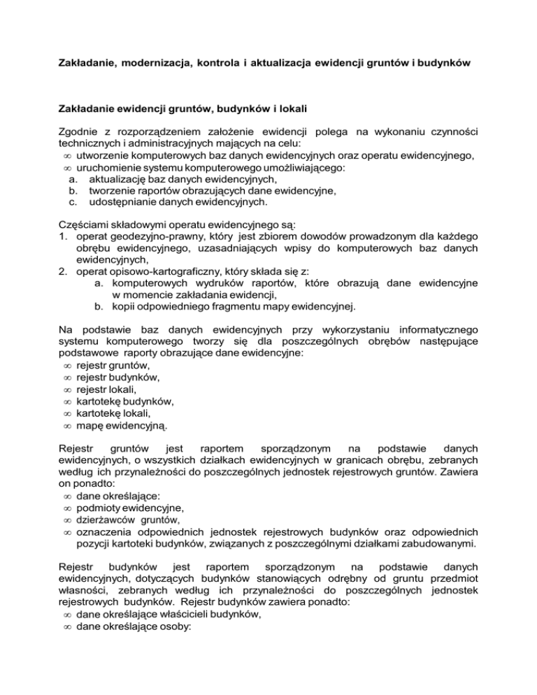 Zakładanie, modernizacja, kontrola i aktualizacja ewidencji gruntów i budynków Zakładanie ewidencji gruntów, budynków i lokali Zgodnie z rozporządzeniem załoŜenie ewidencji polega na wykonaniu czynności technicznych i administracyjnych mających na celu: • utworzenie komputerowych baz danych ewidencyjnych oraz operatu ewidencyjnego, • uruchomienie systemu komputerowego umoŜliwiającego: a. aktualizację baz danych ewidencyjnych, b. tworzenie raportów obrazujących dane ewidencyjne, c. udostępnianie danych ewidencyjnych. Częściami składowymi operatu ewidencyjnego są: 1. operat geodezyjno-prawny, który jest zbiorem dowodów prowadzonym dla kaŜdego obrębu ewidencyjnego, uzasadniających wpisy do komputerowych baz danych ewidencyjnych, 2. operat opisowo-kartograficzny, który składa się z: a. komputerowych wydruków raportów, które obrazują dane ewidencyjne w momencie zakładania ewidencji, b. kopii odpowiedniego fragmentu mapy ewidencyjnej. Na podstawie baz danych ewidencyjnych przy wykorzystaniu informatycznego systemu komputerowego tworzy się dla poszczególnych obrębów następujące podstawowe raporty obrazujące dane ewidencyjne: • rejestr gruntów, • rejestr budynków, • rejestr lokali, • kartotekę budynków, • kartotekę lokali, • mapę ewidencyjną. Rejestr gruntów jest raportem sporządzonym na podstawie danych ewidencyjnych, o wszystkich działkach ewidencyjnych w granicach obrębu, zebranych według ich przynaleŜności do poszczególnych jednostek rejestrowych gruntów. Zawiera on ponadto: • dane określające: • podmioty ewidencyjne, • dzierŜawców gruntów, • oznaczenia odpowiednich jednostek rejestrowych budynków oraz odpowiednich pozycji kartoteki budynków, związanych z poszczególnymi działkami zabudowanymi. Rejestr budynków jest raportem sporządzonym na podstawie danych ewidencyjnych, dotyczących budynków stanowiących odrębny od gruntu przedmiot własności, zebranych według ich przynaleŜności do poszczególnych jednostek rejestrowych budynków. Rejestr budynków zawiera ponadto: • dane określające właścicieli budynków, • dane określające osoby: • uŜytkowników wieczystych gruntów, • jednostek organizacyjnych sprawujących zarząd lub trwały zarząd nieruchomościami, • państwowych osób prawnych, którym Skarb Państwa powierzył w stosunku do jego • nieruchomości wykonywanie prawa własności lub innych praw rzeczowych, • organów administracji publicznej, które gospodarują nieruchomościami wchodzącymi w skład zasobu nieruchomości Skarbu Państwa oraz gminnych, powiatowych i wojewódzkich zasobów nieruchomości, • uŜytkowników, • oznaczenia jednostek rejestrowych gruntów, pozycji kartoteki budynków i jednostek rejestrowych lokali, związanych z poszczególnymi budynkami. Rejestr lokali jest raportem sporządzonym na podstawie danych ewidencyjnych, dotyczących lokali stanowiących odrębne nieruchomości, zgrupowanych według ich przynaleŜności do poszczególnych jednostek rejestrowych lokali. Rejestr lokali zawiera ponadto: • dane określające właścicieli lokali, • dane określające osoby: • uŜytkowników wieczystych gruntów, • jednostek organizacyjnych sprawujących zarząd lub trwały zarząd nieruchomościami, • państwowych osób prawnych, którym Skarb Państwa powierzył w stosunku do jego • nieruchomości wykonywanie prawa własności lub innych praw rzeczowych, • organów administracji publicznej, które gospodarują nieruchomościami wchodzącymi w skład zasobu nieruchomości Skarbu Państwa oraz gminnych, powiatowych i wojewódzkich zasobów nieruchomości, • uŜytkowników, • oznaczenia jednostek rejestrowych budynków i pozycji kartoteki budynków związanych z poszczególnymi lokalami. Kartoteka budynków jest raportem sporządzonym na podstawie danych ewidencyjnych o budynkach, zebranych w pozycjach kartoteki budynków. Kartoteka budynków zawiera ponadto: • dane określające podmioty ewidencyjne oraz innych władających budynkami w całości lub w części, • oznaczenia jednostek rejestrowych gruntów lub jednostek rejestrowych budynków związanych z poszczególnymi budynkami, • pozycję kartoteki budynków tworzą dane o budynkach wybudowanych na gruntach wchodzących w skład jednej jednostki rejestrowej gruntów. Kartoteka lokali jest raportem sporządzonym na podstawie danych ewidencyjnych o lokalach, zebranych w pozycjach kartoteki lokali. Kartoteka lokali zawiera ponadto: • dane określające właścicieli lokali oraz innych władających lokalami, • oznaczenia jednostek rejestrowych gruntów, jednostek rejestrowych budynków oraz w przypadku lokali stanowiących odrębne nieruchomości – oznaczenia jednostek rejestrowych lokali związanych z poszczególnymi lokalami, • pozycję kartoteki lokali stanowią dane o lokalach znajdujących się w jednym budynku. Treść mapy ewidencyjnej stanowią następujące elementy: • granice: państwa, jednostek zasadniczego trójstopniowego podziału terytorialnego państwa (gmin, powiatów i województw) jednostek ewidencyjnych, obrębów, działek, • oznaczenia punktów granicznych, z wyróŜnieniem punktów, których połoŜenie określone zostało w odpowiednim trybie i z wymaganą dokładnością, a spośród nich – punktów trwale stabilizowanych w terenie, • kontury uŜytków gruntowych i ich oznaczenia, • kontury klas gleboznawczych i ich oznaczenia, • kontury budynków, • numery działek ewidencyjnych, • granice rejonów statystycznych i ich oznaczenia, • dane opisowo-informacyjne, a w szczególności: • nazwy jednostek zasadniczego trójstopniowego podziału terytorialnego państwa, • oznaczenia jednostki ewidencyjnej i obrębu, • nazwy ulic, placów, uroczysk, cieków, zbiorników wodnych i innych obiektów fizjograficznych, • numery dróg publicznych nadane na podstawie przepisów o drogach publicznych, • numery porządkowe i