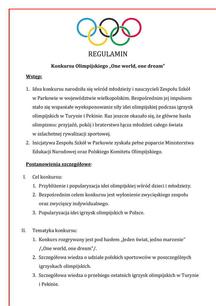 REGULAMIN Konkursu Olimpijskiego „One world, one dream” Wstęp: 1. Idea konkursu narodziła się wśród młodzieży i nauczycieli Zespołu Szkół w Parkowie w województwie wielkopolskim. Bezpośrednim jej impulsem stało się wspaniałe wyeksponowanie siły idei olimpijskiej podczas igrzysk olimpijskich w Turynie i Pekinie. Raz jeszcze okazało się, że główne hasła olimpizmu: przyjaźń, pokój i braterstwo łącza młodzież całego świata w szlachetnej rywalizacji sportowej. 2. Inicjatywa Zespołu Szkół w Parkowie zyskała pełne poparcie Ministerstwa Edukacji Narodowej oraz Polskiego Komitetu Olimpijskiego. Postanowienia szczegółowe: I. Cel konkursu: 1. Przybliżenie i popularyzacja idei olimpijskiej wśród dzieci i młodzieży. 2. Bezpośrednim celem konkursu jest wyłonienie zwycięskiego zespołu oraz zwycięscy indywidualnego. 3. Popularyzacja idei igrzysk olimpijskich w Polsce. II. Tematyka konkursu: 1. Konkurs rozgrywany jest pod hasłem „Jeden świat, jedno marzenie” /„One world, one dream”/. 2. Szczegółowa wiedza o udziale polskich sportowców w poszczególnych igrzyskach olimpijskich. 3. Szczegółowa wiedza o przebiegu ostatnich igrzysk olimpijskich w Turynie i Pekinie. 4. Ogólna wiedza o historii i symbolach igrzysk olimpijskich. III. Organizatorzy: 1. Organizatorem konkursu jest Zespół Szkól w Parkowie w powiecie obornickim i Klub Olimpijczyka w Parkowie. 2. Konkurs odbywa się przy współudziale: • Ministerstwa Edukacji narodowej; • Polskiego Komitetu Olimpijskiego; • Kuratorium Oświaty w Poznaniu; • Uczniowskiego Klubu Sportowego; • Radia „Merkury”. IV. Uczestnicy: W konkursie mogą brać udział uczniowie gimnazjów. V. Zasady eliminacji i zgłoszenia: 1. Drużynę wyłania się podczas eliminacji szkolnych. Tworzy ją trzech uczniów, którzy podczas eliminacji szkolnych uzyskają najlepsze wyniki. W skład drużyny wchodzą uczniowie jednej szkoły 2. Uczestnicy są oceniani indywidualnie. Suma punktów uczestników /trzech/ tej samej szkoły tworzy punktację drużynową. VI. Przebieg konkursu: 1. Konkurs składa się z dwóch części: a) części sprawnościowej; b) części teoretycznej; 2. Część sprawnościowa polega na indywidualnym wykonaniu trzech punktowanych prób sprawnościowych /sportowych/. 3. Część teoretyczna składa się z eliminacji pisemnych i sprawdzianu ustnego. W części pisemnej uczestnicy rozwiązują krzyżówkę / 20 haseł/ lub odpowiadają na 20 pytań. Czas odpowiedzi wynosi 20 minut. Oceny pisemnych odpowiedzi dokonuje komisja konkursowa. Do sprawdzianu ustnego przechodzi 5 uczestników indywidualnych, którzy po części sprawnościowej i pisemnej uzyskali najlepsze wyniki. W części ustnej każdy uczestnik losuje zestaw trzech pytań. Pierwsze pytania dotyczą igrzysk w Turynie i Pekinie, drugie związane jest z historią igrzysk olimpijskich, trzecie pytanie związane jest z filmem przedstawiającym wydarzenia z igrzysk. 4. Klasyfikacja drużynowa ustalana jest po części pisemnej i sprawnościowej. 5. Punktacja za odpowiedzi pisemne wynosi od 0 do 1 punktu za pytanie . Punktacja za odpowiedzi na pytania ustne wynosi od 0 do 10 punktów. 6. Jeżeli dwa lub więcej zespołów lub uczestników indywidualnych uzyska taką samą ilość punktów , stosuje się dodatkową rundę pytań ustnych /po jednym pytaniu dla uczestnika/ drogą losowania pytań z zestawów rezerwowych. 7. Pytania i zadania przygotowuje Klub Olimpijczyka w Parkowie przy współdziałaniu z Polskim Komitetem Olimpijskim. 8. Komisję w składzie 5 – 8 osób w celu przeprowadzenia Finału Wojewódzkiego Konkursu tworzą przedstawiciele PKOl i zaproszeni olimpijczycy. Na czele komisji stoi przedstawiciel Zespołu Szkół w Parkowie. 9. Punktacja za część sprawnościową konkursu jest określona przez organizatorów poszczególnych etapów wg zasady, że punkty zdobyte w tej części nie mogą przekroczyć 50% ogółu punktów możliwych do zdobycia w całym konkursie /na określonym etapie/. VII. Inne uwagi: 1. Przed przystąpieniem do części teoretycznej konkursu następuje losowanie kolejności odpowiedzi. Losowania dokonują kapitanowie drużyn oraz uczestnicy indywidualni . Kapitanowie drużyn decydują o kolejności odpowiedzi uczestników z drużyny. 2. Każdy uczestnik konkursu ma prawo poprzez swojego opiekuna zgłosić uwagi, zastrzeżenia oraz protesty dotyczące oceny bądź innych spraw związanych z przebiegiem konkursu. Każda zgłoszona wątpliwość musi być natychmiast rozpatrzona przez komisję konkursową, a jej wynik ogłoszony publicznie. 3. W każdym przypadku odpowiedzi złej lub niepełnej przewodniczący komisji konkursowej publicznie ogłasza prawidłową odpowiedź. VIII. Nagrody: 1. Głównymi nagrodami konkursu na szczeblu wojewódzkim są puchary Dyrektora Zespołu Szkół w Parkowie za zwycięstwo drużynowe i indywidualne. 2. Wszyscy współorganizatorzy etapów mają prawo fundacji nagród i określenia ich przeznaczenia. 3. Ostateczna interpretacja powyższego regulaminu przysługuje głównemu organizatorowi konkursu. Adres do korespondencji: Klub Olimpijczyka przy Zespole Szkół w Parkowie Parkowo 6 64 – 608 Parkowo Tel./fax. 067/ 26 10 505 e – mail: [email protected]