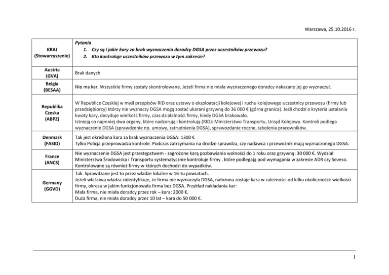 Warszawa, 25.10.2016 r. KRAJ (Stowarzyszenie) Austria (GVA) Belgia (BESAA) Republika Czeska (ABPZ) Pytania 1. Czy są i jakie kary za brak wyznaczenia doradcy DGSA przez uczestników przewozu? 2. Kto kontroluje uczestników przewozu w tym zakresie? Brak danych Nie ma kar. Wszystkie firmy zostały skontrolowane. Jeżeli firma nie miała wyznaczonego doradcy nakazano jej go wyznaczyć. W Republice Czeskiej w myśl przepisów RID oraz ustawy o eksploatacji kolejowej i ruchu kolejowego uczestnicy przewozu (firmy lub przedsiębiorcy) którzy nie wyznaczy DGSA mogą zostać ukarani grzywną do 36 000 € (górna granica). Jeśli chodzi o kryteria ustalania kwoty kary, decyduje wielkość firmy, czas działalności firmy, kiedy DGSA brakowało. Istnieją co najmniej dwa organy, które nadzorują i kontrolują (RID): Ministerstwo Transportu, Urząd Kolejowy. Kontroli podlega wyznaczenie DGSA (sprawdzenie np. umowy, zatrudnienia DGSA), sprawozdanie roczne, szkolenia pracowników. Denmark (FASID) Tak jest określona kara za brak wyznaczenia DGSA: 1300 € Tylko Policja przeprowadza kontrole. Podczas zatrzymania na drodze sprawdza, czy nadawca i przewoźnik mają wyznaczonego DGSA. France (ANCS) Nie wyznaczenie DGSA jest przestępstwem - zagrożone karą pozbawiania wolności do 1 roku oraz grzywną: 30 000 €. Wydział Ministerstwa Środowiska i Transportu systematycznie kontroluje firmy , które podlegają pod wymagania w zakresie ADR czy Seveso. Kontrolowane są również firmy w których dochodzi do wypadków. Germany (GGVD) Tak. Sprawdzane jest to przez władze lokalne w 16-tu powiatach. Jeżeli właściwa władza zidentyfikuje, że firma nie wyznaczyła DGSA, nałożona zostaje kara w zależności od kilku okoliczności: wielkości firmy, okresu w jakim funkcjonowała firma bez DGSA. Przykład nakładania kar: Mała firma, nie miała doradcy przez rok – kara: 2000 €. Duża firma, nie miała doradcy przez 10 lat – kara do 50 000 €. 1 Hungary (BTE) Brak doradcy do spraw bezpieczeństwa jest przedmiotem prawa administracyjnego, grzywna wynosi 320 € - 1300 € w zależności od działalności spółki oraz czy firma nie ma wyznaczonego DGSA (1300 €), czy tylko nie ma on odpowiedniego/ważnego certyfikatu (320 €). Są cztery właściwe organy: - Krajowy Urząd Transportu (NKH) - Krajowa Dyrekcja Generalna (OKF) - Police (ORFK) - Krajowa Administracja podatkowa i celna (NAV) Kontrola przeprowadzana jest w całym łańcuchu dostaw (drogowym / kolejowym / morskim / lotniczym) oraz na stronie internetowej. Krajowy Urząd Transportu (NKH) obsługuje centralną rejestrację DGSA z odniesieniem do firmy. Firmy muszą zarejestrować swojego DGSA w ciągu 10 dni od wyznaczenia, w wyniku kontroli organ może poprosić o potwierdzenie rejestracji oraz sprawozdanie roczne do 5 lat wstecz. Ireland (DGSAAI) Tak, kara w wysokości 500 € - przedsiębiorstwo może również zostać ukarane kolejną karą 250 € za brak przygotowania sprawozdania rocznego. Kontrole w firmach przeprowadzane są przez Health and Safety Authority. Kontrole na drodze przeprowadza Policja. Kary nakładane są przez Health and Safety Authority. Luxemburg (VGL) Tak. Kary pieniężna oraz kara więzienia (2 miesiące) Kontrole przeprowadza raz do roku specjalna sekcja służby celnej oraz departament Ministerstwa ds Transportu. Netherlands (VVA) Obowiązują zasady dyrektywy ustanawiające przepisy dotyczące zgodności i nadzoru nad DGSA (dyrektywa w sprawie polityki doradców ds. bezpieczeństwa) W Artykule 4 określone są kary i zasady ich naliczania brak wyznaczonego DGSA: 5.000 € brak przygotowania rocznego sprawozdania: 2.500 € brak wymaganych informacji w rocznym sprawozdaniu o których mowa w podrozdziale 1.8.3.3 ustęp 1: 1000 € brak możliwości udowodnienia przez doradcę wypełniani przez niego obowiązków o których mowa w podrozdziale 1.8.3.3 ustęp 1: 2.500 € Norway (FFSN) a) Firmy najpierw otrzymują zawiadomienie z agencji autoryzacji z informacją, że będą miały prawny obowiązek wyznaczenia DGSA. W przypadku, gdy nie zostaną podjęte żadne działania ze strony firm, dalsze działania prawne mogą być wyciągnięte w stosunku do uczestnika przewozu (np. nałożenie kar). Jednak żaden taki przypadek nie miał miejsca. b) Nie istnieje specjalna procedura, ale organy wykonujące audyty i kontrole drogowe rutynowo sprawdza, czy firmy mają wyznaczonego DGSA. Audyty w firmach przeprowadzane są przez Dyrekcję Ochrony Cywilnej, podczas gdy kontrole drogowe przeprowadzane są przez Administrację Dróg Publicznych. 2 Poland (SDGSA) Tak przepisy USTAWY z dnia 19 sierpnia 2011 r. o przewozie towarów niebezpiecznych (Dz.U.2011 nr.227 poz.1367), ustanawiają następujące kary: - Niewyznaczenie przez uczestnika przewozu towarów niebezpiecznych doradcy do spraw bezpieczeństwa przewozu towarów niebezpiecznych: 1200 €. - Nieprzesłanie w ustawowo określonym terminie rocznego sprawozdania: 1) jeżeli od ustawowo określonego terminu do dnia przesłania sprawozdania nie upłynęło 14 dni:50 €. 2) jeżeli upłynęło co najmniej 14 dni 3 miesiące: 450 €. 3) jeżeli upłynęły co najmniej 3 miesiące: 1200 €. - Nieprzeszkolenie osób wykonujących czynności związane z przewozem towaru niebezpiecznego, zatrudnionych przez uczestnika przewozu towarów niebezpiecznych lub wykonujących te czynności na jego rzecz: 450 €. Organy przeprowadzające kontrole: Inspekcja Transportu Drogowego, Służba Celna, Straż Graniczna, Policja Slovakia (ZLZ) Brak danych Spain (ACCS) (ACONSENA) (ACONSA) Switzerland (VSGGB) Turkey (TMGDER) Tak. Kara za brak wyznaczenia DGSA: 4. 001 € Krajowy Urząd Transportu obsługuje centralną rejestrację DGSA z odniesieniem do firm. Przeprowadzane są kontrole (za wyjątkiem regionu Navarra). Policja przeprowadza kontrole podczas transportu w zakresie wyznaczenia DGSA. Brak przygotowania rocznego sprawozdania: 801 €. Tak. Kara za brak wyznaczenia DGSA: min. 140