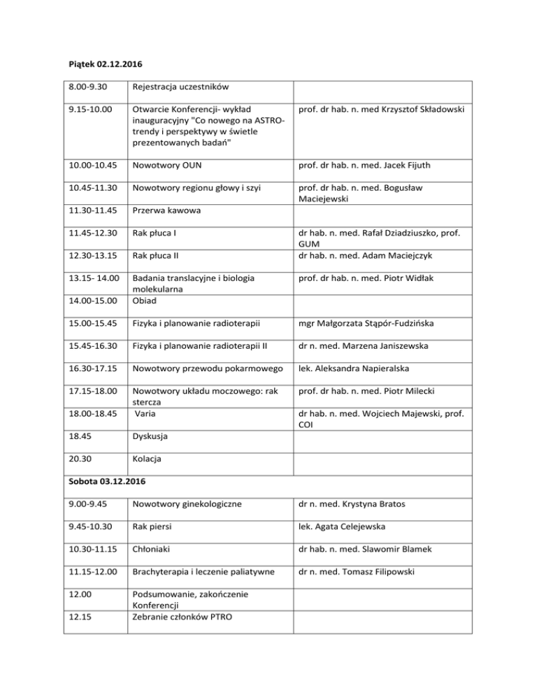 Piątek 02.12.2016 8.00-9.30 Rejestracja uczestników 9.15-10.00 Otwarcie Konferencji- wykład inauguracyjny "Co nowego na ASTROtrendy i perspektywy w świetle prezentowanych badań" prof. dr hab. n. med Krzysztof Składowski 10.00-10.45 Nowotwory OUN prof. dr hab. n. med. Jacek Fijuth 10.45-11.30 Nowotwory regionu głowy i szyi prof. dr hab. n. med. Bogusław Maciejewski 11.30-11.45 Przerwa kawowa 11.45-12.30 Rak płuca I 12.30-13.15 Rak płuca II 13.15- 14.00 prof. dr hab. n. med. Piotr Widłak 14.00-15.00 Badania translacyjne i biologia molekularna Obiad 15.00-15.45 Fizyka i planowanie radioterapii mgr Małgorzata Stąpór-Fudzińska 15.45-16.30 Fizyka i planowanie radioterapii II dr n. med. Marzena Janiszewska 16.30-17.15 Nowotwory przewodu pokarmowego lek. Aleksandra Napieralska 17.15-18.00 prof. dr hab. n. med. Piotr Milecki 18.00-18.45 Nowotwory układu moczowego: rak stercza Varia 18.45 Dyskusja 20.30 Kolacja dr hab. n. med. Rafał Dziadziuszko, prof. GUM dr hab. n. med. Adam Maciejczyk dr hab. n. med. Wojciech Majewski, prof. COI Sobota 03.12.2016 9.00-9.45 Nowotwory ginekologiczne dr n. med. Krystyna Bratos 9.45-10.30 Rak piersi lek. Agata Celejewska 10.30-11.15 Chłoniaki dr hab. n. med. Slawomir Blamek 11.15-12.00 Brachyterapia i leczenie paliatywne dr n. med. Tomasz Filipowski 12.00 Podsumowanie, zakończenie Konferencji Zebranie członków PTRO 12.15