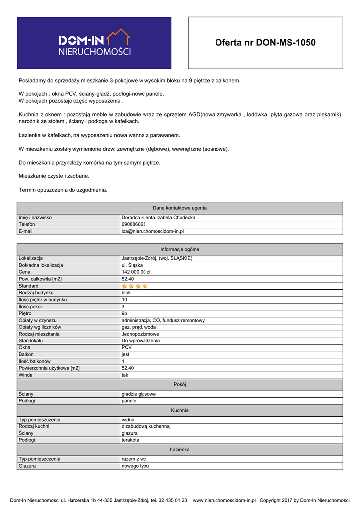 Oferta nr DON-MS-1050 Posiadamy do sprzedaży mieszkanie 3-pokojowe w wysokim bloku na 9 piętrze z balkonem. W pokojach : okna PCV, ściany-gładź, podłogi-nowe panele. W pokojach pozostaje część wyposażenia . Kuchnia z oknem : pozostają meble w zabudowie wraz ze sprzętem AGD(nowa zmywarka , lodówka, płyta gazowa oraz piekarnik) narożnik ze stołem , ściany i podłoga w kafelkach. Łazienka w kafelkach, na wyposażeniu nowa wanna z parawanem. W mieszkaniu zostały wymienione drzwi zewnętrzne (dębowe), wewnętrzne (sosnowe). Do mieszkania przynależy komórka na tym samym piętrze. Mieszkanie czyste i zadbane. Termin opuszczenia do uzgodnienia. Dane kontaktowe agenta Imię i nazwisko Telefon E-mail Doradca klienta Izabela Chudecka 690886063 [email protected] Informacje ogólne Lokalizacja Dokładna lokalizacja Cena Pow. całkowita [m2] Standard Rodzaj budynku Ilość pięter w budynku Ilość pokoi Piętro Opłaty w czynszu Opłaty wg liczników Rodzaj mieszkania Stan lokalu Okna Balkon Ilość balkonów Powierzchnia użytkowa [m2] Winda Jastrzębie-Zdrój, (woj. ŚLĄSKIE) ul. Śląska 142 000,00 zł 52,40 blok 10 3 9p administracja, CO, fundusz remontowy gaz, prąd, woda Jednopoziomowe Do wprowadzenia PCV jest 1 52,40 tak Pokój Ściany Podłogi gładzie gipsowe panele Kuchnia Typ pomieszczenia Rodzaj kuchni Ściany Podłogi widna z zabudową kuchenną glazura terakota Łazienka Typ pomieszczenia Glazura razem z wc nowego typu Dom-In Nieruchomości ul. Harcerska 1b 44-335 Jastrzębie-Zdrój, tel. 32 435 01 23 www.nieruchomoscidom-in.pl Copyright 2017 by Dom-In Nieruchomości Oferta nr DON-MS-1050 Ściany Podłogi glazura terakota Dom-In Nieruchomości ul. Harcerska 1b 44-335 Jastrzębie-Zdrój, tel. 32 435 01 23 www.nieruchomoscidom-in.pl Copyright 2017 by Dom-In Nieruchomości