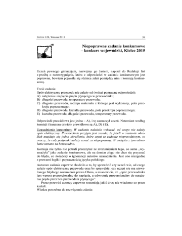 FOTON 128, Wiosna 2015 59 Niepoprawne zadanie konkursowe – konkurs wojewódzki, Kielce 2015 Uczeń pewnego gimnazjum, nazwijmy go Jasiem, napisał do Redakcji list z prośbą o rozstrzygnięcie, która z odpowiedzi w zadaniu konkursowym jest poprawna, bowiem pojawiła się różnica zdań pomiędzy nim i komisją konkursową. Treść zadania: Opór elektryczny przewodu nie zależy od (wskaż poprawne odpowiedzi): A) natężenia i napięcia prądu płynącego w przewodniku; B) długości przewodu, temperatury przewodu; C) długości przewodu, rodzaju materiału z którego jest wykonany, pola przekroju poprzecznego; D) długości przewodu, kształtu przewodu, pola przekroju poprzecznego; E) kształtu przewodu, długości przewodu, temperatury przewodu. Odpowiedź prawidłowa jest jedna – A), i tę zaznaczył uczeń. Natomiast według komisji i kuratora oświaty prawidłowe są A), D) i E). Uzasadnienie kuratorium: W zadaniu należało wskazać, od czego nie zależy opór elektryczny. Powszechnie przyjęta jest zasada, że jeżeli w zestawie określeń znajduje się jedno określenie, które czyni to zadanie nieprawdziwym, to znaczy, że cały podpunkt należy uznać za niepoprawny. W związku z tym odwołanie uznano za bezzasadne. Komisja nie tylko nie potrafi przeczytać ze zrozumieniem tego, co sama „wysmażyła” jako zadanie konkursowe, ale na domiar złego nie chce się przyznać do błędu, co świadczy o ignorancji autorów uzasadnienia. Jest ono niezgodne z prawami logiki i poprawnością języka polskiego. Autorom zadania zapewne chodziło o to, by sprawdzić czy uczeń wie, od czego zależy opór elektryczny przewodu oraz by sprawdzić, czy uczeń nie ma utrwalonego błędnego rozumienia prawa Ohma, a mianowicie, że „opór przewodnika jest wprost proporcjonalny do napięcia, a odwrotnie proporcjonalny do natężenia prądu przez ten przewodnik płynącego”. Przez przewód autorzy zapewne rozumieją jakiś drut; nie wiadomo co przez kształt. Wiedza potrzebna do rozwiązania zdania: 60 FOTON 128, Wiosna 2015 Gdy do przewodnika (w postaci jakiegoś drutu) stosuje się prawo Ohma, to opór elektryczny tego przewodnika jest wprost proporcjonalny do jego długości, odwrotnie proporcjonalny do pola powierzchni jego przekroju poprzecznego oraz zależy do własności materiału, z jakiego jest wykonany przewodnik – to jest zawarte we współczynniku proporcjonalności nazywanym oporem właściwym. Opór przewodnika zależy od jego temperatury. Ten sam przewodnik w niskiej temperaturze (np. zanurzony w ciekłym azocie czy nawet w lodzie) będzie miał inny opór (mniejszy) niż w wysokiej temperaturze. Można w szkole wykonać ładne doświadczenie. Oczywiście, gdy przez przewód płynie prąd o bardzo dużym natężeniu, to przewód się grzeje i zmienia się jego opór. Wtedy nie stosuje się prawo Ohma. Ponieważ w pytaniu „stało jak wół”, od czego opór NIE zależy, więc poprawna jest jedynie odpowiedź A). Odrobina spostrzegawczości i intuicji (im dłuższy przewód tym większy opór) wystarczą, by podać poprawną odpowiedź A). W odpowiedziach B), C), D), E) występuje długość, zaś w A) wielkości niewystępujące w pozostałych. Dystraktory powinny być jednorodne (raz jeden element wymieniany, innym razem wiele) i wnosić coś nowego i choćby trywialnego, jak kolor izolatora. Zatem zadanie jest wadliwie skonstruowane, ma nieodpowiednie dystraktory. Jeśli chcemy sprawdzać wiadomości z fizyki nie róbmy równocześnie testu z logiki zdań. Jak wiadomo, większość ludzi ma trudności z zaprzeczeniem zdania z dwoma kwantyfikatorami, a może rozumieć fenomenologiczne prawa fizyki. Można te same wiadomości sprawdzić w sposób znacznie bardziej przyjazny uczniowi. Całkiem zwyczajnie zapytać go, od czego zależy opór. I osobno wymienić, co np. kolor izolatora, kształt przekroju czy przewód jest prosty, czy pogięty). Uczeń pisze do Redakcji, co ma robić? Redakcja pyta, czy naprawdę ekspert uniwersytecki jest potrzebny do rozstrzygnięcia problemu, który dotyczy czytania ze zrozumieniem? Podejrzewamy, że podobnych przypadków (tj. wadliwych zadań, bo od tego zaczął się problem) jest więcej. Warte osobnej dyskusji jest zagadnienie zadań na konkursy. W tej chwili chodzi o to, by się poprawiającym łatwiej poprawiało, a właściwie, by mógł to robić automat. A przecież nie o to chodzi. Są dokładne reguły budowania testów wyboru i jeśli się testy wyboru stosuje to należy te reguły poznać. Zadania wielokrotnego wyboru, z pięcioma dystraktorami często prowadzą do wynaturzeń, kierują myślenie ucznia na niewłaściwe tory.