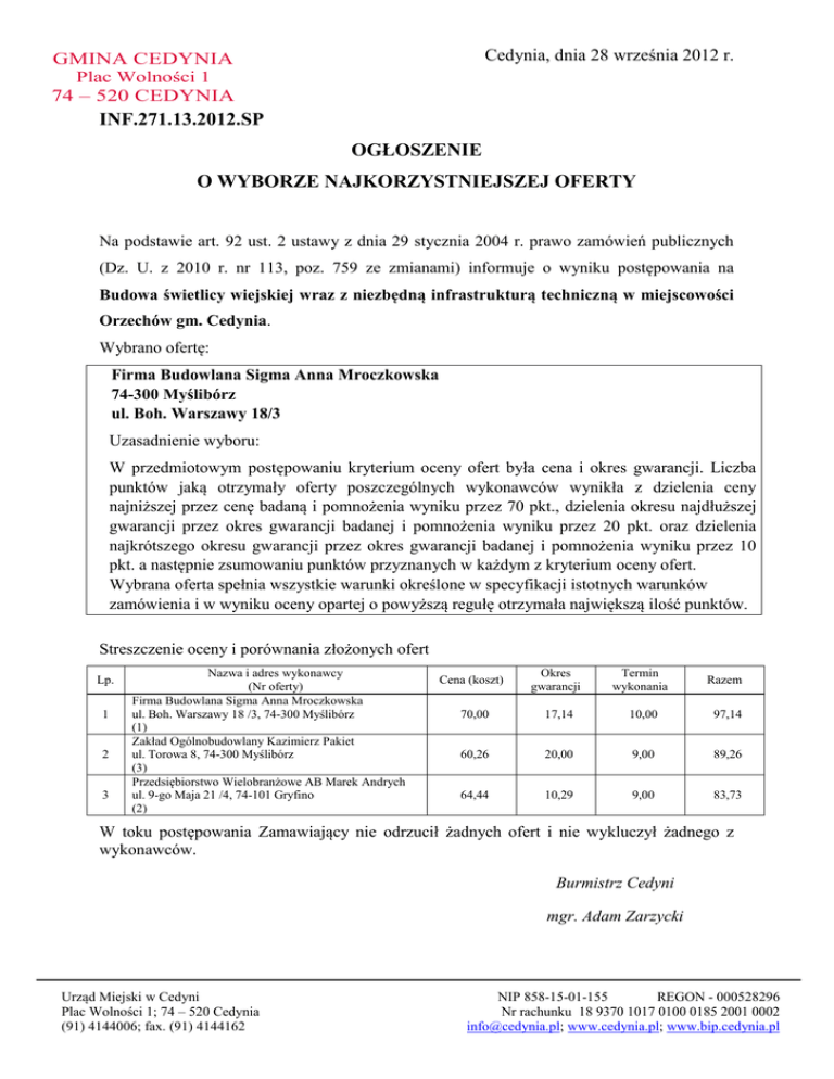 Cedynia, dnia 28 września 2012 r. GMINA CEDYNIA Plac Wolności 1 74 – 520 CEDYNIA INF.271.13.2012.SP OGŁOSZENIE O WYBORZE NAJKORZYSTNIEJSZEJ OFERTY Na podstawie art. 92 ust. 2 ustawy z dnia 29 stycznia 2004 r. prawo zamówień publicznych (Dz. U. z 2010 r. nr 113, poz. 759 ze zmianami) informuje o wyniku postępowania na Budowa świetlicy wiejskiej wraz z niezbędną infrastrukturą techniczną w miejscowości Orzechów gm. Cedynia. Wybrano ofertę: Firma Budowlana Sigma Anna Mroczkowska 74-300 Myślibórz ul. Boh. Warszawy 18/3 Uzasadnienie wyboru: W przedmiotowym postępowaniu kryterium oceny ofert była cena i okres gwarancji. Liczba punktów jaką otrzymały oferty poszczególnych wykonawców wynikła z dzielenia ceny najniższej przez cenę badaną i pomnożenia wyniku przez 70 pkt., dzielenia okresu najdłuższej gwarancji przez okres gwarancji badanej i pomnożenia wyniku przez 20 pkt. oraz dzielenia najkrótszego okresu gwarancji przez okres gwarancji badanej i pomnożenia wyniku przez 10 pkt. a następnie zsumowaniu punktów przyznanych w każdym z kryterium oceny ofert. Wybrana oferta spełnia wszystkie warunki określone w specyfikacji istotnych warunków zamówienia i w wyniku oceny opartej o powyższą regułę otrzymała największą ilość punktów. Streszczenie oceny i porównania złożonych ofert Lp. 1 2 3 Nazwa i adres wykonawcy (Nr oferty) Firma Budowlana Sigma Anna Mroczkowska ul. Boh. Warszawy 18 /3, 74-300 Myślibórz (1) Zakład Ogólnobudowlany Kazimierz Pakiet ul. Torowa 8, 74-300 Myślibórz (3) Przedsiębiorstwo Wielobranżowe AB Marek Andrych ul. 9-go Maja 21 /4, 74-101 Gryfino (2) Cena (koszt) Okres gwarancji Termin wykonania Razem 70,00 17,14 10,00 97,14 60,26 20,00 9,00 89,26 64,44 10,29 9,00 83,73 W toku postępowania Zamawiający nie odrzucił żadnych ofert i nie wykluczył żadnego z wykonawców. Burmistrz Cedyni mgr. Adam Zarzycki Urząd Miejski w Cedyni Plac Wolności 1; 74 – 520 Cedynia (91) 4144006; fax. (91) 4144162 NIP 858-15-01-155 REGON - 000528296 Nr rachunku 18 9370 1017 0100 0185 2001 0002 [email protected]; www.cedynia.pl; www.bip.cedynia.pl