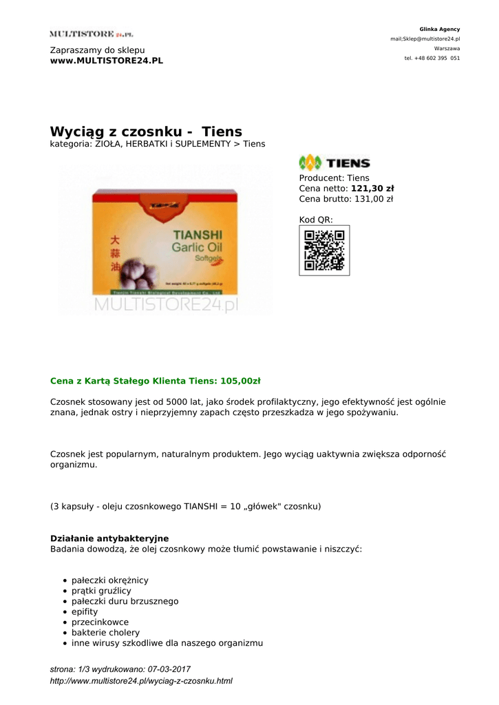 Glinka Agency mail;[email protected] Zapraszamy do sklepu www.MULTISTORE24.PL Warszawa tel. +48 602 395 051 Wyciąg z czosnku - Tiens kategoria: ZIOŁA, HERBATKI i SUPLEMENTY > Tiens Producent: Tiens Cena netto: 121,30 zł Cena brutto: 131,00 zł Kod QR: Cena z Kartą Stałego Klienta Tiens: 105,00zł Czosnek stosowany jest od 5000 lat, jako środek profilaktyczny, jego efektywność jest ogólnie znana, jednak ostry i nieprzyjemny zapach często przeszkadza w jego spożywaniu. Czosnek jest popularnym, naturalnym produktem. Jego wyciąg uaktywnia zwiększa odporność organizmu. (3 kapsuły - oleju czosnkowego TIANSHI = 10 „główek" czosnku) Działanie antybakteryjne Badania dowodzą, że olej czosnkowy może tłumić powstawanie i niszczyć: pałeczki okrężnicy prątki gruźlicy pałeczki duru brzusznego epifity przecinkowce bakterie cholery inne wirusy szkodliwe dla naszego organizmu strona: 1/3 wydrukowano: 07-03-2017 http://www.multistore24.pl/wyciag-z-czosnku.html A także jest doskonałym środkiem profilaktycznym przeciw infekcyjnym chorobom jelitowym, przeciw silnym i chronicznym biegunkom. Działanie antylipidowe i antyzakrzepowe: Olej czosnkowy może zmniejszać lipoproteiny niskiej gęstości, zwiększać ilość lipoprotein wysokiej gęstości. Składniki oleju czosnkowego silnie kontrolują nagromadzanie trombocytów i wykazują profilaktyczne działanie, jeśli chodzi o procesy zakrzepowe. Regularne stosowanie oleju czosnkowego może zapobiec powstawaniu chorób sercowo naczyniowych. Zapobieganie chorobom nowotworowym. Olej czosnkowy może tłumić powstawanie aminy kwasowo- azotawej (substancja sprzyjająca powstawaniu nowotworu), tłumi wzrost i rozwój komórek nowotworowych. Czosnek jest także bogaty w selen, karoten, a te substancje również odgrywają dużą rolę w zapobieganiu powstawania nowotworów w organizmie. Skład: olejek czosnkowy w kapsułkach z żelatyny, całkowicie pozbawiony zapachu Działanie: zwalcza chorobotwórczą florę jelit rozmaite odmiany pasożytów profilaktyka przeciw infekcyjnym chorobom jelit profilaktyka chronicznych biegunek zapobiega powstawaniu nadmiaru cholesterolu we krwi oraz tworzeniu się nadpłytkowości ważny w profilaktyce chorób serca i naczyń krwionośnych zapobiega rozwojowi chorób nowotworowych działa antybakteryjnie chroni serce Zawartość organicznego germanium w olejku czosnkowym jest znacznie wyższa w porównaniu z innymi roślinami. Ponadto olejek czosnkowy jest szczególnie bogaty w selen i karoten, które hamują rozrost i rozwój komórek rakowych. Przeciwwskazania: Nie stwierdzono Dawkowanie: 30 minut przed jedzeniem, 3 razy po 2 kapsułki dziennie strona: 2/3 wydrukowano: 07-03-2017 http://www.multistore24.pl/wyciag-z-czosnku.html Opakowanie: 60 kapsułek strona: 3/3 wydrukowano: 07-03-2017 http://www.multistore24.pl/wyciag-z-czosnku.html