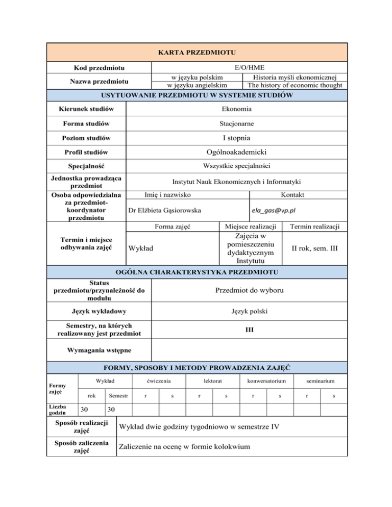 KARTA PRZEDMIOTU E/O/HME Historia myśli ekonomicznej The history of economic thought Kod przedmiotu w języku polskim w języku angielskim Nazwa przedmiotu USYTUOWANIE PRZEDMIOTU W SYSTEMIE STUDIÓW Kierunek studiów Ekonomia Forma studiów Stacjonarne Poziom studiów I stopnia Profil studiów Ogólnoakademicki Specjalność Wszystkie specjalności Jednostka prowadząca Instytut Nauk Ekonomicznych i Informatyki przedmiot Imię i nazwisko Kontakt Osoba odpowiedzialna za przedmiotkoordynator Dr Elżbieta Gąsiorowska [email protected] przedmiotu Forma zajęć Miejsce realizacji Termin realizacji Termin i miejsce odbywania zajęć Zajęcia w pomieszczeniu dydaktycznym Instytutu Wykład II rok, sem. III OGÓLNA CHARAKTERYSTYKA PRZEDMIOTU Status przedmiotu/przynależność do modułu Przedmiot do wyboru Język wykładowy Język polski Semestry, na których realizowany jest przedmiot III Wymagania wstępne FORMY, SPOSOBY I METODY PROWADZENIA ZAJĘĆ Formy zajęć Liczba godzin Wykład rok 30 ćwiczenia Semestr r lektorat s r konwersatorium s r s 30 Sposób realizacji zajęć Wykład dwie godziny tygodniowo w semestrze IV Sposób zaliczenia zajęć Zaliczenie na ocenę w formie kolokwium seminarium r s Metody dydaktyczne Przedmioty powiązane/moduł Wykład z prezentacją multimedialną, dyskusja. Mikroekonomia, Makroekonomia, 1.H. Landreth, D. C. Colander, Historia myśli ekonomicznej, PWN, W-wa Pod2002. Wykaz stawowa 2.M. Nasiłowski, Zarys historii myśli ekonomicznej, Key Text 2004 literatury Uzupełni 1.M. Blaug, Teoria ekonomii – ujęcie retrospektywne, PWN 2002. 2. R. Bartkowiak, Historia myśli ekonomicznej, W-wa PWE 2002. ająca CELE, TREŚCI I EFEKTY KSZTAŁCENIA Cele przedmiotu (ogólne, szczegółowe) 1. Nauczyć studentów rozpoznawać poszczególne zjawiska związane z rozwojem analizy ekonomiczne przez pryzmat wielu zjawisk ekonomicznych. 2.Przybliżyć historię idei ekonomicznych, ukazać miejsce i rolę historii myśli ekonomicznej w systemie nauk społecznych ze szczególnym zwróceniem uwagi na ewaluację myśli ekonomicznej w dochodzeniu do gospodarki rynkowej. 3.Zapoznać z czołowymi przedstawicielami myśli ekonomicznej , charakteryzującymi ich nurty ideami oraz sposobami postrzegania poszczególnych zjawisk ekonomicznych. Treści programowe Efekty kształce Forma nia zajęć (kody) W01 wykład wykład W02 U01 W03 U02K02 wykład wykład wykład nurtów historii myśli 2 Ekonomia przedklasyczna 2 Ekonomia klasyczna - Ekonomiczna myśl A. Smitha - D. Ricardo, jego teoria wartości, podziału dochodów oraz teoria kosztów komparatywnych wykład W02U02 K01 Zarys głównych ekonomicznej. - Fizjokratyzm i ekonomiczna tablica F. Quesnaya. U03 U03 Temat - Merkantylistyczna myśl ekonomiczna W03U03 K02 W03U03 K03 Suma Liczba liczby godzin godzin 2 2 2 - Zasady ekonomii wg J. S. Milla. Prawo ludnościowe, prawo rynków i prawo malejących przychodów. 2 W02U02 wykład K01 wykład U02K01 wykład K02K01 wykład U02 wykład Socjalistyczna myśl ekonomiczna 2 - Przyczyny powstania i czołowi przedstawiciele wczesnej myśli socjalistycznej 2 - Teoria ekonomiczna K. Marksa. 2 Ekonomia neoklasyczna i jej osiągnięcia 2 wykład - Powstanie i rozwój analizy marginalnej 2 wykład - Teoria równowag cząstkowych A. Marshalla 2 wykład - Teoria równowagi ogólnej L. M. Walrasa 2 wykład - Optimum Pareto. 2 Niemiecka szkoła historyczna i jej wkład w rozwój nauk ekonomicznych. Instytucjonalizm i jego przedstawiciele. Teoria konkurencji doskonałej i niedoskonałej. J. M. Keynes makroekonomii. jako twórca nowoczesnej Teorie cyklów koniunkturalnych. Teoria wzrostu gospodarczego. Teoria dobrobytu. Odrodzenie powojennej myśli liberalnej. Neokeynesizm, monetaryzm i nowa ekonomia klasyczna. Efekty kształcenia Student, który zaliczył przedmiot kod w zakresie WIEDZY Odniesienie do efektów kształcenia dla kierunku Zna osiągnięcia nauki w dziedzinie ekonomii, prawa, socjologii K_W01 W01 i nauk pokrewnych Posiada wiedzę z zakresu innych nauk społecznych. W02 K_W05 W03 Zna główne aspekty gospodarki rynkowej. funkcjonowania zmieniającej się K_W07 w zakresie UMIEJĘTNOŚCI U01 Wykorzystuje zdobytą wiedzę z zakresu ekonomii i nauk społecznych w celu analizowania i interpretowania problemów gospodarczych. K_U02 U02 Potrafi postrzegać problemy ekonomiczne w całej złożoności, z uwzględnieniem wielu uwarunkowań społeczno-gospodarczych. K_U06 U03 Wykorzystuje zdobytą wiedzę do oceny skutków ekonomicznych oraz finansowych podejmowanych decyzji oraz ich uzasadnienia. K_U10 w zakresie KOMPETENCJI K01 Jest zdolny i rozumie potrzebę ciągłego doskonalenia i uzupełniania swoich kompetencji, wiedzy i umiejętności. K_K01 K02 Wykazuje się inicjatywą, elastycznością i samodzielnością w prostych problemach społecznych, ekonomicznych, prawnych i innych. K_K02 Metody weryfikacji efektów kształcenia Egzamin ustny Egzamin pisemny Projekt Kolokwium Sprawozdanie Referat/ prezentacja Inne W01 W02 W03 U01 U02 U03 K01 K02 Efekty kształce nia (kody) Punkty ECTS Forma aktywności Godziny kontaktowe z nauczycielem akademickim, w tym: wkłady Obciążenie studenta Liczba punktów Liczba godzin ECTS 30 1,2 5 0,2 konwersatoria ćwiczenia Konsultacje przedmiotowe w ramach wykładów Konsultacje przedmiotowe w ramach konwersatorium/ćwiczeń Łącznie godzin/punktów ECTS wynikających z zajęć kontaktowych z nauczycielem akademickim 35 1,4 Godziny bez udziału nauczyciela akademickiego wynikające z nakładu pracy studenta, w tym: Przygotowanie się do egzaminu + zdawanie egzaminu Przygotowanie się do kolokwium zaliczeniowego Przygotowanie się do zajęć, w tym studiowanie zalecanej literatury w ramach wykładów Przygotowanie się do zajęć, w tym studiowanie zalecanej literatury w ramach konwersatorium /ćwiczeń Przygotowanie raportu, projektu, prezentacji, dyskusji Łącznie liczba godzin/punktów ECTS wynikających z samodzielnej pracy studenta Sumaryczna liczba godzin dla pr