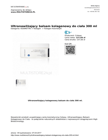Glinka Agency mail;[email protected] Zapraszamy do sklepu www.MULTISTORE24.PL Warszawa tel. +48 602 395 051 Ultranawilżający balsam kolagenowy do ciała 300 ml kategoria: KOSMETYKI > Kolagen > Kolagen Kosmetyki Producent: Colway Cena netto: 127,64 zł Cena brutto: 157,00 zł Kod QR: Ultranawilżający kolagenowy balsam do ciała 300 ml. Nowatorski produkt uzupełniający serię kosmetyczną Colway. Ultranawilżający Balsam Kolagenowy do Ciała - to połączenie naturalnych składników z najnowszymi osiągnięciami High Biotechnology. strona: 1/6 wydrukowano: 07-03-2017 http://www.multistore24.pl/ultranawilzajacy-balsam-kolagenowy-do-ciala-200-ml.html Dobrze znany wszystkim użytkownikom Kolagen Naturalny tym razem wspiera dobroczynne właściwości m.in. NMF, masła Shea, skwalanu, oleju ze słodkich migdałów, kwasu hialuronowego i wielu innych skład składników aktywnych wchodzących w skład Ultranawilżającego Balsamu Kolagenowego do Ciała. Suchość skóry jest coraz częstszym problemem dermatologicznym. Teraz to nie problem! Mamy przecież znakomicie nawilżający hydrat kolagenu i dostęp do najnowszych propozycji bioinżynierii! Zregeneruj swoją skórę i poczuj jej długotrwałe nawilżenie. Innowacyjny, Ultranawilżający Balsam Kolagenowy do Ciała przywraca ekstremalny komfort suchej, a nawet bardzo suchej skórze. Dzięki zawartości naturalnych ekstraktów roślinnych odbudowuje naturalną barierę lipldową naskórka, intensywnie odżywia i zmiękcza skórę. Odżywcza, lekka formuła dogłębnie i długotrwale nawilża. A starannie dobrane składniki - nowości biotechnologiczne z najlepszych na świecie hurtowni komponentów - łagodzą podrażnienia, eliminują dyskomfort z powodu ściągania I łuszczenia się skóry oraz chronią przed negatywnym wpływem czynników zewnętrznych. Dzięki poprawie elastyczności skóry zmniejszają się tendencje do jej przedwczesnego starzenia. Skóra staje się wyraźnie gładsza, niewiarygodnie miękka, silnie odżywiona, zregenerowana, otulona przyjemnym uczuciem komfortu. Firma Colway* oddaje w Państwa ręce niezwykły produkt, który pozwoli zadbać o całe ciało. Niektóre z efektów stosowania: • długotrwałe nawilżenie i regeneracja strona: 2/6 wydrukowano: 07-03-2017 http://www.multistore24.pl/ultranawilzajacy-balsam-kolagenowy-do-ciala-200-ml.html • intensywne odżywienie skóry • widoczna poprawa elastyczności • zniwelowane łuszczenie się naskórka i objawów suchości • redukcja nadwrażliwości skóry wrażliwej W skład Balsamu wchodzą następujące składniki aktywne: KOLAGEN - jest białkiem, które stanowi ok. 30% całkowitej masy białka ludzkiego i aż 70% białka skóry. Kolagen wraz z elastyną tworzą w skórze właściwej elastyczną sieć, która nadaje skórze sprężystość i jędrność. Aplikowany na skórę w żelu - kolagen ekstrahowany w postaci helikalnej ze skór rybich - cieszy się sławą preparatu wyjątkowo skutecznego. Pobudza procesy odnowy, głęboko regeneruje, nawilża i ujędrnia skórę. Na całe lata zatrzymuje procesy powstawania zmarszczek. NMF (NaturalMoisturizing Factorj - to naturalny czynnik chroniący skórę przed odwodnieniem. Odgrywa on również kluczową rolę w zachowaniu właściwości fizycznych wierzchnich warstw skóry (warstwa rogowa). Aby skóra była gładka, niezbędne jest dobre nawilżenie tej warstwy. Grupa naturalnych substancji składających się na NMF wytwarzana jest podczas procesu rogowacenia (np. kwas piroglutaminowy), pocenia czy wydzielania sebum przez gruczoły łojowe (np.mocznik, sole i kwasy organiczne). Substancje te wiążą wodę w warstwie rogowej naskórka. MOISTURIZING FACTOR - to kompleks substancji rekonstruujących naturalny czynnik nawilżający NMF. MASŁO SHEA (Butyrospermum parkii) - znane również jako masło karite i stosowane w strona: 3/6 wydrukowano: 07-03-2017 http://www.multistore24.pl/ultranawilzajacy-balsam-kolagenowy-do-ciala-200-ml.html pielęgnacji skóry od wieków. Składniki owoców drzewa karite można podzielić na dwie kategorie. Pierwsza z nich to tzw. frakcja hydrolizu-jąca (zmydlająca) odpowiedzialna za większość właściwości nawilżających. Druga kategoria to grupa związków niehydrolizujących, które posiadają właściwości lecznicze. Regularne stosowanie masła karite zapewnia, oprócz doskonałego nawilżenia skory, także leczenie już istniejących zaburzeń skórnych. To właśnie te nadzwyczajne właściwości zapewniły karite miano „drzewa życia". Jest idealnie tolerowane przez skórę, ponieważ kombinacja kwasów tłuszczowych (oleinowy, stearynowy, palmitynowy i linolenowy) w nim zawartych przypomina naturalny skład kwasów warstwy rogowej naskórka. Niezwykle wysoka zawartość witaminA, E i F powoduje, że masło to dostarcza skórze podstawowych składników, jakie są jej potrzebne do zachowania gładkości, iedrności i zdrowego, promiennego kolorytu. Dzięki swojemu działaniu pielę gnacyjnemu w pełni zastąpiło markowe balsamy do ciała. Zawiera naturalne przeciwutleniaae, co opóźnia procesy starzenia. Nawilża, wygładza, odżywia i regeneruje. Przywraca skórze jędrność i elastyczność Pomaga w walce z rozstępami i bliznami. Chroni przed niekorzystnymi działaniami bodźców zewnętrznych i pogody, w tym promieni słonecznych. Wykorzystuje się go nie tylko w przypadkach poważnych zaburzeń dermatologicznych, ale także przy reumatyzmie, bólach mięśniowych i stawów. Doskonale nadaje się do pielęgnacji wrażliwej skóry niemowląt. SKWALAN - (nasycona i stabilna forma chemiczna skwalenu) - zaliczany obecnie do bardzo ekskluzywnych komponentów kosmetycznych. Jest anty-oksydantem - chroni lipidowe struktury skóry przed utlenianiem i wolnymi rodnikami. Działa nawilżająco, wzmacnia naturalną barierę lipidową skóry, lekko natłuszcza. Jest on polecany w produktach przeciwzmarszczkowych, dla cer dojrzałych, które utraciły natura