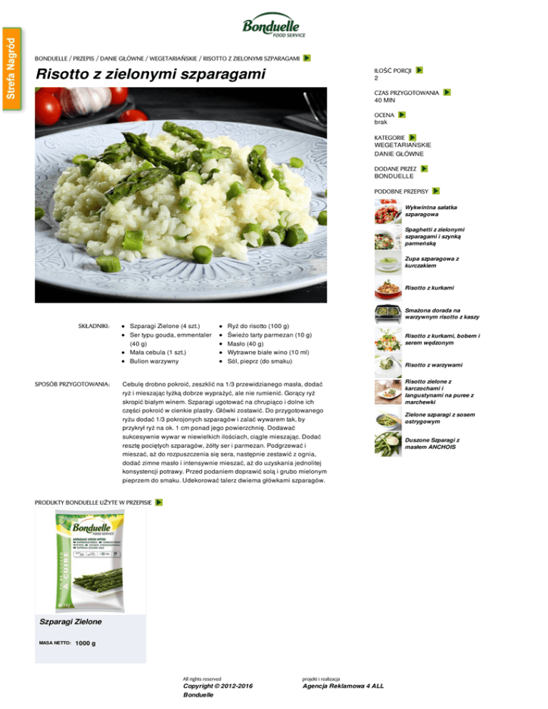 BONDUELLE / PRZEPIS / DANIE GŁÓWNE / WEGETARIAŃSKIE / RISOTTO Z ZIELONYMI SZPARAGAMI Risotto z zielonymi szparagami ILOŚĆ PORCJI 2 CZAS PRZYGOTOWANIA 40 MIN OCENA brak KATEGORIE WEGETARIAŃSKIE DANIE GŁÓWNE DODANE PRZEZ BONDUELLE PODOBNE PRZEPISY Wykwintna sałatka szparagowa Spaghetti z zielonymi szparagami i szynką parmeńską Zupa szparagowa z kurczakiem Risotto z kurkami Smażona dorada na warzywnym risotto z kaszy SKŁADNIKI: SPOSÓB PRZYGOTOWANIA: Szparagi Zielone (4 szt.) Ser typu gouda, emmentaler Ryż do risotto (100 g) Świeżo tarty parmezan (10 g) (40 g) Mała cebula (1 szt.) Bulion warzywny Masło (40 g) Wytrawne białe wino (10 ml) Sól, pieprz (do smaku) Cebulę drobno pokroić, zeszklić na 1/3 przewidzianego masła, dodać ryż i mieszając łyżką dobrze wyprażyć, ale nie rumienić. Gorący ryż skropić białym winem. Szparagi ugotować na chrupiąco i dolne ich części pokroić w cienkie plastry. Główki zostawić. Do przygotowanego ryżu dodać 1/3 pokrojonych szparagów i zalać wywarem tak, by przykrył ryż na ok. 1 cm ponad jego powierzchnię. Dodawać sukcesywnie wywar w niewielkich ilościach, ciągle mieszając. Dodać resztę pociętych szparagów, żółty ser i parmezan. Podgrzewać i mieszać, aż do rozpuszczenia się sera, następnie zestawić z ognia, dodać zimne masło i intensywnie mieszać, aż do uzyskania jednolitej konsystencji potrawy. Przed podaniem doprawić solą i grubo mielonym pieprzem do smaku. Udekorować talerz dwiema główkami szparagów. PRODUKTY BONDUELLE UŻYTE W PRZEPISIE Szparagi Zielone MASA NETTO: 1000 g All rights reserved projekt i realizacja Copyright © 2012-2016 Bonduelle Agencja Reklamowa 4 ALL Risotto z kurkami, bobem i serem wędzonym Risotto z warzywami Risotto zielone z karczochami i langustynami na puree z marchewki Zielone szparagi z sosem ostrygowym Duszone Szparagi z masłem ANCHOIS