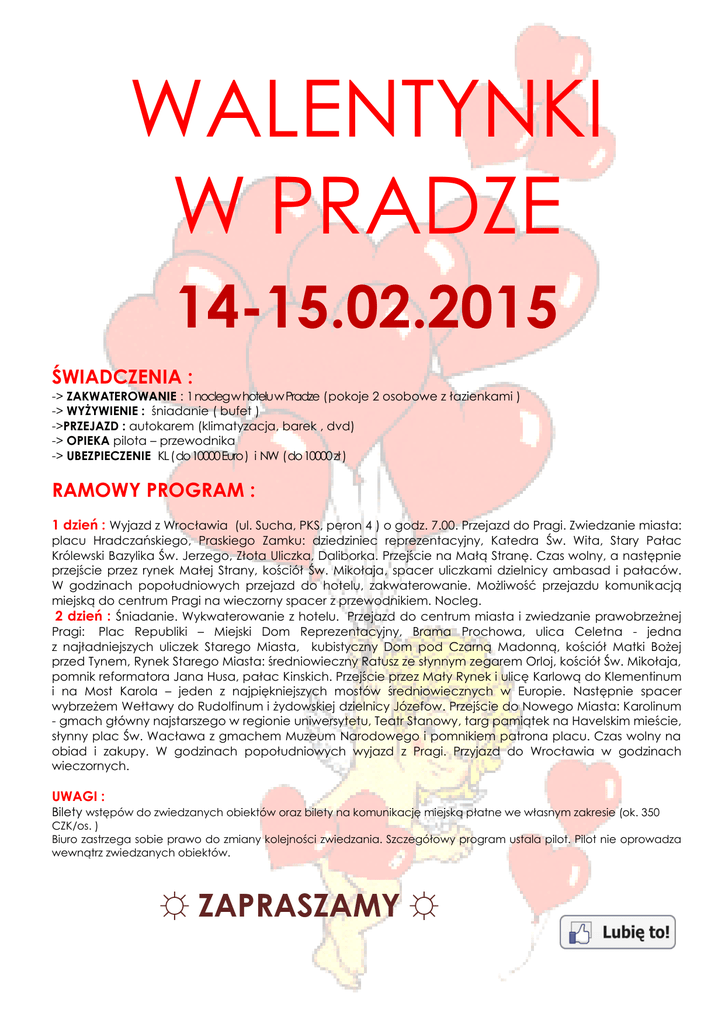 WALENTYNKI W PRADZE 14-15.02.2015 ŚWIADCZENIA : -> ZAKWATEROWANIE : 1 nocleg w hotelu w Pradze ( pokoje 2 osobowe z łazienkami ) -> WYŻYWIENIE : śniadanie ( bufet ) ->PRZEJAZD : autokarem (klimatyzacja, barek , dvd) -> OPIEKA pilota – przewodnika -> UBEZPIECZENIE KL ( do 10000 Euro ) i NW ( do 10000 zł ) RAMOWY PROGRAM : 1 dzień : Wyjazd z Wrocławia (ul. Sucha, PKS, peron 4 ) o godz. 7.00. Przejazd do Pragi. Zwiedzanie miasta: placu Hradczańskiego, Praskiego Zamku: dziedziniec reprezentacyjny, Katedra Św. Wita, Stary Pałac Królewski Bazylika Św. Jerzego, Złota Uliczka, Daliborka. Przejście na Małą Stranę. Czas wolny, a następnie przejście przez rynek Małej Strany, kościół Św. Mikołaja, spacer uliczkami dzielnicy ambasad i pałaców. W godzinach popołudniowych przejazd do hotelu, zakwaterowanie. Możliwość przejazdu komunikacją miejską do centrum Pragi na wieczorny spacer z przewodnikiem. Nocleg. 2 dzień : Śniadanie. Wykwaterowanie z hotelu. Przejazd do centrum miasta i zwiedzanie prawobrzeżnej Pragi: Plac Republiki – Miejski Dom Reprezentacyjny, Brama Prochowa, ulica Celetna - jedna z najładniejszych uliczek Starego Miasta, kubistyczny Dom pod Czarną Madonną, kościół Matki Bożej przed Tynem, Rynek Starego Miasta: średniowieczny Ratusz ze słynnym zegarem Orloj, kościół Św. Mikołaja, pomnik reformatora Jana Husa, pałac Kinskich. Przejście przez Mały Rynek i ulicę Karlową do Klementinum i na Most Karola – jeden z najpiękniejszych mostów średniowiecznych w Europie. Następnie spacer wybrzeżem Wełtawy do Rudolfinum i żydowskiej dzielnicy Józefow. Przejście do Nowego Miasta: Karolinum - gmach główny najstarszego w regionie uniwersytetu, Teatr Stanowy, targ pamiątek na Havelskim mieście, słynny plac Św. Wacława z gmachem Muzeum Narodowego i pomnikiem patrona placu. Czas wolny na obiad i zakupy. W godzinach popołudniowych wyjazd z Pragi. Przyjazd do Wrocławia w godzinach wieczornych. UWAGI : Bilety wstępów do zwiedzanych obiektów oraz bilety na komunikację miejską płatne we własnym zakresie (ok. 350 CZK/os. ) Biuro zastrzega sobie prawo do zmiany kolejności zwiedzania. Szczegółowy program ustala pilot. Pilot nie oprowadza wewnątrz zwiedzanych obiektów. ☼ ZAPRASZAMY ☼