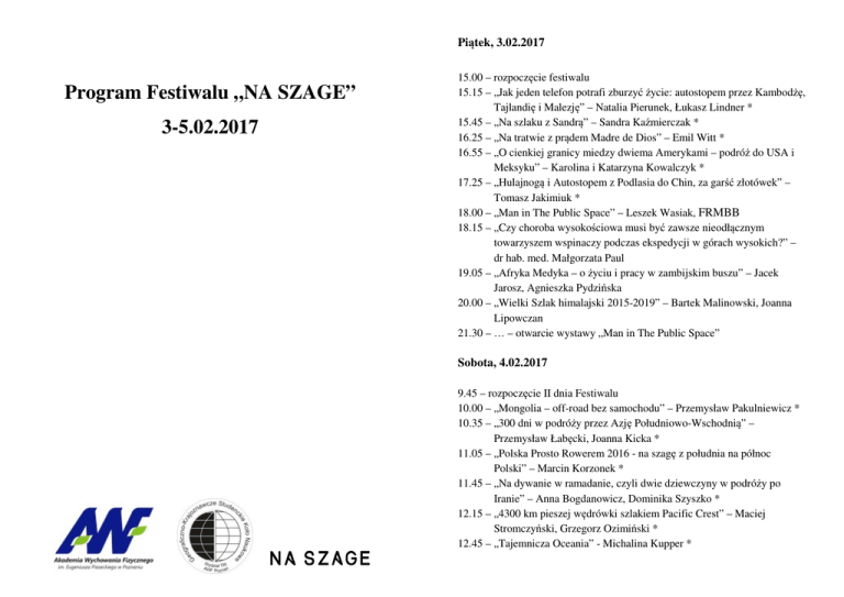 Piątek, 3.02.2017 Program Festiwalu „NA SZAGE” 3-5.02.2017 15.00 – rozpoczęcie festiwalu 15.15 – „Jak jeden telefon potrafi zburzyć życie: autostopem przez Kambodżę, Tajlandię i Malezję” – Natalia Pierunek, Łukasz Lindner * 15.45 – „Na szlaku z Sandrą” – Sandra Kaźmierczak * 16.25 – „Na tratwie z prądem Madre de Dios” – Emil Witt * 16.55 – „O cienkiej granicy miedzy dwiema Amerykami – podróż do USA i Meksyku” – Karolina i Katarzyna Kowalczyk * 17.25 – „Hulajnogą i Autostopem z Podlasia do Chin, za garść złotówek” – Tomasz Jakimiuk * 18.00 – „Man in The Public Space” – Leszek Wasiak, FRMBB 18.15 – „Czy choroba wysokościowa musi być zawsze nieodłącznym towarzyszem wspinaczy podczas ekspedycji w górach wysokich?” – dr hab. med. Małgorzata Paul 19.05 – „Afryka Medyka – o życiu i pracy w zambijskim buszu” – Jacek Jarosz, Agnieszka Pydzińska 20.00 – „Wielki Szlak himalajski 2015-2019” – Bartek Malinowski, Joanna Lipowczan 21.30 – … – otwarcie wystawy „Man in The Public Space” Sobota, 4.02.2017 9.45 – rozpoczęcie II dnia Festiwalu 10.00 – „Mongolia – off-road bez samochodu” – Przemysław Pakulniewicz * 10.35 – „300 dni w podróży przez Azję Południowo-Wschodnią” – Przemysław Łabęcki, Joanna Kicka * 11.05 – „Polska Prosto Rowerem 2016 - na szagę z południa na północ Polski” – Marcin Korzonek * 11.45 – „Na dywanie w ramadanie, czyli dwie dziewczyny w podróży po Iranie” – Anna Bogdanowicz, Dominika Szyszko * 12.15 – „4300 km pieszej wędrówki szlakiem Pacific Crest” – Maciej Stromczyński, Grzegorz Ozimiński * 12.45 – „Tajemnicza Oceania” - Michalina Kupper * 13.20 – 14.20 – „Priwiet, Bajkał!” – Alicja i Jędrzej Łukowscy (sala warsztatowa) 13.30 – Wystąpienie. Pan Satriyo Pringgodhany, I-szy Sekretarz Ambasady Indonezji 13.45 – Film promocyjny “Wonderful Indonesia” 13.55 – Występ Zespołu Indonezyjskiego Tańca Tradycyjnego 14.05 – Reportaż filmowy „Java Jazz Festival 2016” - Jerzy Pawleta 14.40 – 16.00 – „Podróże do granic” – Robert i Joachim Czerniak (spotkanie autorskie) 15.00 – „Aktualne zagrożenia zdrowotne w międzynarodowym ruchu turystycznym” – dr Karolina Mrówka 16.10 – „Etnograficzne szlaki – Camino de Costa” – Joanna Minksztym 16.30 – 17.30 – „Podróże nieudacznika” – prof. Dariusz J. Gwiazdowicz (spotkanie autorskie) 17.20 – „Laponia – w krainie ludzi, bogów i zwierząt” – Kamila Kielar 18.00 – 20.00 – „Podwodna Indonezja” – Alicja Dramińska (warsztaty) 18.30 – „Hajastan i Arcach – w cieniu Araratu” – Konrad, Beata, Mikołaj Tulej 19.40 – „Sudan Południowy – to nie jest smutne miejsce” – Piotr Horzela 21.30 – … – spotkanie w klubie festiwalowym TROPS Występ Zespołu Indonezyjskiego Tańca Tradycyjnego oraz pokazy tańców z różnych rejonów świata w wykonaniu Zespołu Tanecznego DreamLadies Niedziela, 5.02.2017 10.30– rozpoczęcie III dnia Festiwalu 10.45 – „Aventura, autostopem przez Amerykę Środkową i Południową” – Wojciech Malicha, Sebastian Hennig 11.30 – 13.30 – „Malowane światłem – praktyczne porady eksperta jak wykonać dobrą fotografię” – Danuta Witkowska (warsztaty) 11.40 – „Dos Gringos śladami Majów” – Jan Kurzela, Alicja Kubiak 12.50 – „Nepal – krótka historia o kiwaniu głową” – Ryszard Bogusław 13.00 – 14.00 – „Praktycznie wszystko o podróżowaniu Koleją Transsyberyjską” – Alicja i Jędrzej Łukowscy, Małgorzata Ciepła (warsztaty) 14.00 – „Oman – na rowerze oślimi ścieżkami” – Jan Piętek, Marzena Badziak 14.15 – 15.15 – „Oczami Dos Gringos” – Jan Kurzela, Alicja Kubiak (spotkanie autorskie) 15.10 – „Ugryźć kawałek świata – 26 krajów na 26 urodziny” – Szczepan Ligęza 16.15 – rozstrzygnięcie konkursu i wręczenie nagród 16.40 – „Nowa Gwinea - ostanie niedostępne miejsca Ziemi: Plemiona żyjące na drzewach i Piramida Carstensz'a” – Jerzy Kostrzewa 17.30 - „Maluchem przez Azję” – Arkady Paweł Fiedler 18.45 – zakończenie festiwalu Warsztaty i spotkania dla dzieci: Sobota: 11.00-12.30 – Bajka na dzień dobry „Kamishaibai” – Ula Ziober 12.45-14.15 – „Podróżuję świadomie” – Konrad, Beata, Mikołaj Tulej 14.30-15.30 – „W co się bawią dzieci na antypodach” – Michalina Kupper 16.15-17.15 – „Naszyjnik Przyjaźni – przesłanie Indian Migmagów” – Teatr Wierzbak, Artur Szych Niedziela: 10.45 – 11.45 -„Naszyjnik Przyjaźni – przesłanie Indian Migmagów” – Teatr Wierzbak, Artur Szych 12.00-13.00- „Morska opowieść – ryby, delfiny, nurkowanie …”- Elżbieta Kidacka 13.30-14.30 – Opowieść o niezwykłym podróżniku Kazimierzu Nowaku – Ula Ziober Dodatkowe atrakcje: - wystawy - książki podróżnicze - kawiarenka festiwalowa - spotkanie w klubie festiwalowym - rozmowy, opowieści, zabawa - ... * prezentacje konkursowe Program może ulec niewielkim modyfikacjom.