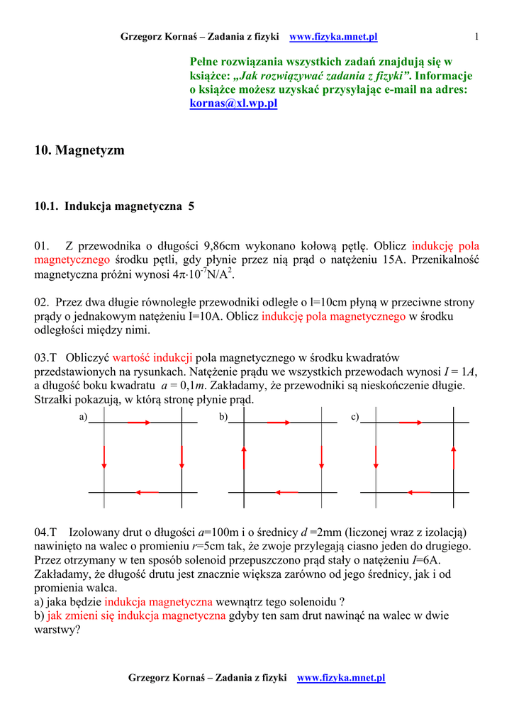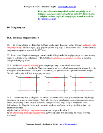 Grzegorz Kornaś – Zadania z fizyki www.fizyka.mnet.pl 1 Pełne rozwiązania wszystkich zadań znajdują się w książce: „Jak rozwiązywać zadania z fizyki”. Informacje o książce możesz uzyskać przysyłając e-mail na adres: [email protected] 10. Magnetyzm 10.1. Indukcja magnetyczna 5 01. Z przewodnika o długości 9,86cm wykonano kołową pętlę. Oblicz indukcję pola magnetycznego środku pętli, gdy płynie przez nią prąd o natężeniu 15A. Przenikalność magnetyczna próżni wynosi 4π⋅10-7N/A2. 02. Przez dwa długie równoległe przewodniki odległe o l=10cm płyną w przeciwne strony prądy o jednakowym natężeniu I=10A. Oblicz indukcję pola magnetycznego w środku odległości między nimi. 03.T Obliczyć wartość indukcji pola magnetycznego w środku kwadratów przedstawionych na rysunkach. Natężenie prądu we wszystkich przewodach wynosi I = 1A, a długość boku kwadratu a = 0,1m. Zakładamy, że przewodniki są nieskończenie długie. Strzałki pokazują, w którą stronę płynie prąd. a) b) c) 04.T Izolowany drut o długości a=100m i o średnicy d =2mm (liczonej wraz z izolacją) nawinięto na walec o promieniu r=5cm tak, że zwoje przylegają ciasno jeden do drugiego. Przez otrzymany w ten sposób solenoid przepuszczono prąd stały o natężeniu I=6A. Zakładamy, że długość drutu jest znacznie większa zarówno od jego średnicy, jak i od promienia walca. a) jaka będzie indukcja magnetyczna wewnątrz tego solenoidu ? b) jak zmieni się indukcja magnetyczna gdyby ten sam drut nawinąć na walec w dwie warstwy? Grzegorz Kornaś – Zadania z fizyki www.fizyka.mnet.pl Grzegorz Kornaś – Zadania z fizyki www.fizyka.mnet.pl 2 05. Ile zwojów powinna mieć pętla z drutu o długości 1m, aby przy natężeniu prądu 10mA wytworzyć w jej środku pole magnetyczne o natężeniu 3,14 A/m ? 10.2 Oddziaływania magnetyczne 7 01.T Przewodnik miedziany o średnicy 0,2mm ułożono prostopadle do linii pola magnetycznego. Jaka była indukcja magnetyczna pola, jeżeli po podłączeniu napięcia 12V na przewodnik zaczęła działać siła 2N? Opór właściwy miedzi wynosi 0,017Ω⋅mm²/m. (Wykonaj rysunek, zaznacz kierunek prądu oraz wektor siły działających na pręt). B 02.T Oblicz maksymalny wypadkowy moment siły działający na prostokątną ramkę o powierzchni 200cm2, gdy płynie przez nią prąd o natężeniu 1A. Ramka umieszczona jest w polu magnetycznym o indukcji 10T zwróconym pionowo w dół. Zaznacz na rysunku wektory sił. A C D + B - 03.T W polu magnetycznym prostopadle do kierunku indukcji magnetycznej B umieszczono miedziany przewodnik o długości l=0,1 m i masie m=10g zawieszony na dwóch elastycznych miedzianych drucikach. Oblicz ile wynosi wartość indukcji magnetycznej B jeżeli w trakcie przepływu prądu druciki odchyliły się od pionu o 10stopni, przepływający prąd miał natężenie I=2A, masę drucików zaniedbujemy. 04.T Proton poruszający się z szybkością v=105m/s wpada w jednorodne pole magnetyczne o indukcji B=0,4T pod kątem α=450 do kierunku wektora indukcji magnetycznej B . Oblicz promień i skok śruby, po której będzie się poruszał proton. 05. Z jaką szybkością porusza się proton, jeżeli bez odchylenia od swojego pierwotnego kierunku przechodzi przez układ wzajemnie prostopadłych pól: magnetycznego o indukcji B=4T i elektrycznegoo natężeniu E=103V/m. Proton porusza się w kierunku prostopadłym zarówno do wektora E , jak i B . Wykonaj rysunek i zaznacz wektory działających sił. Grzegorz Kornaś – Zadania z fizyki www.fizyka.mnet.pl Grzegorz Kornaś – Zadania z fizyki www.fizyka.mnet.pl 3 06.T W polu magnetycznym o indukcji 0,2T umieszczono poziomo metalowy pręt o gęstości 9000kg/m3 prostopadle do linii pola, również poziomych. Oblicz natężenie prądu, który musiałby płynąć przez pręt, aby siła elektrodynamiczna zrównoważyła siłę ciężkości. Średnica pręta wynosi 2mm. Wykonaj rysunek, zaznacz kierunek prądu oraz wektory sił działających na pręt. 07.T Na równi pochyłej o kącie nachylenia α = 30° położono metalowy pręt o średnicy d=4mm. Pole magnetyczne o indukcji B = 1 T jest prostopadłe do podstawy równi i zwrócone do góry. Oblicz natężenie prądu płynącego przez pręt gdy pozostaje on w spoczynku? Gęstość metalu wynosi ρ = 9000 B kg . Na m3 rysunku zaznacz, w którą stronę płynie prąd oraz wektory działających sił. Tarcie pomijamy. α Pełne rozwiązania wszystkich zadań znajdują się w książce: „Jak rozwiązywać zadania z fizyki”. Informacje o książce możesz uzyskać przysyłając e-mail na adres: [email protected] Grzegorz Kornaś – Zadania z fizyki www.fizyka.mnet.pl