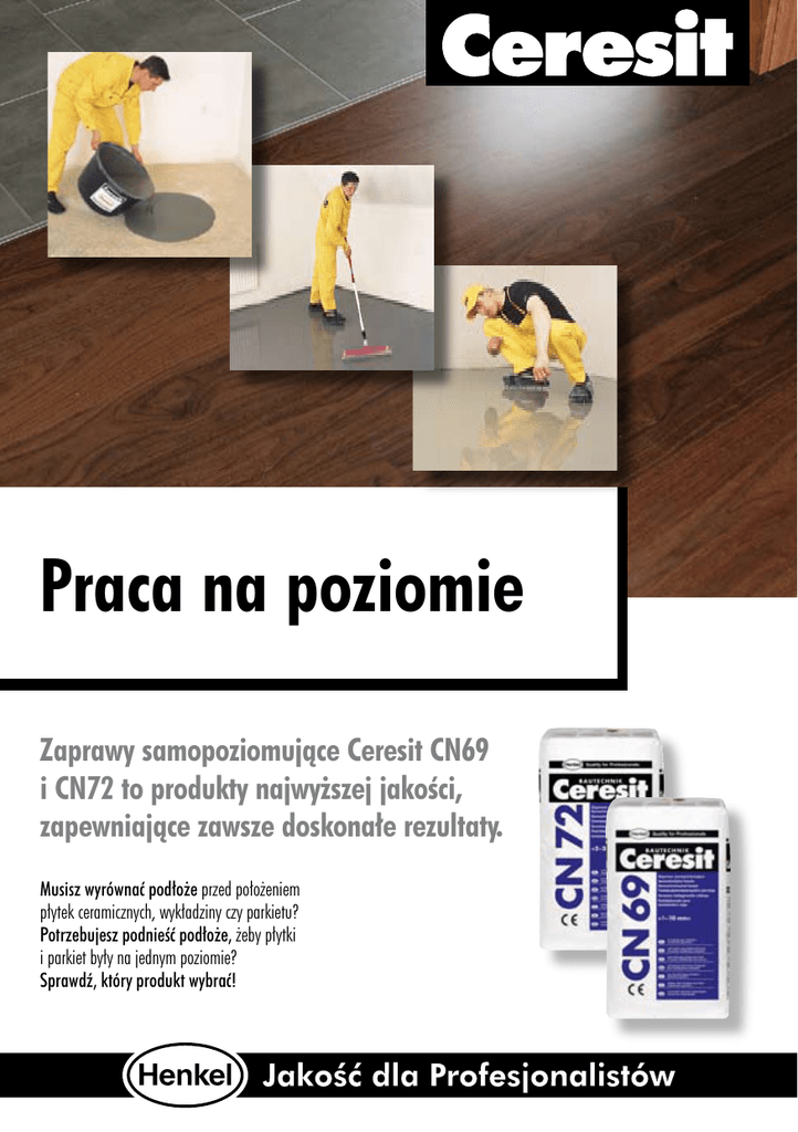 Praca na poziomie Zaprawy samopoziomujące Ceresit CN69 i CN72 to produkty najwyższej jakości, zapewniające zawsze doskonałe rezultaty. Musisz wyrównać podłoże przed położeniem płytek ceramicznych, wykładziny czy parkietu? Potrzebujesz podnieść podłoże, żeby płytki i parkiet były na jednym poziomie? Sprawdź, który produkt wybrać! Zaprawy samopoziomujące Ceresit CN69 i CN72 •CN72 to produkt najwyższej klasy, zaprojektowany z myślą o najbardziej wymagających podłożach. •CN69 to produkt ekonomiczny, zaprojektowany jako podstawowa masa samopoziomująca. Warstwa wierzchnia Wybrane parametry techniczne i zastosowania: CN72 CN69 płytki ceramiczne Tak Tak panele podłogowe Tak Tak wykładziny Tak Tak parkiet (małe elementy, np. mozaika, klepka) Tak Nie Jako warstwa ostateczna (posadzka użytkowa w garażach, warsztatach, magazynach) Tak Nie Do wyrównywania schodów Zakres stosowania [mm] Na konstrukcje z ogrzewaniem podłogowym Orientacyjne zużycie na m2 przy grubości 3 mm przy grubości 5 mm przy grubości 10 mm Ruch pieszy po czasie* Tak Nie 2-20 1-10 Tak Tak 4,8 kg 4,5 kg 8 kg 7,5 kg 16 kg 15 kg 3 godziny 6 godzin Mocowanie płytek ceramicznych po czasie* 24 godziny 24 godziny Odporna na skupione obciążenia użytkowe (krzesła i inne meble na kółkach) Tak Tak Możliwość wylewania maszynowego Tak Tak * Dane odnoszą się do temperatury +23 °C oraz wilgotności względnej powietrza 50%. Nie zapomnij o zagruntowaniu podłoża! Zagruntowanie podłoża poprawia rozpływ wylewek, zapobiega odciąganiu wody z zaprawy i pojawianiu się na jej powierzchni pęcherzyków powietrza. Do tradycyjnych, nasiąkliwych podłoży (jastrych cementowy, beton) polecamy grunt CT17. Orientacyjne zużycie przy stosowaniu przed wylaniem mas CN 0,1-0,5 l/m2. Henkel Polska Sp. z o.o., ul. Domaniewska 41, 02-672 Warszawa, Centralny Dział Obsługi Klienta:, tel.: 041 / 37 10 100, fax: 041 / 37 42 222, infolinia: 0 800 120 241, www.ceresit.pl