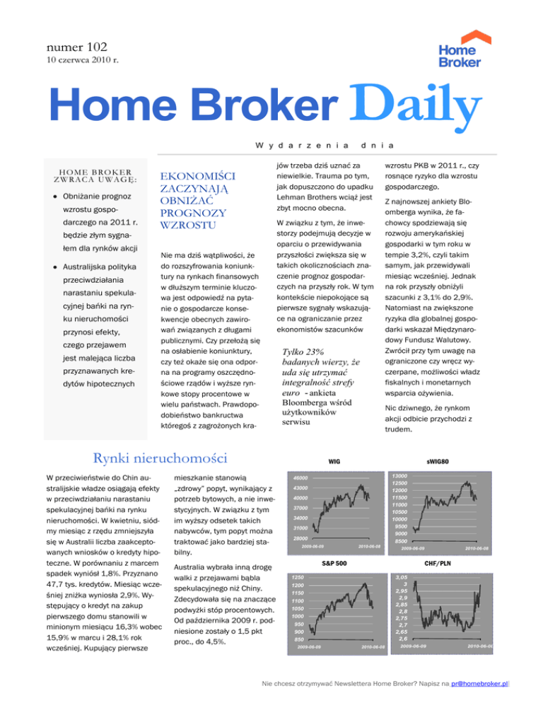 numer 102 10 czerwca 2010 r. Home Broker Daily W y d a r z e n i a HO M E B RO K E R Z W RA CA U W A G Ę : Obniżanie prognoz wzrostu gospodarczego na 2011 r. będzie złym sygnałem dla rynków akcji Australijska polityka przeciwdziałania narastaniu spekulacyjnej bańki na rynku nieruchomości przynosi efekty, czego przejawem jest malejąca liczba przyznawanych kredytów hipotecznych jów trzeba dziś uznać za niewielkie. Trauma po tym, jak dopuszczono do upadku Lehman Brothers wciąż jest zbyt mocno obecna. EKONOMIŚCI ZACZYNAJĄ OBNIŻAĆ PROGNOZY WZROSTU W związku z tym, że inwestorzy podejmują decyzje w oparciu o przewidywania przyszłości zwiększa się w takich okolicznościach znaczenie prognoz gospodarczych na przyszły rok. W tym kontekście niepokojące są pierwsze sygnały wskazujące na ograniczanie przez ekonomistów szacunków Nie ma dziś wątpliwości, że do rozszyfrowania koniunktury na rynkach finansowych w dłuższym terminie kluczowa jest odpowiedź na pytanie o gospodarcze konsekwencje obecnych zawirowań związanych z długami publicznymi. Czy przełożą się na osłabienie koniunktury, czy też okaże się ona odporna na programy oszczędnościowe rządów i wyższe rynkowe stopy procentowe w wielu państwach. Prawdopodobieństwo bankructwa któregoś z zagrożonych kra- Tylko 23% badanych wierzy, że uda się utrzymać integralność strefy euro - ankieta Bloomberga wśród użytkowników serwisu Rynki nieruchomości W przeciwieństwie do Chin australijskie władze osiągają efekty w przeciwdziałaniu narastaniu spekulacyjnej bańki na rynku nieruchomości. W kwietniu, siódmy miesiąc z rzędu zmniejszyła się w Australii liczba zaakceptowanych wniosków o kredyty hipoteczne. W porównaniu z marcem spadek wyniósł 1,8%. Przyznano 47,7 tys. kredytów. Miesiąc wcześniej zniżka wyniosła 2,9%. Występujący o kredyt na zakup pierwszego domu stanowili w minionym miesiącu 16,3% wobec 15,9% w marcu i 28,1% rok wcześniej. Kupujący pierwsze d n i a wzrostu PKB w 2011 r., czy rosnące ryzyko dla wzrostu gospodarczego. Z najnowszej ankiety Bloomberga wynika, że fachowcy spodziewają się rozwoju amerykańskiej gospodarki w tym roku w tempie 3,2%, czyli takim samym, jak przewidywali miesiąc wcześniej. Jednak na rok przyszły obniżyli szacunki z 3,1% do 2,9%. Natomiast na zwiększone ryzyka dla globalnej gospodarki wskazał Międzynarodowy Fundusz Walutowy. Zwrócił przy tym uwagę na ograniczone czy wręcz wyczerpane, możliwości władz fiskalnych i monetarnych wsparcia ożywienia. Nic dziwnego, że rynkom akcji odbicie przychodzi z trudem. WIG mieszkanie stanowią „zdrowy” popyt, wynikający z potrzeb bytowych, a nie inwestycyjnych. W związku z tym im wyższy odsetek takich nabywców, tym popyt można traktować jako bardziej stabilny. Australia wybrała inną drogę walki z przejawami bąbla spekulacyjnego niż Chiny. Zdecydowała się na znaczące podwyżki stóp procentowych. Od października 2009 r. podniesione zostały o 1,5 pkt proc., do 4,5%. sWIG80 46000 43000 40000 37000 34000 31000 28000 2009-06-09 2010-06-08 13000 12500 12000 11500 11000 10500 10000 9500 9000 8500 2009-06-09 S&P 500 CHF/PLN 1250 1200 1150 1100 3,05 3 2,95 2,9 2,85 2,8 2,75 2,7 2,65 2,6 1050 1000 950 900 850 2009-06-09 2010-06-08 2010-06-08 2009-06-09 2010-06-08 Nie chcesz otrzymywać Newslettera Home Broker? Napisz na [email protected]