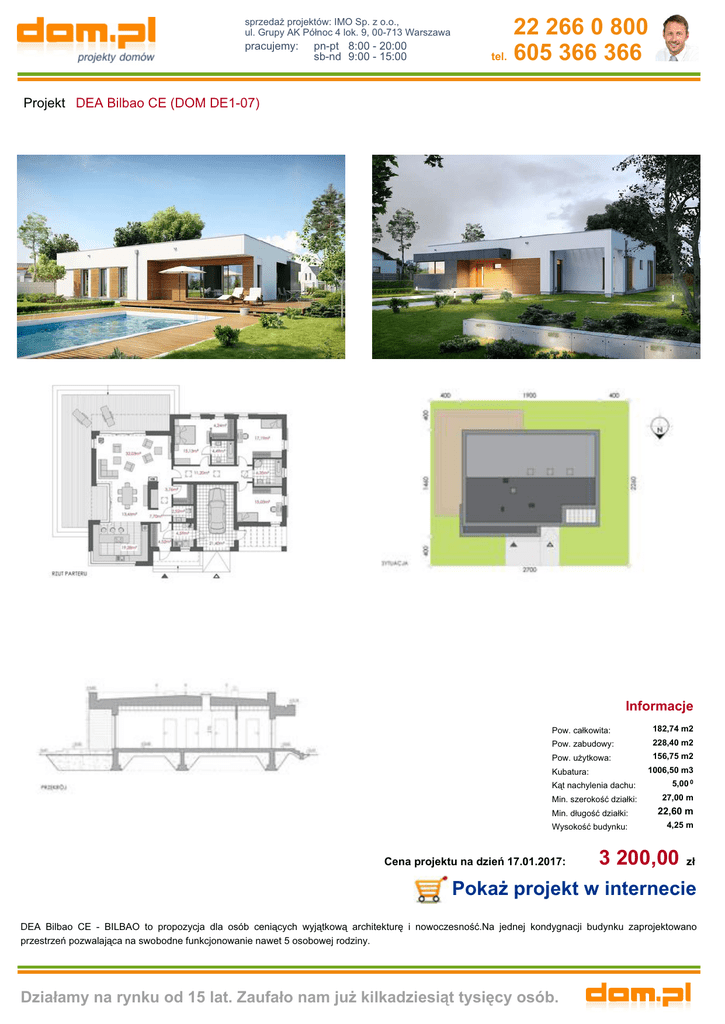 sprzedaż projektów: IMO Sp. z o.o., ul. Grupy AK Północ 4 lok. 9, 00-713 Warszawa pracujemy: pn-pt 8:00 - 20:00 sb-nd 9:00 - 15:00 22 266 0 800 tel. 605 366 366 Projekt DEA Bilbao CE (DOM DE1-07) Informacje Pow. całkowita: 182,74 m2 Pow. zabudowy: 228,40 m2 Pow. użytkowa: 156,75 m2 1006,50 m3 Kubatura: Kąt nachylenia dachu: 5,00 0 Min. szerokość działki: 27,00 m Min. długość działki: 22,60 m Wysokość budynku: 4,25 m Cena projektu na dzień 17.01.2017: 3 200,00 zł Pokaż projekt w internecie DEA Bilbao CE - BILBAO to propozycja dla osób ceniących wyjątkową architekturę i nowoczesność.Na jednej kondygnacji budynku zaprojektowano przestrzeń pozwalająca na swobodne funkcjonowanie nawet 5 osobowej rodziny. Działamy na rynku od 15 lat. Zaufało nam już kilkadziesiąt tysięcy osób.