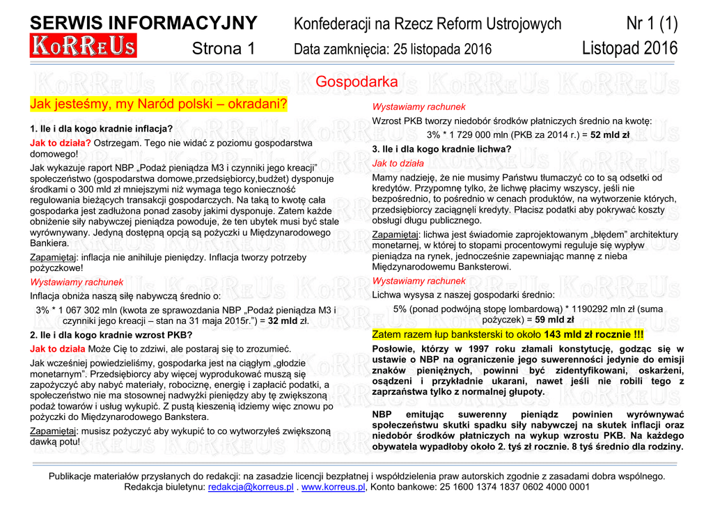 SERWIS INFORMACYJNY Strona 1 Konfederacji na Rzecz Reform Ustrojowych Data zamknięcia: 25 listopada 2016 Nr 1 (1) Listopad 2016 Gospodarka Jak jesteśmy, my Naród polski – okradani? Wystawiamy rachunek 1. Ile i dla kogo kradnie inflacja? Wzrost PKB tworzy niedobór środków płatniczych średnio na kwotę: 3% * 1 729 000 mln (PKB za 2014 r.) = 52 mld zł Jak to działa? Ostrzegam. Tego nie widać z poziomu gospodarstwa domowego! Jak wykazuje raport NBP „Podaż pieniądza M3 i czynniki jego kreacji” społeczeństwo (gospodarstwa domowe,przedsiębiorcy,budżet) dysponuje środkami o 300 mld zł mniejszymi niż wymaga tego konieczność regulowania bieżących transakcji gospodarczych. Na taką to kwotę cała gospodarka jest zadłużona ponad zasoby jakimi dysponuje. Zatem każde obniżenie siły nabywczej pieniądza powoduje, że ten ubytek musi być stale wyrównywany. Jedyną dostępną opcją są pożyczki u Międzynarodowego Bankiera. 3. Ile i dla kogo kradnie lichwa? Jak to działa Mamy nadzieję, że nie musimy Państwu tłumaczyć co to są odsetki od kredytów. Przypomnę tylko, że lichwę płacimy wszyscy, jeśli nie bezpośrednio, to pośrednio w cenach produktów, na wytworzenie których, przedsiębiorcy zaciągnęli kredyty. Płacisz podatki aby pokrywać koszty obsługi długu publicznego. Zapamiętaj: inflacja nie anihiluje pieniędzy. Inflacja tworzy potrzeby pożyczkowe! Zapamiętaj: lichwa jest świadomie zaprojektowanym „błędem” architektury monetarnej, w której to stopami procentowymi reguluje się wypływ pieniądza na rynek, jednocześnie zapewniając mannę z nieba Międzynarodowemu Banksterowi. Wystawiamy rachunek Wystawiamy rachunek Inflacja obniża naszą siłę nabywczą średnio o: Lichwa wysysa z naszej gospodarki średnio: 5% (ponad podwójną stopę lombardową) * 1190292 mln zł (suma pożyczek) = 59 mld zł 3% * 1 067 302 mln (kwota ze sprawozdania NBP „Podaż pieniądza M3 i czynniki jego kreacji – stan na 31 maja 2015r.”) = 32 mld zł. 2. Ile i dla kogo kradnie wzrost PKB? Jak to działa Może Cię to zdziwi, ale postaraj się to zrozumieć. Jak wcześniej powiedzieliśmy, gospodarka jest na ciągłym „głodzie monetarnym”. Przedsiębiorcy aby więcej wyprodukować muszą się zapożyczyć aby nabyć materiały, robociznę, energię i zapłacić podatki, a społeczeństwo nie ma stosownej nadwyżki pieniędzy aby tę zwiększoną podaż towarów i usług wykupić. Z pustą kieszenią idziemy więc znowu po pożyczki do Międzynarodowego Bankstera. Zapamiętaj: musisz pożyczyć aby wykupić to co wytworzyłeś zwiększoną dawką potu! Zatem razem łup banksterski to około 143 mld zł rocznie !!! Posłowie, którzy w 1997 roku złamali konstytucję, godząc się w ustawie o NBP na ograniczenie jego suwerenności jedynie do emisji znaków pieniężnych, powinni być zidentyfikowani, oskarżeni, osądzeni i przykładnie ukarani, nawet jeśli nie robili tego z zaprzaństwa tylko z normalnej głupoty. NBP emitując suwerenny pieniądz powinien wyrównywać społeczeństwu skutki spadku siły nabywczej na skutek inflacji oraz niedobór środków płatniczych na wykup wzrostu PKB. Na każdego obywatela wypadłoby około 2. tyś zł rocznie. 8 tyś średnio dla rodziny. Publikacje materiałów przysłanych do redakcji: na zasadzie licencji bezpłatnej i współdzielenia praw autorskich zgodnie z zasadami dobra wspólnego. Redakcja biuletynu: [email protected] . www.korreus.pl, Konto bankowe: 25 1600 1374 1837 0602 4000 0001 SERWIS INFORMACYJNY Strona 2 Konfederacji na Rzecz Reform Ustrojowych Data zamknięcia: 25 listopada 2016 Geologiczny kij i geologiczna marchewka. ..czyli pisowska metoda na biedaszyby... No i zobaczcie Państwo, rząd już nie kryje, że jesteśmy krajem bogatym w złoża naturalne! Resort Środowiska wrzucił do sieci zupełnie za darmo pięć tysięcy map cyfrowych złóż geologicznych Polski. Jesteśmy pierwszym krajem na świecie, który taki ekshibicjonizm robi.Pisowski Rząd już się nawet nie kryje z tym, że do kontrolowania gojów nad Wisłą sa wyznaczone kolejne słuzby - tym razem geologiczne! Jestem zdumiony, naiwnością ludzi, którzy są święcie przekonani, że Polska w rękach PiS-u jest niezależna, suwerenna, wolna, święta i takie tam bla bla bla... I żeby sobie tylko jaki polski goj nie myślał, że skorzysta na tym. Ja wiem, niektórym to rozgrzeje czerepy do czerwoności i może w napadzie gorączki złota zakupić szpadle, wiadra i heja, mając mapy Nr 1 (1) Listopad 2016 złóż będzie sobie grzebał do woli w celu szybkiego wzbogacenia się. Hola hola panowie... Pan minister Szyszko postanowił powołać do służby Żandarmerię Geologiczną (niedługo w ilości służb mundurowych przebijemy Włochów), a dosłownie Polską Służbę Geologiczną, która będzie wyposażona w "akcesoria", które używane są w Policji, funkcjonariusze będą mieli prawo do „noszenia broni palnej długiej i krótkiej, kajdanek zakładanych na ręce, pałki służbowej, ręcznego miotacza substancji obezwładniających oraz przedmiotów przeznaczonych do obezwładniania osób za pomocą energii elektrycznej” "Pytanie, po co nowej służbie karabiny? Zdaniem resortu środowiska „w poszczególnych państwach na świecie, zwłaszcza tych dysponujących bogatymi zasobami geologicznymi i czerpiących duże korzyści z ich eksploatacji, istnieją bardzo rozbudowane służby państwowe zajmujące się zabezpieczaniem interesów państwa w dokumentowaniu, ochronie i wydobywaniu tych zasobów”. A zatem - mamy bogate złoża geologiczne, ale żebyśmy nie mogli "czerpać dużych korzyści z ich eksploatacji" - rząd postawi strażników! Zachodzi zatem pytanie - kto będzie czerpał korzyści z ich eksploatacji? I tu należy słusznie powołać się na słowa Super Wicemistera Morawieckiego "otworzymy szeroko nasze drzwi i serca dla kapitału zagranicznego"!. Kto czyta - niech rozumie! Źródło: ht
