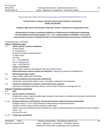 Dz.U./S S213 04/11/2015 387539-2015-PL Państwa członkowskie - Zamówienie publiczne na usługi - Ogłoszenie o zamówieniu - Procedura otwarta 1/3 Niniejsze ogłoszenie w witrynie TED: http://ted.europa.eu/udl?uri=TED:NOTICE:387539-2015:TEXT:PL:HTML Polska-Gryfice: Usługi w zakresie publicznego transportu drogowego 2015/S 213-387539 Wstępne ogłoszenie informacyjne dotyczące umowy o świadczenie usług publicznych Standardowy formularz na potrzeby publikacji w Suplemencie do Dziennika Urzędowego Unii Europejskiej informacji zgodnie z art. 7 ust. 2 rozporządzenia 1370/2007 na rok przed rozpoczęciem procedury przetargowej lub rok przed bezpośrednim przyznaniem zamówienia. Rozporządzenia nr 1370/2007 Sekcja I: Właściwy organ I.1) Nazwa, adresy i punkty kontaktowe Powiat Gryficki pl. Zwycięstwa 37 Osoba do kontaktów: Rafał Salomon 72-300 Gryfice POLSKA Tel.: +48 913842056 E-mail: [email protected] Faks: +48 913842731 Adresy internetowe: Ogólny adres instytucji zamawiającej: http://spow.gryfice.ibip.pl Więcej informacji można uzyskać pod adresem: Powyższy(-e) punkt(-y) kontaktowy(-e) I.2) Rodzaj właściwego organu Organ władzy regionalnej lub lokalnej I.3) Główny przedmiot lub przedmioty działalności Usługi kolei miejskiej/kolei lekkiej, metra, tramwajów, trolejbusów lub autobusów I.4) Udzielenie zamówienia w imieniu innych właściwych organów Instytucja zamawiająca dokonuje zakupu w imieniu innych instytucji zamawiających: nie Sekcja II: Przedmiot zamówienia II.1) Opis II.1.1) Nazwa nadana zamówieniu: Świadczenie usług w zakresie publicznego transportu zbiorowego o charakterze użyteczności publicznej na terenie Powiatu Gryfickiego. II.1.2) Rodzaj zamówienia, dziedzina(-y), której(-ych) dotyczą usługi transportu publicznego Kategoria usług: nr T-05: Usługi transportu autobusowego (miejskie/regionalne) Dziedziny, których dotyczą usługi transportu publicznego Główne miejsce lub lokalizacja robót budowlanych, miejsce realizacji dostawy lub świadczenia usług: Kategoria usług: T-05. Kod NUTS PL425 II.1.3) Krótki opis zamówienia 04/11/2015 S213 http://ted.europa.eu/TED Państwa członkowskie - Zamówienie publiczne na usługi - Ogłoszenie o zamówieniu - Procedura otwarta Suplement do Dziennika Urzędowego Unii Europejskiej 1/3 Dz.U./S S213 04/11/2015 387539-2015-PL Państwa członkowskie - Zamówienie publiczne na usługi - Ogłoszenie o zamówieniu - Procedura otwarta 2/3 Udzielenie koncesji na świadczenie usług użyteczności publicznej w zakresie wykonywania drogowych przewozów pasażerskich organizowanych przez Powiat Gryficki. II.1.4) Wspólny Słownik Zamówień (CPV) 60112000 II.1.5) Informacje na temat podwykonawstwa Przewidywane jest zlecenie podwykonawstwa: nie II.2) Ilość i/lub wartość usług: II.3) Planowana data rozpoczęcia i czas trwania zamówienia lub termin realizacji Rozpoczęcie: 1.1.2017 Okres w miesiącach: 60 (od udzielenia zamówienia) II.4) Krótki opis rodzaju i zakresu robót budowlanych Sekcja IV: Procedura IV.1) Rodzaj procedury Otwarta IV.2) Kryteria udzielenia zamówienia IV.2.1) Kryteria udzielenia zamówienia IV.2.2) Informacje na temat aukcji elektronicznej Wykorzystana będzie aukcja elektroniczna: nie IV.3) Informacje administracyjne IV.3.1) Numer referencyjny: KTiDP.7140.2.2015.RS IV.3.2) Warunki uzyskania specyfikacji i dokumentów dodatkowych IV.3.3) Termin składania ofert lub wniosków o dopuszczenie do udziału w postępowaniu 12.12.2016 IV.3.4) Języki, w których można sporządzać oferty lub wnioski o dopuszczenie do udziału w postępowaniu polski. IV.3.5) Minimalny okres, w którym oferent będzie związany ofertą IV.3.6) Warunki otwarcia ofert Sekcja VI: Informacje uzupełniające VI.1) Informacje dodatkowe: Na podstawie art. 23 ust. 5 ustawy z 16.12.2010 o publicznym transporcie zbiorowym (Dz. z 2011 r., Nr 5, poz. 13 z późn. zm.) zastrzega się możliwość zmiany powyższych informacji. VI.2) Procedury odwoławcze VI.2.1) Organ odpowiedzialny za procedury odwoławcze VI.2.2) Składanie odwołań VI.2.3) Źródło, gdzie można uzyskać informacje na temat składania odwołań VI.3) Ogłoszenie o udzieleniu zamówienia: Planowana data publikacji: 31.10.2016 04/11/2015 S213 http://ted.europa.eu/TED Państwa członkowskie - Zamówienie publiczne na usługi - Ogłoszenie o zamówieniu - Procedura otwarta Suplement do Dziennika Urzędowego Unii Europejskiej 2/3 Dz.U./S S213 04/11/2015 387539-2015-PL Państwa członkowskie - Zamówienie publiczne na usługi - Ogłoszenie o zamówieniu - Procedura otwarta 3/3 Ogłoszenie o udzieleniu zamówienia zostanie opublikowane w Suplemencie do Dziennika Urzędowego Unii Europejskiej: tak VI.4) Data wysłania niniejszego ogłoszenia: 30.10.2015 04/11/2015 S213 http://ted.europa.eu/TED Państwa członkowskie - Zamówienie publiczne na usługi - Ogłoszenie o zamówieniu - Procedura otwarta Suplement do Dziennika Urzędowego Unii Europejskiej 3/3