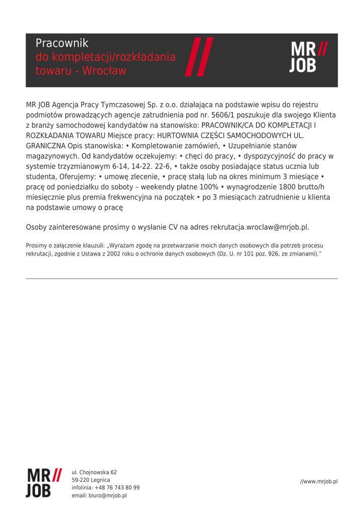 Pracownik do kompletacji/rozkładania towaru - Wrocław MR JOB Agencja Pracy Tymczasowej Sp. z o.o. działająca na podstawie wpisu do rejestru podmiotów prowadzących agencje zatrudnienia pod nr. 5606/1 poszukuje dla swojego Klienta z branży samochodowej kandydatów na stanowisko: PRACOWNIK/CA DO KOMPLETACJI I ROZKŁADANIA TOWARU Miejsce pracy: HURTOWNIA CZĘŚCI SAMOCHODOWYCH UL. GRANICZNA Opis stanowiska: • Kompletowanie zamówień, • Uzupełnianie stanów magazynowych. Od kandydatów oczekujemy: • chęci do pracy, • dyspozycyjność do pracy w systemie trzyzmianowym 6-14, 14-22. 22-6, • także osoby posiadające status ucznia lub studenta, Oferujemy: • umowę zlecenie, • pracę stałą lub na okres minimum 3 miesiące • pracę od poniedziałku do soboty – weekendy płatne 100% • wynagrodzenie 1800 brutto/h miesięcznie plus premia frekwencyjna na początek • po 3 miesiącach zatrudnienie u klienta na podstawie umowy o pracę Osoby zainteresowane prosimy o wysłanie CV na adres [email protected]. Prosimy o załączenie klauzuli: „Wyrażam zgodę na przetwarzanie moich danych osobowych dla potrzeb procesu rekrutacji, zgodnie z Ustawa z 2002 roku o ochronie danych osobowych (Dz. U. nr 101 poz. 926, ze zmianami).” ul. Chojnowska 62 59-220 Legnica infolinia: +48 76 743 80 99 email: [email protected] //www.mrjob.pl