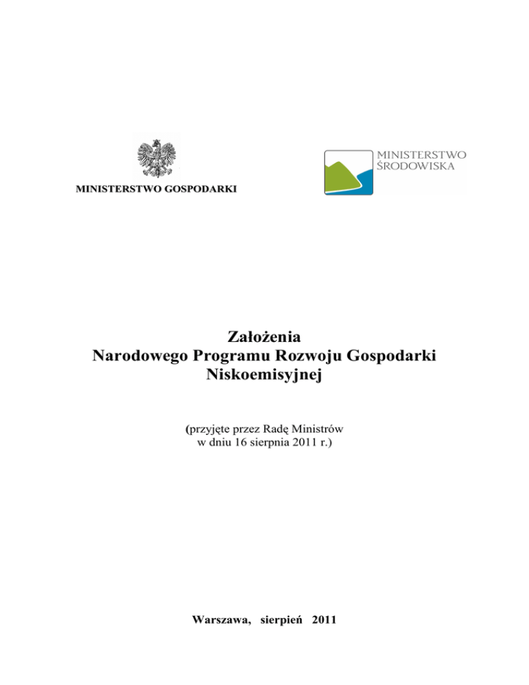 MINISTERSTWO GOSPODARKI ZałoŜenia Narodowego Programu Rozwoju Gospodarki Niskoemisyjnej (przyjęte przez Radę Ministrów w dniu 16 sierpnia 2011 r.) Warszawa, sierpień 2011 Spis treści 1. Wprowadzenie .............................................................................................................. 5 2. Uzasadnienie ................................................................................................................. 6 3. Spójność z innymi strategicznymi i programowymi dokumentami ....................... 9 4. Diagnoza sytuacji w Polsce w zakresie emisji gazów cieplarnianych.................... 10 5. Cele NPRGN ............................................................................................................... 11 6. 5.1. Cel główny ........................................................................................................... 11 5.2. Cele szczegółowe ................................................................................................. 12 Obszary działania NPRGN........................................................................................ 15 7. Priorytety .................................................................................................................... 15 8. Działania...................................................................................................................... 16 9. Źródła finansowania NPRGN ................................................................................... 17 10. Monitorowanie i ocena stopnia osiągnięcia celu...................................................... 18 11. Tryb prac nad przygotowaniem NPRGN ................................................................ 18 12. Proponowana struktura NPRGN ............................................................................. 18 1. Wprowadzenie Opracowanie Narodowego Programu Rozwoju Gospodarki Niskoemisyjnej (NPRGN) wynika z potrzeby przestawienia gospodarki na gospodarkę niskoemisyjną. Takie podejście ma głębokie uzasadnienie merytoryczne, z jednej strony odpowiada na wyzwania związane ze zmianą klimatu, z drugiej zaś pozwala na stworzenie, w dłuŜszej perspektywie, optymalnego modelu nowoczesnej materiało- i energooszczędnej gospodarki zorientowanej na innowacyjność i zdolną do konkurencji na europejskim i globalnym rynku. Działaniem takim objęta będzie cała gospodarka przy zaangaŜowaniu wszystkich jej sektorów. Jednym z wymiernych efektów tej transformacji będzie osiągnięcie efektu redukcyjnego emisji gazów cieplarnianych i innych substancji1, które powiązane będzie z racjonalnym wydatkowaniem środków. Istotą Programu jest zapewnienie korzyści ekonomicznych, społecznych i środowiskowych (zgodnie z zasadą zrównowaŜonego rozwoju) płynących z działań zmniejszających emisje, osiąganych m.in. poprzez wzrost innowacyjności i wdroŜenie nowych technologii, zmniejszenie energochłonności, utworzenie nowych miejsc pracy, a w konsekwencji sprzyjających wzrostowi konkurencyjności gospodarki w horyzoncie czasowym do 2050 r. NPRGN będzie kierowany do przedsiębiorców wszystkich sektorów gospodarki, samorządów gospodarczych i terytorialnych, organizacji otoczenia biznesu oraz organizacji pozarządowych, ale równieŜ bezpośrednio do kaŜdego obywatela RP, celem kształtowania właściwych postaw i spowodowania aktywności społecznej w tym zakresie. NPRGN będzie wskazywał priorytety i kierunki niezbędnych działań, które powinny zostać podjęte, aby nie tylko sprostać wyzwaniom związanym z osiągnięciem wymaganego poziomu emisyjności oraz uruchomieniem adekwatnych instrumentów wsparcia wspomagających te działania, ale z czasem równieŜ pozwolić czerpać Polsce korzyści z realizacji celów polityki klimatycznej. Zakłada się, Ŝe efektem końcowym NPRGN będzie zestaw działań nakierowanych bezpośrednio i pośrednio na redukcję emisji gazów cieplarnianych, a takŜe instrumentów, które wspomogą wszystkich uczestników realizacji Programu w przechodzeniu na gospodarkę niskoemisyjną. NPRGN powstanie w wyniku ścisłego współdziałania Ministerstwa Gospodarki i Ministerstwa Środowiska, oraz pozostałych resortów, które będą podmiotami współpracującymi w zakresie wynikającym z ich właściwości. Istotną rolę w pracach będzie pełnić takŜe Społeczna Rada Narodowego Programu Redukcji Emisji2 (SRNPRE). Ostateczny kształt dokumentu będzie strukturalną syntezą dokumentu opracowanego przez Ministerstwo Gospodarki i Ministerstwo Środowiska oraz dokumentów przygotowanych przez pozostałe resorty i SRNPRE. Ponadto, obok administracji państwowej, przy tworzeniu Programu współpracować będą przedstawiciele świata biznesu, instytucje naukowe, organizacje pozarządowe, w tym izby gospodarcze, związki zawodowe oraz organizacje reprezentujące inne grupy społeczne. Szerokie spektrum stron współopracowujących NPRGN zapewni transparentność powstawania dokumentu. Zakłada się, Ŝe w procesie przygotowania Programu wykorzystane zostaną wyniki zlecanych analiz dotyczących szczegółowych zagadnień. 1 2 Pod pojęciem „gazy cieplarniane i inne substancje” naleŜy mieć na względzie wykaz gazów cieplarnianych i innych substancji wprowadzanych do powietrza, objętych systemem zarządzania emisjami gazów cieplarnianych i innych substancji zgodnie z ustawą z dnia 17 lipca 2009 r. o systemie zarządzania emisjami gazów cieplarnianych i innych substancji (Dz.U. z 2009 Nr 130 poz.1070). Społeczna Rada Narodowego Programu Redukcji Emisji została powołana Zarządzeniem nr 28 Ministra Gospodarki z dnia 21 października 2009 r. 5 Zgodnie z art. 15, ust. 1 ustawy z dnia 6 grudnia 2006 r. o zasadach prowadzenia polityki rozwoju (Dz. U. z 2009 r. Nr 84, poz. 712), programy rozwoju są dokumentami o charakterze operacyjno-wdroŜeniowym, ustanawianymi w celu realizacji średniookresowej strategii rozwoju kraju oraz 