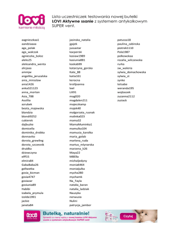 Lista uczestniczek testowania nowej butelki LOVI Aktywne ssanie z