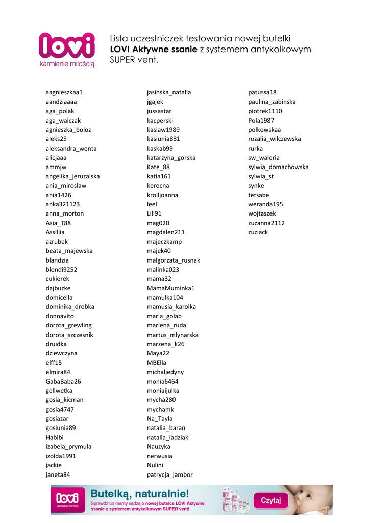 Lista uczestniczek testowania nowej butelki LOVI Aktywne ssanie z systemem antykolkowym SUPER vent. aagnieszkaa1 aandziaaaa aga_polak aga_walczak agnieszka_boloz aleks25 aleksandra_wenta alicjaaa ammjw angelika_jeruzalska ania_miroslaw ania1426 anka321123 anna_morton Asia_T88 Assillia azrubek beata_majewska blandzia blondi9252 cukierek dajbuzke domicella dominika_drobka donnavito dorota_grewling dorota_szczesnik druidka dziewczyna elff15 elmira84 GabaBaba26 gellwetka gosia_kicman gosia4747 gosiazar gosiunia89 Habibi izabela_prymula izolda1991 jackie janeta84 jasinska_natalia jgajek jussastar kacperski kasiaw1989 kasiunia881 kaskab99 katarzyna_gorska Kate_88 katia161 kerocna krolljoanna leel Lili91 mag020 magdalen211 majeczkamp majek40 malgorzata_rusnak malinka023 mama32 MamaMuminka1 mamulka104 mamusia_karolka maria_golab marlena_ruda martus_mlynarska marzena_k26 Maya22 MBElla michaljedyny monia6464 moniaijulka mycha280 mychamk Na_Tayla natalia_baran natalia_ladziak Nauzyka nerwusia Nulini patrycja_jambor patussa18 paulina_zabinska piotrek1110 Pola1987 polkowskaa rozalia_wilczewska rurka sw_waleria sylwia_domachowska sylwia_st synke tetsabe weranda195 wojtaszek zuzanna2112 zuziack